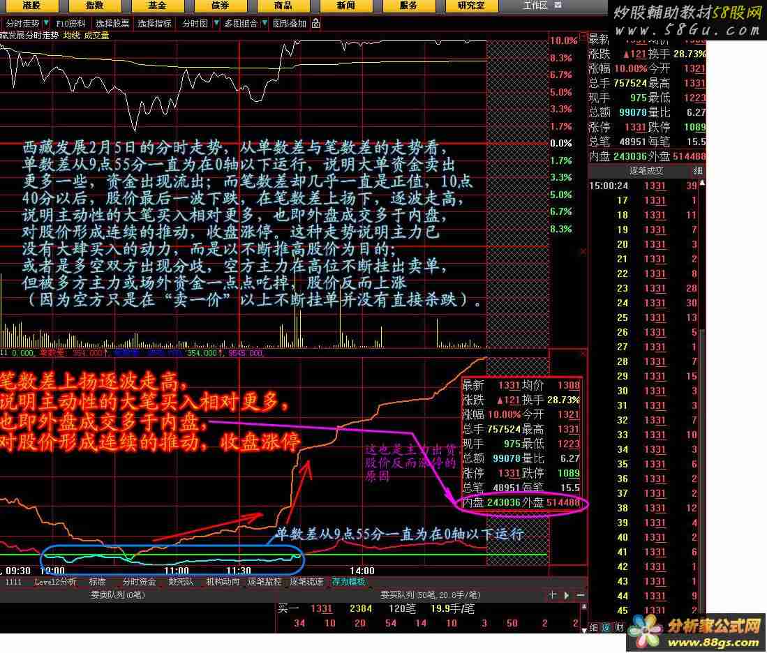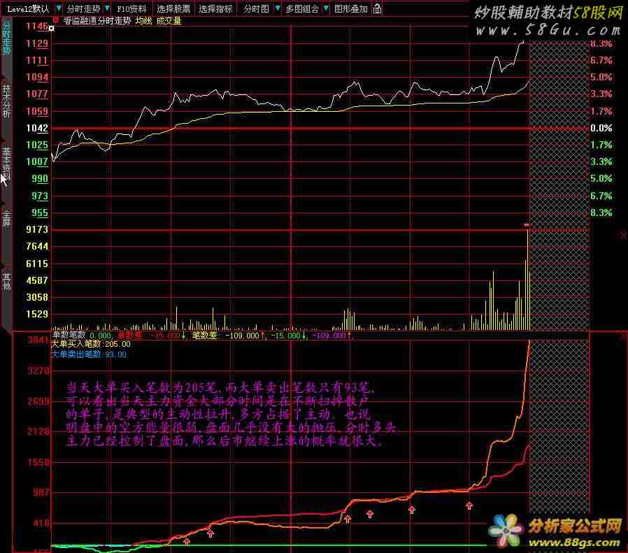 根据主动性买盘吃掉散户的笔数或者主动性卖盘释放筹码给散户的笔数,就可以大致判断出多空交战一天的结果,计算一个交易日中大单买 入笔数总和与大单卖出笔数总和的差就可以推算出。这就是笔数差的问题,即大单买入总笔数与大单卖出总笔数的差额。 当大单买入笔数远远大于小单卖出笔数时就说明当天主力资金吃掉散户的单子越多,相应上涨的潜力就越大,反之下跌的动力就越大。