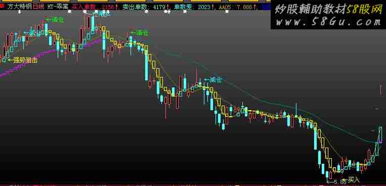 DRAWGBKLAST(CLOSE>0,STRIP(RGB(95,95,95),RGB(0,0,0),0)); TODAY:="ddx.ddx"=0;{判断是否有正版数据} 买入单:=IF(TODAY,"DDEDATA@ORDER"(1),ORDER(1)); 卖出单:=IF(TODAY,"DDEDATA@ORDER"(2),ORDER(2)); {计算} 买入单数:买入单,PRECIS0,COLOR6600FF,LINETHICK0; 卖出单数:卖出单,PRECIS0,ColorABFF46,LINETHICK0; 单数差:卖出单数-买入单数,colorCyan,PRECIS0,LINETHICK0;{卖在买先} RSV:=(CLOSE-LLV(LOW,9))/(HHV(HIGH,9)-LLV(LOW,9))*100; K:=SMA(RSV,3,1); D:=SMA(K,3,1); J:=3*K-2*D; AA05:MA(C,5),color0099cc; 五日乖离率:=(c-AA05)/AA05*100; BB05:=atan((aa05/ref(aa05,1)-1)*100)*180/3.1416; 速度5:=sma(ema((AA05-ref(AA05,1))/ref(AA05,1),3)*100,3,1); 加速度5:ema((速度5-ref(速度5,1)),3),linethick0; STICKLINE(BB05>30 and AA05>ref(AA05,1), AA05,REF(AA05,1),8,1),colorcyan; AA10:MA(C,10);AA20:=MA(c,20); BB10:=atan((aa10/ref(aa10,1)-1)*100)*180/3.1416; STICKLINE(BB05<0 and AA05<ref(AA05,1), AA05,REF(AA05,1),8,1),coloryellow; AA30:MA(C,30); 三拾日乖离率:(c-AA30)/AA30*100,linethick0; Var1:=(AA20-AA30)>ref((AA20-AA30),1) and AA20>ref(aa20,1) and AA30>ref(AA30,1); Var2:=(AA30-AA20)<ref((AA30-AA20),1) and AA20<ref(aa20,1) and AA30<ref(AA30,1); BB30:=atan((aa30/ref(aa30,1)-1)*100)*180/3.1416; STICKLINE(BB30>15 and AA30>ref(AA30,1), AA30,REF(AA30,1),8,1),colorff00ff; 强势狙击:=filter(BB30>30 and BB10>45 and cross(BB05,60),10); 加仓:=filter(count(cross(BB05,30),5)>=1 and AA05>ref(aa05,1) and 三拾日乖离率>ref(三拾日乖离率,1) and AA10>ref(AA10,1) and 加速度5>ref(加速度5,1) and 速度5>ref(速度5,1) ,10) ; 清仓:=filter(count(cross(30,BB05),5)>=1 and (c>AA30 or O>AA30) and AA05<ref(aa05,1) and 三拾日乖离率<ref(三拾日乖离率,1) and AA10<ref(AA10,1),10); drawtext(加仓 AND 单数差>50 AND J<78 ,low*0.98,'←加仓'),colorred; JC:=cross(0,五日乖离率) and 三拾日乖离率<ref(三拾日乖离率,1) and AA10>ref(AA10,1) ; 减仓:=filter(JC,10); MR:=count(cross(五日乖离率,0),3)>=1 and 三拾日乖离率>ref(三拾日乖离率,1) and AA05>ref(AA05,1) and (c/ref(c,1)-1)*100>5 and ref(c,1)<AA30; 买入:=filter(MR,10); drawtext(减仓,high*1.02,'←减仓'),colorcyan; drawtext(买入 AND 单数差>50 AND J<78 ,low*0.98,'←买入'),coloryellow; drawtext(清仓 ,high*1.02,'←清仓'),colorgreen; drawtext(强势狙击 AND 单数差>50,LOW*0.98,'←强势狙击'),coloryellow; Var21:=MAX(ABS(HIGH-AMOUNT/VOL/100),ABS(AMOUNT/VOL/100-LOW)); Var3:=ABS((OPEN+CLOSE)/2-AMOUNT/VOL/100); MV:=(Var21+Var3)/AMOUNT*VOL*100*50; DRAWTEXT(MV>6 and l<=llv(l,10),l*0.95,'←异动'),colorcyan;