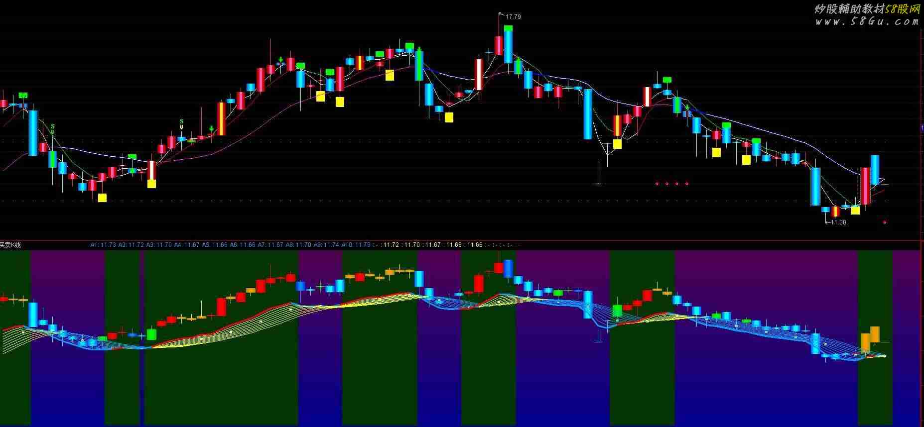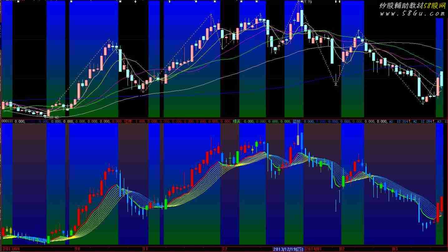 每个波段都能赚钱就是好公式机会由你自己把握.这个公式有【背景】【变色K线】【变色彩条】哪买哪卖一清二楚. 这个公式用副图显示目的就是避免K线与主图混绕.看不清买卖点.具体操作你必须配合主图判断你到底使用那个信号. 但是你目的必须清楚就是多赚钱. --------【买在低处.卖在高处】 所以公式仅仅是提醒.具体买卖还是在于你. 不会有【万无一失】【完满无缺】 其实最重要还是【人脑】 公式就是工具而已. ---------这个公式还有个缺点就是【横盘】阶段忽上忽下不好用.---------------不过此时你还是观望的好----------DRAWGBK(C,Strip(RGB(60,40,40),RGB(0,0,120),0));{------K线-----------}X1:=(2*CLOSE+LOW+HIGH+OPEN)/5;XCLOSE:=EMA(X1,3);XOPEN:=EMA((REF(OPEN,1)+REF(XCLOSE,1))/2,3);{买卖K线}STICKLINE(XOPEN>=XCLOSE,H,L,0,0 ),COLORCYAN;STICKLINE(XOPEN>=XCLOSE,C,O,6,0 ),COLOR990000;STICKLINE(XOPEN>=XCLOSE,C,O,5,0 ),COLORCC0000;STICKLINE(XOPEN>=XCLOSE,C,O,4,0 ),COLORFF4400;STICKLINE(XOPEN>=XCLOSE,C,O,3,0 ),COLORFF8800;STICKLINE(XOPEN>=XCLOSE,C,O,2,0 ),COLORFFCC00;STICKLINE(XOPEN>=XCLOSE,C,O,1,0 ),COLORCYAN;STICKLINE(XOPEN<XCLOSE,H,L,0.5,0 ),COLOR00FFFF;STICKLINE(XOPEN<XCLOSE,C,O,6,0 ),COLOR009955;STICKLINE(XOPEN<XCLOSE,C,O,5,0 ),COLOR009977; STICKLINE(XOPEN<XCLOSE,C,O,4,0 ),COLOR009999;STICKLINE(XOPEN<XCLOSE,C,O,3,0 ),COLOR0099BB;STICKLINE(XOPEN<XCLOSE,C,O,2,0 ),COLOR0099DD;STICKLINE(XOPEN<XCLOSE,C,O,1,0 ),COLOR0099FF;DRAWGBK(XOPEN<XCLOSE ,STRIP(RGB(0,0,255),RGB(0,80,0),0)),LAYER0; {-------KD波段背景------}; VAR9Q:=C= HHV(C,4)AND (REF(C,1)>=REF(C,2) OR REF(C,1)>=REF (C,3)) OR REF(C,1)=HHV(C,4) AND CLOSE>=REF(C,2) OR REF(C,2) =HHV(C,4) AND REF(C,3)=LLV(C,4) AND C>=REF(C,1) OR REF(C,3) =HHV(C,4) AND C>=REF(C,1) AND C>=REF(C,2); 红持:var9Q,color0000ff,LINETHICK0;STICKLINE(VAR9Q,H,L,0.5,0),COLOR0000FF; STICKLINE(VAR9Q,C,O,7,0),COLOR0000AA; STICKLINE(VAR9Q,C,O,6,0),COLOR0000BB; STICKLINE(VAR9Q,C,O,4,0),COLOR0000CC; STICKLINE(VAR9Q,C,O,3,0),COLOR0000DD; STICKLINE(VAR9Q,C,O,2,0),COLOR0000EE; STICKLINE(VAR9Q,C,O,1,0),COLOR0000FF; VARCQ:=REF(C,1)=LLV(C,4) AND C>=REF(C,2) OR REF(C,2)=LLV(C,4) AND REF(C,1)<=REF(C,3) AND REF(C,2)<REF(C,4) AND C>=REF(C,1); 绿买:varcQ,color00ff00,LINETHICK0; STICKLINE(VARCQ,H,L,0.5,0),COLOR00FF00; STICKLINE(VARCQ,O,C,7,0),COLOR00AA00; STICKLINE(VARCQ,O,C,6,0),COLOR00BB00; STICKLINE(VARCQ,O,C,4,0),COLOR00CC00; STICKLINE(VARCQ,O,C,3,0),COLOR00DD00; STICKLINE(VARCQ,O,C,2,0),COLOR00EE00; STICKLINE(VARCQ,O,C,1,0),COLOR00FF00; VARDQ:=REF(C,1)=HHV(C,4) AND C<REF(C,2) OR (REF(C,2)=HHV(C,4) AND REF(C,1)>REF(C,3) OR REF(C,3)=HHV(C,4) AND REF(C,1)>REF (C,2)) AND REF(C,2)>=REF(C,4) AND C<REF(C,1); 蓝抛:vardQ,colorff9900,LINETHICK0; STICKLINE(VARDQ AND C<O,H,L,0.5,0),COLORFF9900; STICKLINE(VARDQ AND C<O,O,C,7,0),COLORFF2200; STICKLINE(VARDQ AND C<O,O,C,6,0),COLORFF4400; STICKLINE(VARDQ AND C<O,O,C,4,0),COLORFF6600; STICKLINE(VARDQ AND C<O,O,C,3,0),COLORFF7700; STICKLINE(VARDQ AND C<O,O,C,2,0),COLORFF8800; STICKLINE(VARDQ AND C<O,O,C,1,0),COLORFF9900;X:=BARSLAST(DISPSTATUS=1)+1;{------创新高-----}高:=HHvall(HHv(H,X)); 跑:=高=H AND ((C-L)<(O-C) OR (O-L)<(C-O));STICKLINE(跑,C,O,8,0),COLOR555555;STICKLINE(跑,C,O,5,0),COLOR777777;STICKLINE(跑,C,O,3,0),COLORAAAAAA;STICKLINE(跑,C,O,1,0),COLORCCCCCC;STICKLINE(跑,C,O,0.5,0),COLORFFFFFF;STICKLINE(跑,L,H,0,0),COLORFFFFFF;{变色彩带}VAR1:=(2*CLOSE+HIGH+LOW)/4; A1: (EMA(VAR1,2)+EMA(VAR1,3)+EMA(VAR1,5)+EMA(VAR1,8)+EMA(VAR1,11)+EMA(VAR1,13))/6.1,COLORff9900; A2: EMA(A1,2),COLORff9900; A3: EMA(A2,2),COLORff9900; A4: EMA(A3,2),COLORff9900; A5: EMA(A4,2),COLORff9900; A6: EMA(A5,2),COLORff9900; A7: EMA(A6,2),COLORff9900; A8: EMA(A7,2),COLORff9900; A9: EMA(A8,2),COLORff9900; A10: EMA(A9,2),COLORff9900; PARTLINE(A1,A1>REF(A1,1)),COLOR0ffff0; PARTLINE(A2,A2>REF(A2,1)),COLOR0ffff0; PARTLINE(A3,A3>REF(A3,1)),COLOR0ffff0; PARTLINE(A4,A4>REF(A4,1)),COLOR0ffff0; PARTLINE(A5,A5>REF(A5,1)),COLOR0ffff0; PARTLINE(A6,A6>REF(A6,1)),COLOR0ffff0; PARTLINE(A7,A7>REF(A7,1)),COLOR0ffff0; PARTLINE(A8,A8>REF(A8,1)),COLOR0ffff0; PARTLINE(A9,A9>REF(A9,1)),COLOR0ffff0; PARTLINE(A10,A10>REF(A10,1)),COLOR0ffff0;PARTLINE(A1,A1>REF(A1,1),RGB(255,0,0),1,RGB(0,255,0)),LINETHICK2;  |