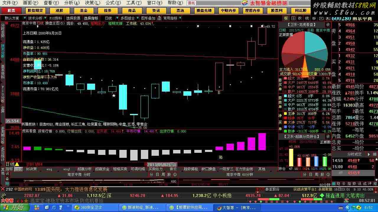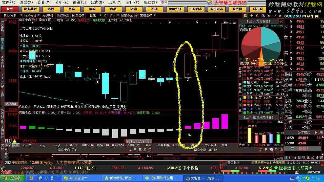 VAR1:=EMA(EMA(CLOSE,9),9); VR:=(VAR1-REF(VAR1,1))/REF(VAR1,1)*1000; STICKLINE(VR<0,VR,0,7,10),COLORCCCCCC; A10:=CROSS(VR,0); 没有行情:IF(VR<0,VR,0),COLORCCCCCC,LINETHICK0; 行情出现:IF(A10,5,0),LINETHICK0,COLOR00AAAA; DRAWTEXT(A10,-5,'起'),COLORYELLOW;STICKLINE(VR>REF(VR,1) AND VR>0,VR,0,7,10),COLOR0000AA; 主升浪:IF(VR>REF(VR,1) AND VR>0,VR,0),COLOR0000DD,LINETHICK0; VAR2:=100*WINNER(CLOSE*0.95); STICKLINE(VAR2>50 AND COST(85)<CLOSE AND VR>0,VR,0,7,10),COLOREE00EE; 牛市行情:IF(VAR2>50 AND COST(85)<CLOSE AND VR>0,VR,0),COLORFF00FF,LINETHICK0; STICKLINE(VR<REF(VR,1) AND VR>0,VR,0,7,10),COLOR00AA00; 出货行情:IF(VR<REF(VR,1) AND VR>0,VR,0),COLOR00FF00,LINETHICK0; {盖印 DRAWRECTABS(0,0,30,35,rgb(250,60,80)),color000099; DRAWRECTABS(0,30,30,45,rgb(250,250,80)),color009999; DRAWTEXTABS(2,5,'虎拓'),colorFFFFFF,LINETHICK1; DRAWTEXTABS(2,18,'经典'),colorFFFFFF,LINETHICK1; DRAWTEXTABS(2,30,'HTKP'),color0000FF,LINETHICK1;};  选股源码: VAR1:=EMA(EMA(CLOSE,9),9); VR:=(VAR1-REF(VAR1,1))/REF(VAR1,1)*1000; 起:CROSS(VR,0); |