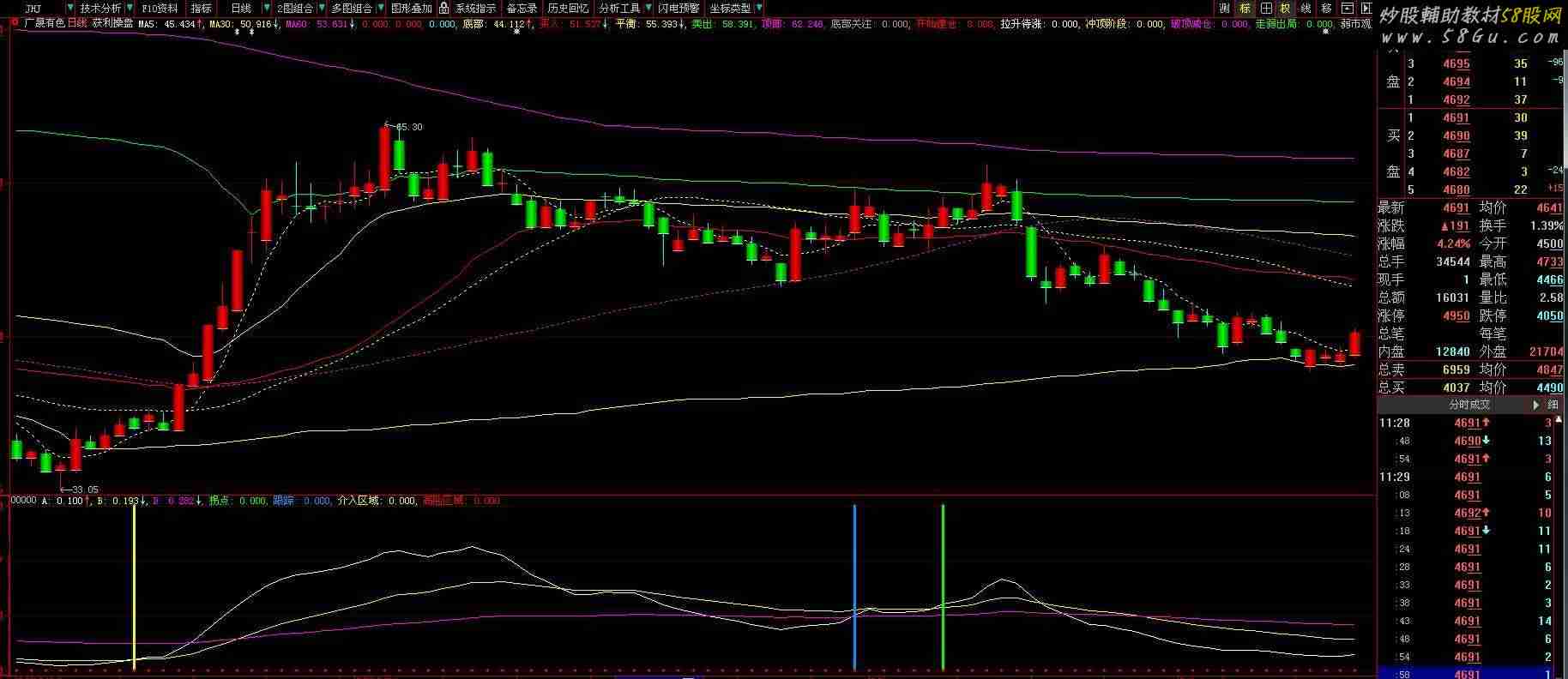 现在是的趋势【一】买---强者恒强.要吗就买【二】超跌反弹的股票 咱们就说说【二】超跌反弹的股票 A.五天均线的1.1倍还小六十天均线.B.五天均线的1.07倍还小三十天均线 C.而现在是五天均线大于昨天五天均线 D.今天涨幅大于百分之四 E今天量比大于1.5 写成源码 超跌反弹.txt 当然内容参数改不改由你.但是选股历来要人工挑选配合效果更好.就这几条通达信也可利用的.你自己试试吗.记住【获利就跑】.因为超跌反弹一定有不少助力位等着呢.莫贪.切记.切记. 用这个公式参数没变0419今天午前选出四个股票其中600259如图三根虚线是MA5.MA30.MA60.是不是超跌了.那你就看看图.不是选中明天就一定涨.而是具备了反弹的可能.起码是出现了止跌想象.不会有百分之百的赢家公式.你能够摸着门就不错了 要知道我们的股票市场那才是彻头彻尾的未来函数. {超跌反弹}MA(C,5) *1.1<MA(C,60) and MA(C,5)*1.07<MA(C,30) and REF(MA(C,5),1)<MA(C,5) AND C>REF(C,1)*1.04 AND DYNAINFO(17)>1.5; |