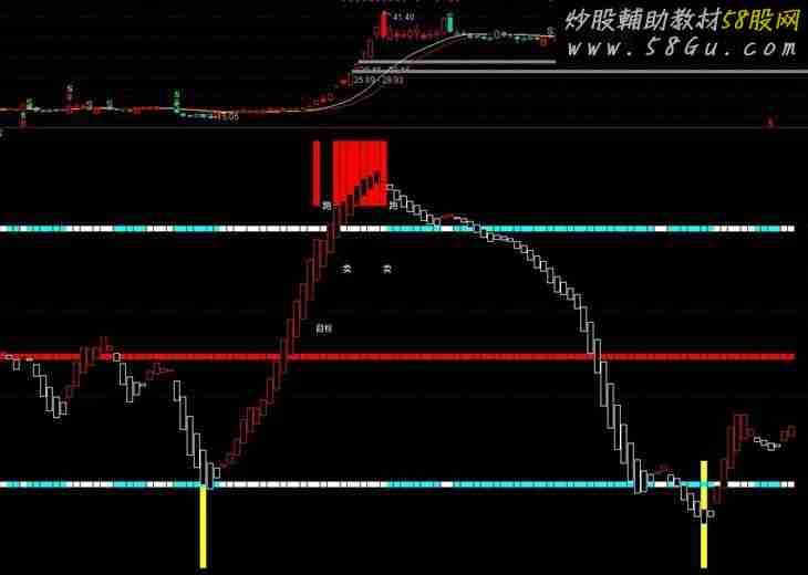 VARA:=LLV(LOW,35); VARB:=HHV(HIGH,30); VARC:=EMA((CLOSE-VARA)/(VARB-VARA)*4,4)*25; QS:= VARC,COLORWHITE; STICKLINE(VARC<10 && 100*(HHV(HIGH,14)-CLOSE)/(HHV(HIGH,14)-LLV(LOW,14))>97,0,25,3,0),COLORYELLOW;STICKLINE(VARC>90,100,85,3,0),COLORRED; VARD:=87.5; VARE:=(VARC-LLV(VARC,4))/(HHV(VARC,4)-LLV(VARC,4))*4*25; 一:=CROSS(QS,VARD) AND VARE=100; 二:=CROSS(VARD,QS); 三:=CROSS(QS,VARE) AND QS>87; DRAWTEXT(一,56,'目标'); DRAWTEXT(二,85,'跑'); DRAWTEXT(三,70,'卖'); VAR6:=(2*CLOSE+HIGH+LOW)/4; VAR8:=LLV(LOW,30); VARAA:=HHV(HIGH,30); B:=EMA((VAR6-VAR8)/(VARAA-VAR8)*100,8); B1:=EMA(B,5); STICKLINE(B>0 && B-B1>=0,79,80,3,0),COLORWHITE; STICKLINE(B>0 && B-B1<0,79,80,3,0),COLORCYAN; STICKLINE(B>0 && B-B1>=0,49,50,3,0),COLORRED; STICKLINE(B>0 && B-B1<0,49,50,3,0),COLORRED; STICKLINE(B>0 && B-B1>=0,19,20,3,0),COLORWHITE; STICKLINE(B>0 && B-B1<0,19,20,3,0),COLORCYAN; STICKLINE(B-B1>0,B,B1,3,1),COLORRED; STICKLINE(B-B1<0,B,B1,3,1),COLORWHITE;