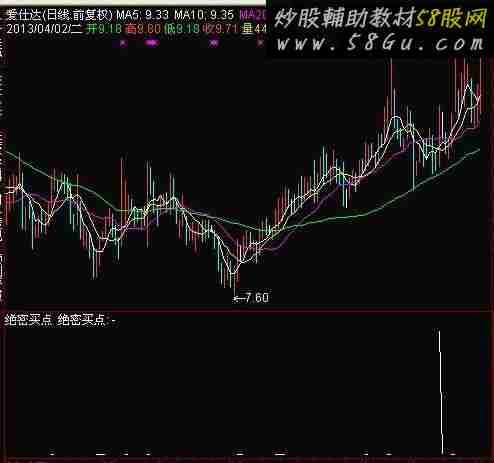 A1:=EMA(C,3),COLORWHITE; A2:=EMA(C,5),COLORYELLOW; A3:=EMA(C,7),COLORMAGENTA; A4:=EMA(C,12),COLORGREEN; A5:=EMA(C,20),COLORRED; A6:=EMA(C,50),COLORBLUE,LINETHICK2; SS:=CROSS(A1,A5) AND C>O AND C>REF(C,1) AND C/REF(C,1)>=1.018 ; CV:=CLOSE; BBIBOLL:=(MA(CV,3)+MA(CV,6)+MA(CV,12)+MA(CV,24))/4; UPR:=BBIBOLL+6*STD(BBIBOLL,11); DWN:=BBIBOLL-6*STD(BBIBOLL,11); QJJ:=VOL/((HIGH-LOW)*2-ABS(CLOSE-OPEN)); XVL:=(IF(CLOSE>OPEN,QJJ*(HIGH-LOW),IF(CLOSE<OPEN,QJJ*(HIGH-OPEN+CLOSE-LOW),VOL/2))+IF(CLOSE>OPEN,0-QJJ*(HIGH-CLOSE+OPEN-LOW),IF(CLOSE<OPEN,0-QJJ*(HIGH-LOW),0-VOL/2))); HSL:=(XVL/3)/1.15; 攻击:=((HSL*0.55+(REF(HSL,1)*0.33))+(REF(HSL,2)*0.22)); LLJX:=EMA(攻击,3); B1:=IF(SUM(LLJX,1)>REF(MA(SUM(LLJX,1),1),1),SUM(LLJX,1),DRAWNULL); B2:=IF(SUM(LLJX,2)>REF(MA(SUM(LLJX,2),1),1),SUM(LLJX,2),DRAWNULL); B3:=IF(SUM(LLJX,3)>REF(MA(SUM(LLJX,3),1),1),SUM(LLJX,3),DRAWNULL); B4:=IF(SUM(LLJX,4)>REF(MA(SUM(LLJX,4),1),1),SUM(LLJX,4),DRAWNULL); B5:=IF(SUM(LLJX,5)>REF(MA(SUM(LLJX,5),1),1),SUM(LLJX,5),DRAWNULL); B6:=IF(SUM(LLJX,6)>REF(MA(SUM(LLJX,6),1),1),SUM(LLJX,6),DRAWNULL); B7:=IF(SUM(LLJX,7)>REF(MA(SUM(LLJX,7),1),1),SUM(LLJX,7),DRAWNULL); B8:=IF(SUM(LLJX,8)>REF(MA(SUM(LLJX,8),1),1),SUM(LLJX,8),DRAWNULL); B9:=IF(SUM(LLJX,9)>REF(MA(SUM(LLJX,9),1),1),SUM(LLJX,9),DRAWNULL); B10:=IF(SUM(LLJX,10)>REF(MA(SUM(LLJX,10),1),1),SUM(LLJX,10),DRAWNULL); XG:=B1 AND B2 AND B3 AND B4 AND B5 AND B6 AND B7 AND B8 AND B9 AND B10 AND (CLOSE-OPEN)>=(UPR-BBIBOLL) AND V/REF(V,1)>=1.9; 绝密买点:ss and xg;