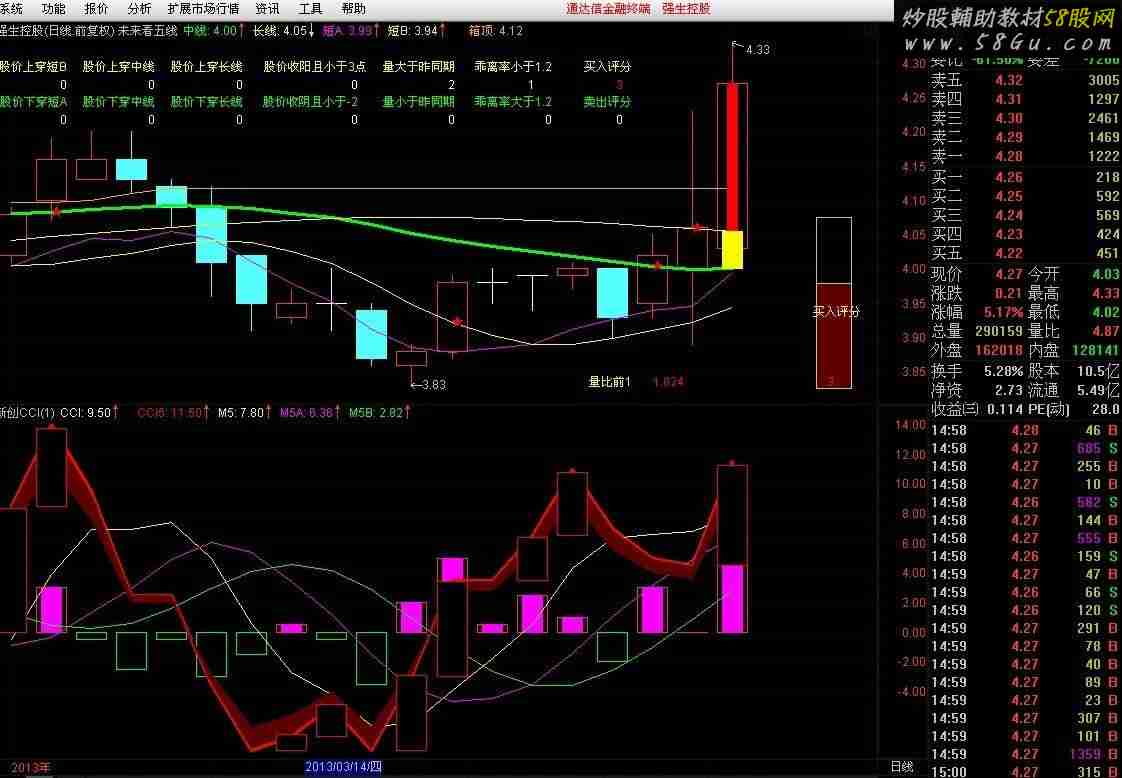 {N:1,100,1}TP:=(H+L+C)/3; MA1:=SUM(C,N); MD1:=SUM(C/MA1,N); CCI:(MA1-TP)/MD1*150,VOLSTICK; STICKLINE(CCI>0,CCI,0,2,0),COLORMAGENTA; STICKLINE(CCI<0,CCI,0,3.1,1),COLORGREEN; CCI5:SUM(CCI,5),COLORRED,LINETHICK3; M5:MA(CCI5,5); M5A:MA(M5,5); M5B:MA(M5A,5); DRAWBAND(CCI5*0.8,90,CCI5*0.98,90); STICKLINE(CCI5>REF(CCI5,1),CCI5*0.98,REF(CCI5,1),3,1),COLORRED;