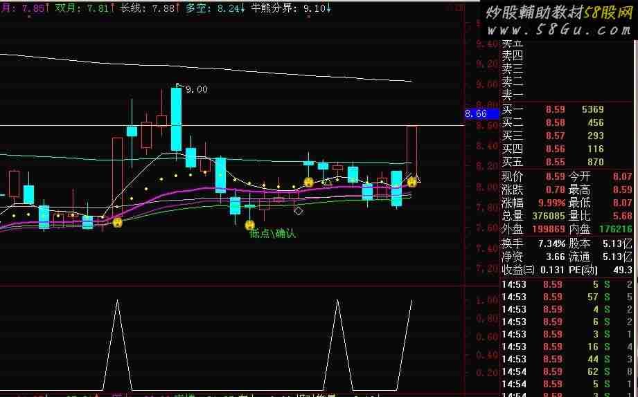 RSV:=(CLOSE-LLV(LOW,9))/(HHV(HIGH,9)-LLV(LOW,9))*100; K:=(SMA(RSV,3,1)); D:=(SMA(K,3,1)); KK:=INTPART(SMA(RSV,3,1)); DD:=INTPART(SMA(K,3,1)); N:=KK+DD,COLORFF00FF,LINETHICK2; 预测:=IF(CROSS(N,50),90,50),COLOR00FF00; 涨停:=IF(CROSS(N,99.5),100,50),COLORYELLOW; 涨停>预测;