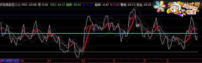 N1:=6;N2:=12;M:=5; LC:=REF(CLOSE,1); RS1:SMA(MAX(CLOSE-LC,0),N1,1)/SMA(ABS(CLOSE-LC),N1,1)*100; 顶:CROSS(82,RS1),NODRAW; DRAWTEXT(顶,RS1*1.01,'顶'),COLORYELLOW; RS2:SMA(MAX(CLOSE-LC,0),N2,1)/SMA(ABS(CLOSE-LC),N2,1)*100; 趋势:MA((RS1+RS2)/2,M),COLOR00FF33; 启:CROSS(RS1,50) AND 趋势>REF(趋势,1),NODRAW; DRAWTEXT(启,RS1,'★'),COLORRED; 趋率:(趋势-REF(趋势,1))/REF(趋势,1)*100,NODRAW; B:RS1<趋势*1.15 AND (RS1-RS2)<7 AND (CROSS(趋势,50) OR 趋势<70 AND 趋势>REF(趋势,1) AND REF(趋势,1)>REF(趋势,2)),NODRAW; 警戒:趋势*1.15,COLORWHITE,LINETHICK2,POINTDOT; 安全:趋势*0.78,COLORWHITE,LINETHICK2,POINTDOT; 两阳加阴:50;{在此中界位时,选两阳加阴的K线形态介入} 持股:IF(趋势>REF(趋势,1),趋势,DRAWNULL),COLORRED,LINETHICK3; 乖离:RS1-RS2,NODRAW; 超卖:20;超买:80;多空界:50,COLORCYAN,LINETHICK2; {BS:IF(BETWEEN(ABS(乖离),8,10)};