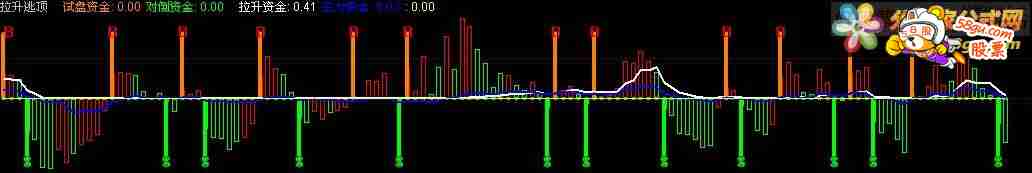 ZLCM:=EMA(WINNER(CLOSE)*70,3); SHCM:=EMA((WINNER(CLOSE*1.1)-WINNER(CLOSE*0.9))*80,3); ZZLKP:=ZLCM/(ZLCM+SHCM)*100; ZZLJJ:=EMA(ZZLKP,89); ZJLRQD:=ZZLKP-ZZLJJ; AA:=EMA(ZJLRQD,1); BB:=EMA(AA,5); CC:=AA-BB; STICKLINE(CC<REF(CC,2),CC,0,2,1), COLOR00FF00; STICKLINE(CC>REF(CC,2),CC,0,2,1), COLORRED; 试盘资金:IF(CROSS(AA,BB),8,0),STICK,LINETHICK4,COLOR0080FF; 对倒资金:IF(CROSS(BB,AA),-8,0),STICK,LINETHICK4,COLORGREEN; DRAWICON(试盘资金>0,8,7); DRAWICON(对倒资金<0,-8,8); VAR1:=(HIGH+LOW+CLOSE*2)/4; VAR2:=EMA(VAR1,21); VAR3:=STD(VAR1,21); VAR4:=((VAR1-VAR2)/VAR3*100+200)/4; VAR5:=(EMA(VAR4,89)-25)*1.56; VAR6:=EMA(VAR5,5)*1.22; VAR7:=EMA(VAR6,3); VAR8:=3*VAR6-2*VAR7; VAR1A:=IF(CROSS(VAR6,VAR8) AND CROSS(VAR7,VAR8) AND CROSS(VAR7,VAR6),1,0); VAR1B:=EMA(CLOSE,3)-EMA(CLOSE,89); VAR1C:=EMA(VAR1B,21); VAR1D:=(VAR1B-VAR1C)*10; VAR1F:=POW(VAR1D,3)*0.1+POW(VAR1D,2); 拉升资金:IF(VAR1D>0.015,VAR1F,0)/45,COLORWHITE LINETHICK2; VAR9:=EMA(CLOSE,2)-EMA(CLOSE,55); VAR10:=EMA(VAR9,13); VAR11:=2*(VAR9-VAR10); 主力资金:POW(VAR11,3)*0.1+POW(VAR11,1),COLORBLUE LINETHICK2; 0,COLORYELLOW;