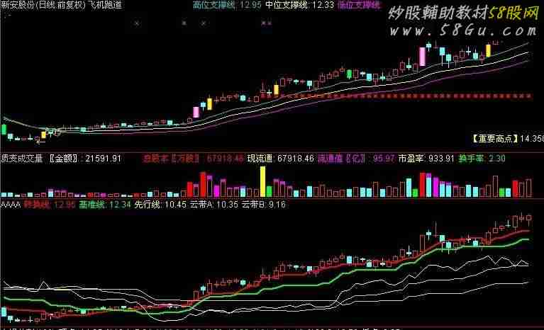 AA:=(HHV(HIGH,120)-LLV(LOW,120))/30; VAR1:=(2*CLOSE+HIGH+LOW)/4; 转换线:(HHV(H,8)+LLV(L,8))/2,COLORRED,LINETHICK2; 基准线:(HHV(H,22)+LLV(L,22))/2,COLORGREEN,LINETHICK2; 先行线:REF(C,22),COLORYELLOW; 云带A:REF((转换线+基准线)/2,22),COLORCCCCCC; 云带B:REF((HHV(H,44)+LLV(L,44))/2,22),COLORCCCCCC; STICKLINE(云带A<云带B,云带A,云带B,0.1,0),COLORFF00FF,POINTDOT; STICKLINE(云带A>=云带B,云带A,云带B,0.1,0),COLORFFFF00,POINTDOT;