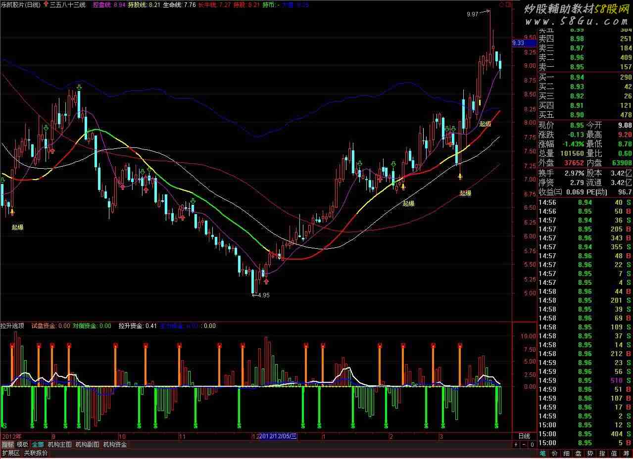 VAR2:=(3*CLOSE+LOW+OPEN+HIGH)/6; VAR3:=(20*VAR2+19*REF(VAR2,1)+18*REF(VAR2,2)+17*REF(VAR2,3)+16*REF(VAR2,4)+15*REF(VAR2,5)+14*REF(VAR2,6)+13*REF(VAR2,7)+12*REF(VAR2,8)+11*REF(VAR2,9)+10*REF(VAR2,10)+9*REF(VAR2,11)+8*REF(VAR2,12)+7*REF(VAR2,13)+6*REF(VAR2,14)+5*REF(VAR2,15)+4*REF(VAR2,16)+3*REF(VAR2,17)+2*REF(VAR2,18)+REF(VAR2,20))/210; VAR4:=MA(VAR3,13); VAR5:=EMA(MA(CLOSE,3),34); VAR6:=(MA(CLOSE,3)+MA(CLOSE,6)+MA(CLOSE,12)+MA(CLOSE,24))/4; VAR7:=MA(VAR6,5); VAR8:=MA(VAR6,10); VAR9:=1/WINNER(CLOSE); VARA:=MA(CLOSE,13); VARB:=100-ABS((CLOSE-VARA)/VARA*100); VARC:=LLV(LOW,75); VARD:=HHV(HIGH,75); VARE:=(VARD-VARC)/100; VARF:=SMA((CLOSE-VARC)/VARE,20,1); VAR10:=SMA((OPEN-VARC)/VARE,20,1); VAR11:=3*VARF-2*SMA(VARF,15,1); VAR12:=3*VAR10-2*SMA(VAR10,15,1); VAR13:=100-VAR12; VAR14:=100-VAR11; VAR15:=MA(WINNER(CLOSE*0.95)*100,3); VAR16:=100-IF(VAR9>5,IF(VAR9<100,VAR9,VARB-10),0); VAR17:=VAR15>VARB; VAR18:=REF(LOW,1)*0.9; VAR19:=LOW*0.9; VAR1A:=(VAR19*VOL+VAR18*(CAPITAL-VOL))/CAPITAL; VAR1B:=EMA(VAR1A,30); VAR1C:=CLOSE-REF(CLOSE,1); VAR1D:=MAX(VAR1C,0); VAR1E:=ABS(VAR1C); VAR1F:=SMA(VAR1D,7,1)/SMA(VAR1E,7,1)*100; VAR20:=SMA(VAR1D,13,1)/SMA(VAR1E,13,1)*100; VAR21:=BARSCOUNT(CLOSE); VAR22:=SMA(MAX(VAR1C,0),6,1)/SMA(ABS(VAR1C),6,1)*100; VAR23:=(-200)*(HHV(HIGH,60)-CLOSE)/(HHV(HIGH,60)-LLV(LOW,60))+100; VAR24:=(CLOSE-LLV(LOW,15))/(HHV(HIGH,15)-LLV(LOW,15))*100; VAR25:=SMA((SMA(VAR24,4,1)-50)*2,3,1); VAR26:=(INDEXC-LLV(INDEXL,14))/(HHV(INDEXH,14)-LLV(INDEXL,14))*100; VAR27:=SMA(VAR26,4,1); VAR28:=SMA(VAR27,3,1); VAR29:=(HHV(HIGH,30)-CLOSE)/CLOSE*100; VAR2A:=VAR22<=25 AND VAR23<-95 AND VAR29>20 AND VAR25<-30 AND VAR28<30 AND VAR1B-CLOSE>=-0.25 AND VAR1F<22 AND VAR20<28 AND VAR21>50; VAR326:=IF(CLOSE>REF(CLOSE, 1),88,0); VAR327:=IF(CLOSE/REF(CLOSE, 1)>1.050 AND HIGH/CLOSE<1.010 AND VAR326>0, 91, 0); STICKLINE(VAR327>90,L*0.99,L*1,1,0),COLORYELLOW; DRAWTEXT(VAR327>90,LOW*0.95,'起爆'),COLORYELLOW; 控盘线:EMA(MA(C,8),3),COLORFF00FF; 持股线:EMA(MA(C,21),5),COLORYELLOW,LINETHICK2; 生命线:EMA(MA(C,34),8),COLORWHITE; 长牛线:EMA(MA(C,55),13),COLORRED; 持股:IF(C>=控盘线 AND 控盘线>REF(控盘线,1),持股线,DRAWNULL),COLORRED,LINETHICK2; 持币:IF(C<持股线 AND C<控盘线 AND 控盘线<REF(控盘线,1),持股线,DRAWNULL),COLORGREEN,LINETHICK2; AA:=EMA(INDEXC,300)/EMA(C,300); XC:=(INDEXC/AA); 大盘:EMA(XC,10) , COLORBLUE;