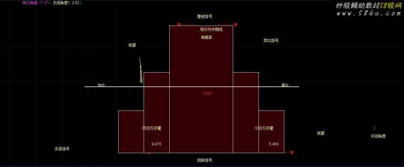 DRAWTEXT_FIX(1,0.49,0.9,1,'★---------------------------------'),COLORRED; DRAWTEXT_FIX(1,0.69,0.9,1,'------------------------------------------★'),COLORRED; DRAWTEXT_FIX(1,0.58,0.1,1,'--------------★'),COLORRED; DRAWTEXT_FIX(1,0.50,0.1,1,'★-------------'),COLORRED; DRAWRECTREL(346,655,671,920,50); DRAWRECTREL(396,415,621,920,50); DRAWRECTREL(446,123,571,920,50); DRAWRECTREL(280,504,700,505,120); DRAWTEXT_FIX(1,0.53,0.95,1,'阳转信号'),COLORYELLOW; DRAWTEXT_FIX(1,0.25,0.88,1,'买进信号'),COLORYELLOW; DRAWTEXT_FIX(1,0.32,0.48,1,'加仓'),COLORYELLOW; DRAWTEXT_FIX(1,0.38,0.23,1,'观望'),COLORYELLOW; DRAWTEXT_FIX(1,0.53,0.05,1,'警戒信号'),COLORYELLOW; DRAWTEXT_FIX(1,0.66,0.20,1,'卖出信号'),COLORYELLOW; DRAWTEXT_FIX(1,0.68,0.48,1,'清仓'),COLORYELLOW; DRAWTEXT_FIX(1,0.75,0.78,1,'观望'),COLORYELLOW; DRAWTEXT_FIX(1,0.55,0.13,1,'现价与中期线'),COLORYELLOW; DRAWTEXT_FIX(1,0.53,0.18,1,'乖离率'),COLORYELLOW; VA1:=REF((LOW+OPEN+CLOSE+HIGH)/4,1); VA2:=SMA(ABS(LOW-VA1),13,1)/SMA(MAX(LOW-VA1,0),10,1); VA3:=EMA(VA2,10); VA4:=LLV(LOW,33); VA5:=EMA(IF(LOW<=VA4,VA3,0),3); AA:=HHV(VA5,18)>100; BB:=BARSLAST(VA5>REF(VA5,1)); TT:=BB+1; HH:=REF(H,TT); XG:=CROSS(C,REF(H,TT)); HJ:=(C+HH)/2; HK:=(C+HJ)/2; HL:=(C+HK)/2; HG:=MA(HL,3); HF:=IF(HG>REF(HG,1),HG*1.008,HG*0.993); HG5:=MA(HG,5); HG5A:=MA(HG5,10); 中期线:=MA(HG5A,10); DRAWNUMBER_FIX(CROSS(HF,中期线) AND CURRBARSCOUNT=1,0.30,0.88,1,C),COLORRED; DRAWNUMBER_FIX(CROSS(中期线,HF) AND HF<REF(HF,1) AND CURRBARSCOUNT=1,0.72,0.48,1,C),COLORGREEN; DRAWNUMBER_FIX(HF/中期线<0.8 AND HF<REF(HF,1) AND CURRBARSCOUNT=1,0.78,0.78,1,C),COLORGREEN; DRAWNUMBER_FIX(HF/中期线<0.8 AND HF>REF(HF,1) AND CURRBARSCOUNT=1,0.58,0.95,1,C),COLORRED; DRAWNUMBER_FIX(CURRBARSCOUNT=1,0.53,0.5-(C/中期线-1),1,C/中期线),COLORRED; 天线角度:=ATAN(HF-REF(HF,1))*57.03; STICKLINE(CURRBARSCOUNT<3,天线角度,0,2,1),COLORYELLOW; STICKLINE(CURRBARSCOUNT<3,天线角度,天线角度*0.999,2,0),COLORRED; DRAWTEXT_FIX(CURRBARSCOUNT=1,0.87,0.8,1,'天线角度'),COLORYELLOW; DRAWNUMBER_FIX(CURRBARSCOUNT=1,0.85,0.75,1,INTPART(天线角度)),COLORRED; 最后天数:=CURRBARSCOUNT=1; 角度增:=天线角度>REF(天线角度,1); 角度减:=天线角度<REF(天线角度,1); 小幅增:=天线角度>0 AND 天线角度<30; 中幅增:=天线角度>30 AND 天线角度<45; 大幅增:=天线角度>45 AND 天线角度<80; 小幅减:=天线角度<0 AND 天线角度>-30; 中幅减:=天线角度<-30 AND 天线角度>-45; 大幅减:=天线角度<-45 AND 天线角度>-80; DRAWNUMBER_FIX(最后天数 AND 角度增 AND 小幅增,0.30,0.88,1,C),COLORRED; DRAWNUMBER_FIX(最后天数 AND 角度增 AND 中幅增,0.38,0.48,1,C),COLORRED; DRAWNUMBER_FIX(最后天数 AND 角度增 AND 大幅增,0.43,0.23,1,C),COLORRED; DRAWNUMBER_FIX(最后天数 AND 小幅减 ,0.75,0.68,1,C),COLORGREEN; DRAWNUMBER_FIX(最后天数 AND 中幅减 ,0.70,0.20,1,C),COLORGREEN; DRAWNUMBER_FIX(最后天数 AND 大幅减 ,0.80,0.78,1,C),COLORGREEN; DRAWNUMBER_FIX(最后天数 AND REF(天线角度,1)<0 AND 天线角度>=0,0.58,0.95,1,C),COLORRED; 现价角度:ATAN(C-REF(C,1))*57.03,LINETHICK0; 天线角度1:IF(CURRBARSCOUNT<4,天线角度,DRAWNULL),COLORYELLOW; DRAWTEXT_FIX(1,0.65,0.75,1,'今日万手量'),COLORYELLOW; DRAWNUMBER_FIX(最后天数,0.66,0.85,1,V/10000),COLORYELLOW; DRAWTEXT_FIX(1,0.43,0.75,1,'昨日万手量'),COLORYELLOW; DRAWNUMBER_FIX(CURRBARSCOUNT=2,0.43,0.85,1,V/10000),COLORYELLOW;