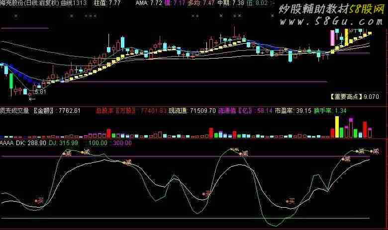 V1:=POW(MA(CLOSE,5),2)+MA(CLOSE,5); V2:=POW(MA(LOW,5),2)+MA(LOW,5); V3:=POW(MA(HIGH,5),2)+MA(HIGH,5); V4:=(V1-LLV(V2,9))/(HHV(V3,9)-LLV(V2,9))*150+65; DK:SMA(V4,3,1)*1.5,COLORFFFFFF; DD:=SMA(DK,3,1); DJ:3*DK-2*DD,COLORGREEN;L1:=(EMA(CLOSE,3) - EMA(CLOSE,13)); L2:=EMA(L1,9); L3:=BARSLAST(CROSS(L1,L2)); L4:=REF(L3,L3+1); L5:=L2<REF(L2,L4); 变盘:=CROSS(L1,L2) AND L5; DRAWTEXT( 变盘>0,DK+20,'●买'),COLOR005BF5;W1:= EMA(CLOSE,12) - EMA(CLOSE,26); W2:= EMA(W1,9); W3:= 2*(W1-W2); W4:= REF(W3,1); W5:= CROSS(W4,W3) AND W4>0; DRAWTEXT(W5 AND DJ>250,DJ,'●减'),COLOR00B4FF;100,COLOR00FF00; 300,COLORFF00F8;