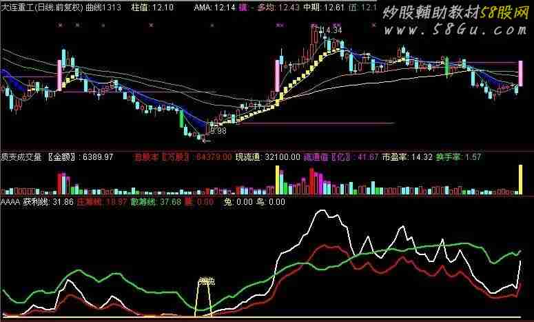 获利线: EMA(WINNER(CLOSE)*100,3),colorwhite ,linethick2 ; 庄筹线: EMA(WINNER(CLOSE)*70,5),colorred , linethick2 ; 散筹线: EMA((WINNER(CLOSE*1.1)-WINNER(CLOSE*0.9))*70,5),colorgreen ,linethick2 ; 鹰: IF(CROSS(获利线,庄筹线) AND 庄筹线<1 AND 散筹线<3,40,0),colorred,linethick2 ; DRAWTEXT(CROSS(获利线,庄筹线) AND 庄筹线<1 AND 散筹线<3,35,'鹰'),colorwhite , ; DRAWTEXT(庄筹线<3 AND 散筹线<5,20,'兔'),coloryellow , ; 兔: IF(庄筹线<3 AND 散筹线<5,20,0),coloryellow ,linethick2; 鸟: IF(CROSS(庄筹线,散筹线) AND 庄筹线<5 AND 散筹线<10,60,0),coloryellow ,linethick2 ; DRAWTEXT(CROSS(庄筹线,散筹线) AND 庄筹线<5 AND 散筹线<10,50,'见鸟必买'),coloryellow , ;