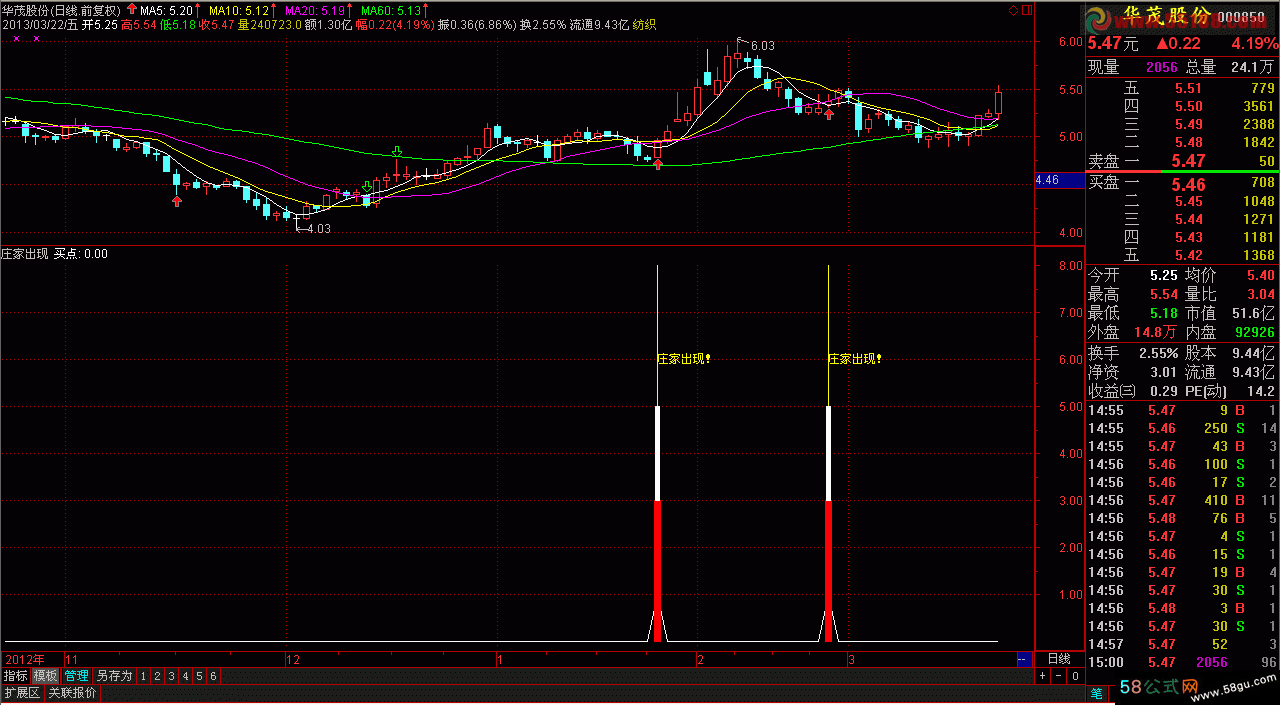 RSV:=(CLOSE-LLV(LOW,9))/(HHV(HIGH,9)-LLV(LOW,9))*100; K1:=SMA(RSV,3,1); D1:=SMA(K1,3,1); J1:=3*K1-2*D1; J2:=REVERSE(J1); AA:=REF(MA(C,1),10)>REF(MA(C,60),10); 买点:CROSS(J1,J2) AND AA; STICKLINE(买点,0,3,2,0),COLOR0000FF; STICKLINE(买点,3,5,1,0),COLORWHITE; STICKLINE(买点,5,8,0,0),COLORYELLOW; DRAWTEXT(买点,6,'庄家出现!'),COLORYELLOW;