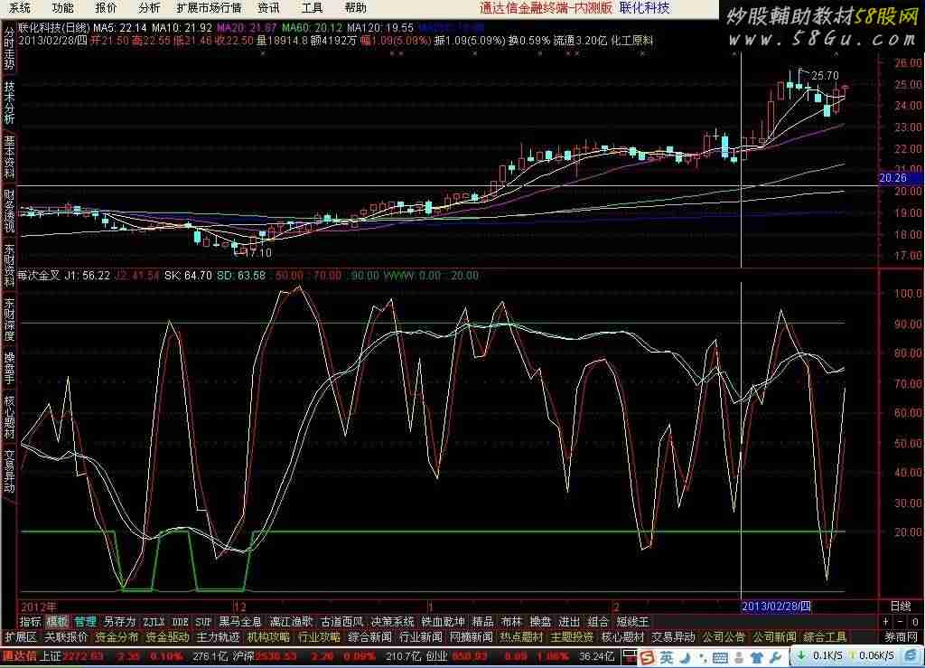 RSV:=(CLOSE-LLV(LOW,5))/(HHV(HIGH,5)-LLV(LOW,5))*100; K0:=SMA(RSV,3,1); K:=K0;D:=SMA(K0,2,1); J1:(3*K0-2*D),COLORYELLOW;J2:MA(J1,2),COLORRED; MAV:=(2*C+H+L)/4; VAR1:=LLV(LOW,21); VAR2:=HHV(HIGH,21); SK: EMA((MAV-VAR1)/(VAR2-VAR1)*100,8),COLORWHITE; SD: EMA(0.667*REF(SK,1)+0.333*SK,1),COLORCYAN; SJ:=3*SK-2*SD; 50,POINTDOT,COLORRED; 70,POINTDOT,COLORRED; 90,COLOR00AA00; WWW:SJ<20,COLOR00AA00; IF(WWW,0,20),COLOR00AA00,LINETHICK2;