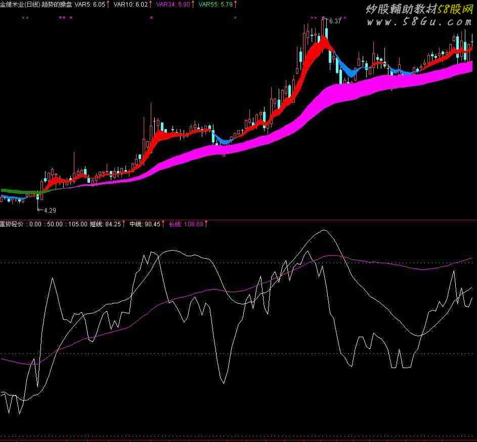 VAR1:=(CLOSE-LLV(LOW,100))/(HHV(HIGH,100)-LLV(LOW,100))*200;VAR2:=SMA(VAR1,3,1);VAR3:=SMA(VAR2,3,1);VAR4:=3*VAR2-2*VAR3;VAR5:=LLV(LOW,5);VAR6:=HHV(HIGH,5);VAR7:=EMA((CLOSE-VAR5)/(VAR6-VAR5)*100,4)*2;VAR8:=EMA(0.667*REF(VAR7,1)+0.333*VAR7,2);VAR9:=3*VAR7-2*VAR8;VARA:=POW(MA(CLOSE,5),2)+MA(CLOSE,5);VARB:=POW(MA(LOW,5),2)+MA(LOW,5);VARC:=POW(MA(HIGH,5),2)+MA(HIGH,5);VARD:=(VARA-LLV(VARB,64))/(HHV(VARC,64)-LLV(VARB,64))*150+65-10;VARE:=SMA(VARD,3,1)*1.5-100;VARF:=SMA(VARE,3,1);VAR10:=3*VARE-2*VARF;VAR11:=(HIGH+LOW+CLOSE*2)/4;VAR12:=EMA(VAR11,13);VAR13:=STD(VAR11,13);VAR14:=(VAR11-VAR12)*100/VAR13;VAR15:=EMA(VAR14,5);VAR16:=EMA(VAR15,13);VAR17:=EMA(VAR15,13)+200-100;VAR18:=EMA(VAR17,10);VAR19:=3*VAR17-2*VAR18;VAR1A:=VAR2+VAR7+VARE+VAR17;VAR1B:=VAR3+VAR8+VARF+VAR18;VAR1C:=VAR4+VAR9+VAR10+VAR19;VAR1D:=(HIGH+LOW+CLOSE)/3;VAR1E:=AMOUNT/VOL/100;VAR1F:=SUM(AMOUNT,5)/SUM(VOL,5)/100;VAR20:=(VAR1D-MA(VAR1D,34))/(0.015*AVEDEV(VAR1D,34));VAR21:=DMA(AMOUNT/VOL/100,VOL/CAPITAL);VAR22:=(HIGH+LOW+CLOSE+VAR1D)/4;VAR23:=EMA(VAR22,24);VAR24:=STD(VAR22,24);VAR25:=(VAR22-VAR23)/VAR24*100;VAR26:=(VAR1D-MA(VAR1D,24))/(0.015*AVEDEV(VAR1D,24));VAR27:=EMA(VAR25,5);VAR28:=(VAR1E-MA(VAR1E,21))/(0.015*AVEDEV(VAR1E,21));VAR29:=(VAR1F-MA(VAR1F,90))/(0.015*AVEDEV(VAR1F,90));VAR2A:=((VAR29+VAR28+VAR27+VAR26+VAR20)/5+165)/4;VAR2B:=(EMA(EMA(EMA(VAR2A,15),10),5)-25)*2+VAR21;VAR2C:=(VAR1A+VAR1B+VAR1C*30)/32/5-15;VAR2D:=EMA(VAR2C,13);VAR2E:=(VAR2A+VAR2C)/2/1.1;0, POINTDOT;50, POINTDOT;105, POINTDOT;短线: VAR2E;中线: (VAR2B+VAR2D)/2;VAR2F:=EMA(EMA(EMA(CLOSE,13),13),13);VAR30:=((VAR2F-REF(VAR2F,1))/REF(VAR2F,1)*100+0.45)*50;VAR31:=MA(VAR30,21);VAR32:=((HHV(HIGH,15)-CLOSE)/(HHV(HIGH,15)-LLV(LOW,15))*(-1)+0.96)*106;VAR33:=((HHV(HIGH,100)-CLOSE)/(HHV(HIGH,100)-LLV(LOW,100))*(-1)+0.96)*106;VAR34:=(HIGH+LOW+CLOSE)/3;VAR35:=((VAR34-MA(VAR34,14))/(0.015*AVEDEV(VAR34,14))+200)/4;VAR36:=(HIGH+LOW+CLOSE*2)/4;VAR37:=EMA(VAR36,13);VAR38:=STD(VAR36,13);VAR39:=(VAR36-VAR37)*100/VAR38;VAR3A:=EMA(VAR39,5);VAR3B:=EMA(VAR3A,13);VAR3C:=(EMA(VAR3A,13)+100)/2-5;VAR3D:=EMA(VAR3C,10);VAR3E:=EMA(VOL/CAPITAL,21)*13;VAR3F:=(92-100/(1+VAR3E))*2.38;VAR40:=REF(CLOSE,1);VAR41:=WINNER(CLOSE)*100;VAR42:=WINNER(REF(CLOSE,1))*100;VAR43:=REF(INDEXC,1);VAR44:=(CLOSE-VAR40)/VAR40;VAR45:=(INDEXC-VAR43)/VAR43;VAR46:=VAR44-VAR45;VAR47:=SMA(MAX(CLOSE-VAR40,0),4,1)/SMA(ABS(CLOSE-VAR40),4,1)*100;VAR48:=SMA(MAX(CLOSE-VAR40,0),8,1)/SMA(ABS(CLOSE-VAR40),8,1)*100;VAR49:=SMA(MAX(CLOSE-VAR40,0),12,1)/SMA(ABS(CLOSE-VAR40),12,1)*100;VAR4A:=SMA(MAX(CLOSE-VAR40,0)*(1+VOL/CAPITAL),12,1)/SMA(ABS(CLOSE-VAR40)*(1+VOL/CAPITAL),12,1)*100;VAR4B:=SMA(MAX(VAR41-VAR42,0),12,1)/SMA(ABS(VAR41-VAR42),12,1)*100;VAR4C:=SMA(MAX(VAR46,0),12,1)/SMA(ABS(VAR46),12,1)*100;VAR4D:=(VAR47+VAR48+VAR49)/3;VAR4E:=(VAR4A+VAR4B+VAR4C+VAR4D)/4;VAR4F:=(VAR4E-31)*2.3;VAR50:=(EMA(EMA(EMA(EMA(VAR4F,4),3),2),1)-10)*1.43;VAR51:=(HIGH+LOW+CLOSE*2)/4;VAR52:=EMA(VAR51,13);VAR53:=STD(VAR51,13);VAR54:=(VAR51-VAR52)*100/VAR53;VAR55:=EMA(VAR54,5);VAR56:=EMA(VAR55,13);VAR57:=(EMA(VAR56,13)+100)/2-5;VAR58:=EMA(VAR57,10);VAR59:=3*VAR57-2*VAR58;VAR5A:=(CLOSE-LLV(LOW,90))/(HHV(HIGH,90)-LLV(LOW,90))*100;VAR5B:=SMA(VAR5A,7,1);VAR5C:=SMA(VAR5B,10,1);VAR5D:=3*VAR5B-2*VAR5C;VAR5E:=POW(MA(CLOSE,5),2)+MA(CLOSE,5);VAR5F:=POW(MA(LOW,5),2)+MA(LOW,5);VAR60:=POW(MA(HIGH,5),2)+MA(HIGH,5);VAR61:=(VAR5E-LLV(VAR5F,100))/(HHV(VAR60,100)-LLV(VAR5F,100))*100-15;VAR62:=SMA(VAR61,21,1)*1.5;VAR63:=SMA(VAR62,3,1);VAR64:=3*VAR62-2*VAR63;VAR65:=POW(MA(CLOSE,5),2)+MA(CLOSE,5);VAR66:=POW(MA(LOW,5),2)+MA(LOW,5);VAR67:=POW(MA(HIGH,5),2)+MA(HIGH,5);VAR68:=(VAR65-LLV(VAR66,64))/(HHV(VAR67,64)-LLV(VAR66,64))*100;VAR69:=SMA(VAR68,2,1);VAR6A:=SMA(VAR69,2,1);VAR6B:=3*VAR69-2*VAR6A;VAR6C:=EMA(VOL/CAPITAL,21)*100;VAR6D:=(100/(1+VAR6C)*(-1)+92)*1.57;VAR6E:=DMA(AMOUNT/VOL/100,VOL/CAPITAL);VAR6F:=(HIGH+LOW+CLOSE)/3;VAR70:=((VAR6F-MA(VAR6F,5))/(0.015*AVEDEV(VAR6F,5))+VAR6E+140)/4;VAR71:=EMA(EMA(EMA(CLOSE,100),100),100);VAR72:=((VAR71-REF(VAR71,1))/REF(VAR71,1)*100+0.28)*179;VAR73:=EMA(VAR72,20);VAR74:=(VAR5D+VAR64)/2;VAR75:=(VAR69+VAR6A+VAR6B+VAR57+VAR5B+VAR62+VAR6D+VAR58+VAR5C+VAR63+VAR59+VAR5D+VAR64+VAR70+EMA(VAR35,5)*5)/20;VAR76:=(VAR57+VAR5B+VAR62+VAR6D+VAR74+VAR72+VAR73)/7;VAR77:=(VAR58+VAR5C+VAR63+VAR6D+VAR74+VAR72+VAR73)/7;VAR78:=(VAR76+VAR77)/2*1.22;VAR79:=(EMA((VAR74+VAR78+EMA(VAR75,5))/3,89)-12)*1.72;长线: (VAR78+VAR79)/2; |