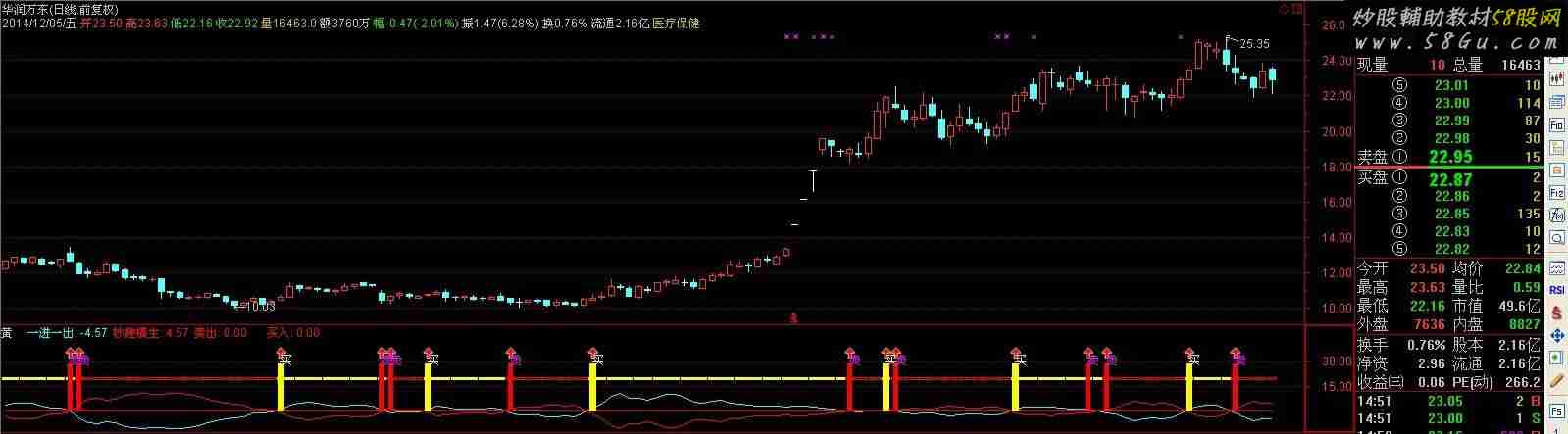 精准买卖提示用法: 黄柱买、红柱卖每一波段都别错过!!VAR1:=(HHV(HIGH,9)-LLV(LOW,9)); VAR2:=(HHV(HIGH,9)-CLOSE); VAR3:=(CLOSE-LLV(LOW,9)); VAR4:=VAR2/VAR1*100-70 ; VAR5:=(CLOSE-LLV(LOW,60))/(HHV(HIGH,60)-LLV(LOW,60))*100; VAR6:=(2*C+H+L)/4; VAR7:=SMA((VAR3/VAR1*100),3,1); VAR8:=LLV(LOW,34); VAR9:=SMA(VAR7,3,1)-SMA(VAR4,9,1); VAR10:= IF(VAR9>100,VAR9-100,0); VARA:=HHV(HIGH,34); 防线B:=EMA((VAR6-VAR8)/(VARA-VAR8)*100,8),COLORWHITE;B1:=EMA(防线B,5); {STICKLINE(防线B>0 AND 防线B-B1>=0,79,80,6,0),COLORFF8000;STICKLINE(防线B>0 AND 防线B-B1<0,79,80,6,1),COLORRED;} {STICKLINE(防线B>0 AND 防线B-B1>=0,19,20,6,0),COLOR00FF00;} STICKLINE(防线B>0 AND 防线B-B1>=0,19,20,3,0),COLORYELLOW;{STICKLINE(防线B>0 AND 防线B-B1<0,49,50,6,1),COLORRED;}STICKLINE(防线B>0 AND 防线B-B1<0,19,20,3,1),COLORRED;一进一出:防线B-B1,COLORCYAN;{STICKLINE(防线B-B1>0,防线B,B1,8,1),COLOR00FF00;}妙趣横生:-一进一出,COLORRED;{STICKLINE(防线B-B1<0,防线B,B1,8,1),COLORRED;}卖出:(REF(一进一出,1)>0 AND 一进一出<=0) OR (一进一出<1 AND 一进一出>=0 ANDC<O),COLORRED;DRAWICON(卖出,36,1);STICKLINE(卖出,0,28,1,0),COLORRED;DRAWTEXT(卖出,30,'卖'),COLORMAGENTA;买入:卖出=0 AND REF(一进一出,1)<0 AND 一进一出>0,COLORRED; STICKLINE(买入,0,28,2,0),COLORYELLOW;DRAWICON(买入,40,1);DRAWTEXT(买入,30,'买'),COLORYELLOW;