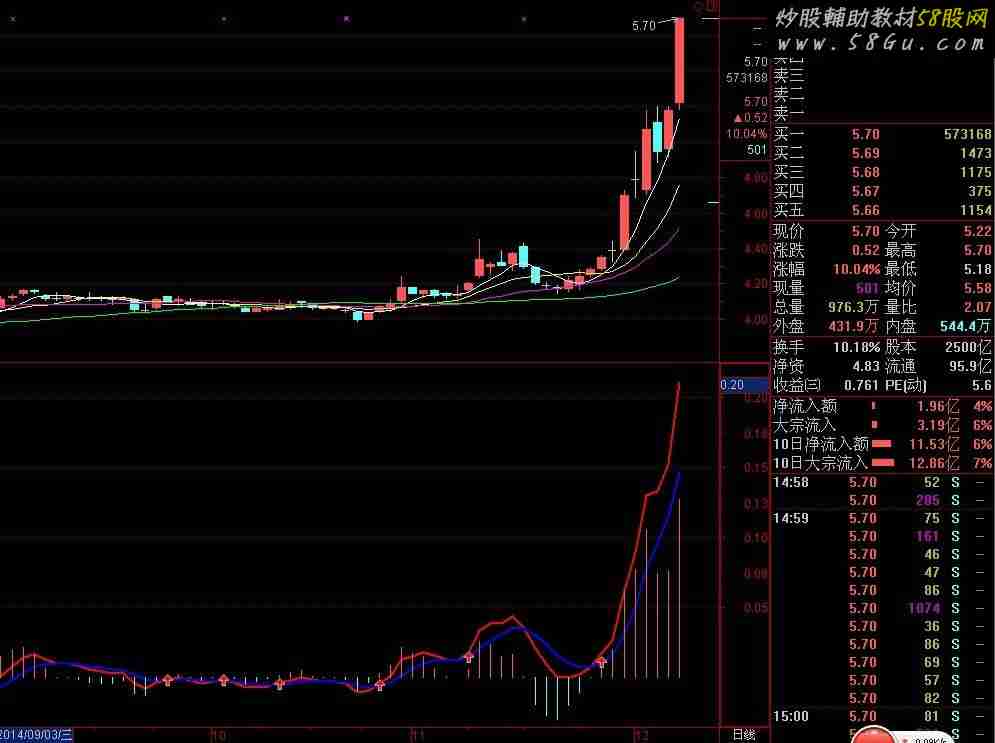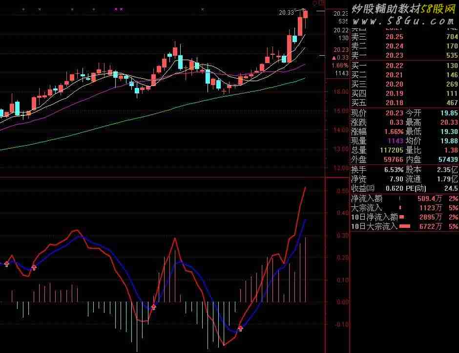 这是一个利用系统MACD指标小作修改的副图和选股指标,波段操作十分准确,没有未来函数,按红箭头信号操作,获利有保障。 趋势:=MA(C,60)>REF(MA(C,60),1) AND C>MA(C,60);DIFF:= EMA(C,6) - EMA(C,10);DIF:EMA(C,6) - EMA(C,10),COLORRED,LINETHICK2;DEA:EMA(DIF,5),COLORBLUE,LINETHICK2;MACD:2*(DIF-DEA),COLORSTICK;DRAWICON(CROSS(DIF,DEA) AND 趋势,DEA,1),COLORYELLOW;