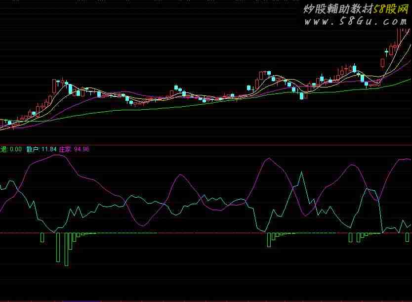 M:=55;N:=21; VAR2:=REF(LOW,1); VAR3:=SMA(ABS(LOW-VAR2),3,1)/SMA(MAX(LOW-VAR2,0),3,1)*100; VAR4:=EMA(IF(CLOSE*1.3,VAR3*10,VAR3/10),3); VAR5:=LLV(LOW,30); VAR6:=HHV(VAR4,30); VAR7:=IF(MA(CLOSE,58),1,0); VAR8:=EMA(IF(LOW<=VAR5,(VAR4+VAR6*2)/2,0),3)/618*VAR7; VAR9:=IF(VAR8>100,100,VAR8); 庄现身:STICKLINE(VAR9>-120,0,VAR9,3,1),COLORRED; VAR1:=REF((L+O+C+H)/4,1); VAR12:=SMA(ABS(VAR1-H),13,1)/SMA(MAX(VAR1-H,0),10,1); VAR13:=EMA(VAR12,10); VAR14:=HHV(H,30); VAR15:=EMA(IF(H>=VAR14,VAR13,0),3); 庄撤退:IF(VAR15<REF(VAR15,1),VAR15,0),COLOR00FF00,NODRAW; STICKLINE(VAR15<REF(VAR15,1),0,-VAR15,3,1 ),COLOR00FF00; 散户: 100*(HHV(HIGH,M)-CLOSE)/(HHV(HIGH,M)-LLV(LOW,M)),COLORFFFF00,LINETHICK1; RSV:=(CLOSE-LLV(LOW,N))/(HHV(HIGH,N)-LLV(LOW,N))*100; K:=SMA(RSV,3,1); D:=SMA(K,3,1); J:=3*K-2*D; 庄家:EMA(J,5),COLORFF00FF,LINETHICK1; |
