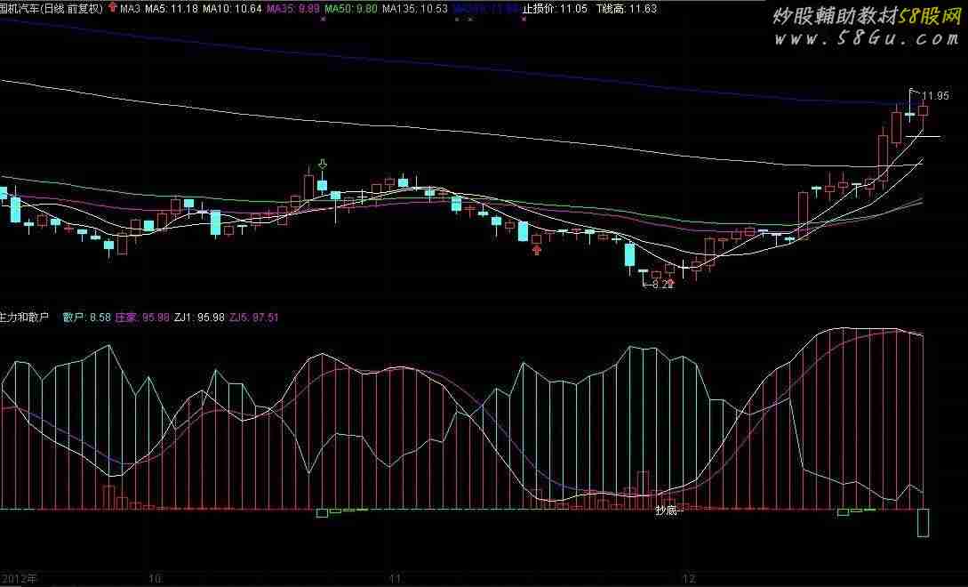 M:=55; N:=21; VAR2:=REF(LOW,1); VAR3:=SMA(ABS(LOW-VAR2),3,1)/SMA(MAX(LOW-VAR2,0),3,1)*100; VAR4:=EMA(IF(CLOSE*1.3,VAR3*10,VAR3/10),3); VAR5:=LLV(LOW,30); VAR6:=HHV(VAR4,30); VAR7:=IF(MA(CLOSE,58),1,0); VAR8:=EMA(IF(LOW<=VAR5,(VAR4+VAR6*2)/2,0),3)/618*VAR7; VAR9:=IF(VAR8>100,100,VAR8); 庄现身:STICKLINE(VAR9>-120,0,VAR9,3,1),COLORRED; VAR1:=REF((L+O+C+H)/4,1); VAR12:=SMA(ABS(VAR1-H),13,1)/SMA(MAX(VAR1-H,0),10,1); VAR13:=EMA(VAR12,10); VAR14:=HHV(H,30); VAR15:=EMA(IF(H>=VAR14,VAR13,0),3); 庄撤退:=IF(VAR15<REF(VAR15,1),VAR15,0),COLOR00FF00,NODRAW; STICKLINE(VAR15<REF(VAR15,1),0,-VAR15,3,1 ),COLOR00FF00; 散户:100*(HHV(HIGH,M)-CLOSE)/(HHV(HIGH,M)-LLV(LOW,M)),COLORFFFF00,LINESTICK; RSV:=(CLOSE-LLV(LOW,N))/(HHV(HIGH,N)-LLV(LOW,N))*100; K:=SMA(RSV,3,1); D:=SMA(K,3,1); J:=3*K-2*D; 庄家:EMA(J,5),COLORFF00FF,COLORSTICK; ZJ1:EMA(庄家,1); ZJ5:EMA(庄家,5); DRAWTEXT(CROSS(ZJ1,ZJ5)AND 庄家<20,-1,'抄底--');