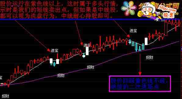 1、股价运行在紫色线以下意味着该股目前趋势为空头趋势,我们坚决不买股票,即使出现了“招财”提示,中线我们依然耐心持币观望,按照顺势而为的原则,空头趋势不买股票。之所以出现“招财”买入信号是因为在下跌中走出了短线超跌反弹行情,有把握的投资者可以短线轻仓参与。没有十足把握,宁可错过不要犯错!2、当盘面当中出现“进宝”的提示的时候意味着我们要注意卖出股票收网止盈了。有股友要问了:是不是只要出现“进宝”提示就无条件卖出呢?其实不然,如果我们手里拿的是中线股,当主力资金在洗盘、震仓的时候盘面当中经常会出现“进宝”提示,但只要股价没有跌破紫色的多空分界线中线依然可以持股,以免被主力洗出去。 3、当盘面中股价上穿白色线的时候也是我们的短线买入信号之一。当盘面当中出现“招财”提示,同时股价站上紫色线或者白线金叉紫色线,这时是我们最为稳健的中线建仓机会 |