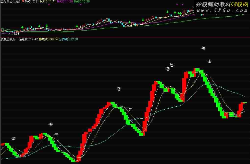 VAR1:=SMA(AMOUNT/10,10,1)/10000; VAR2:=REF(VAR1,1); VAR3:=SMA(AMOUNT/10,10,1)/10000; 资金运转: STICKLINE(VAR1>VAR2,VAR1,VAR2,8,0),COLORRED; 资金流失: STICKLINE(VAR1< VAR2,VAR1,VAR2,8,0),COLORGREEN; 起跑线: MA(VAR1,5); 警戒线: MA(VAR1,10),COLORYELLOW; 分界线: MA(VAR1,30),COLORCYAN; DRAWTEXT(CROSS(警戒线,VAR3),警戒线*1.2,'警'),COLORWHITE; DRAWTEXT(CROSS(分界线,VAR3),分界线*1.2,'走'); 很准的,起跑线金叉警戒线为最佳买点。 选股: VAR1:=SMA(AMOUNT/10,10,1)/10000; 起跑线:=MA(VAR1,5); 警戒线:=MA(VAR1,10); 最佳买点:CROSS(起跑线,警戒线); 再给个买入就涨 DIF:EMA(C,5)-EMA(C,30),COLORSTICK; DEA:=EMA(DIF,5); DIF,COLORWHITE; DEA,COLORYELLOW; 波段泰斗:0,COLORGRAY; IF(DIF>DEA,DIF,DRAWNULL),COLORRED,LINETHICK2; IF(DEA>REF(DEA,1),DEA,DRAWNULL),COLORMAGENTA; DRAWICON(CROSS(DIF,DEA),DEA,1); DRAWICON(CROSS(DEA,DIF),DEA,2);