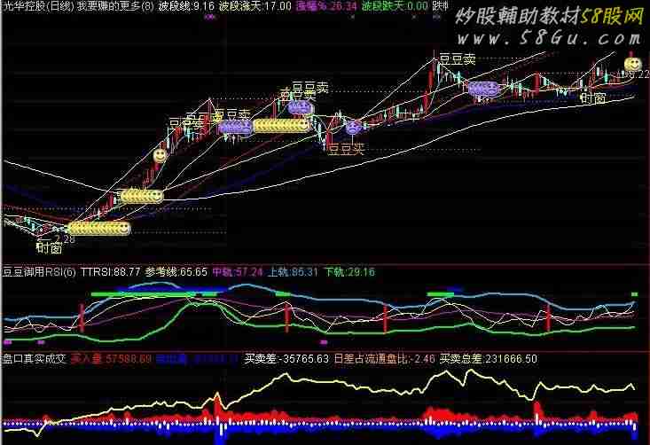 WJ:=(HIGH+LOW+CLOSE)/3;V1:=IF(HIGH=LOW,1,HIGH-MAX(OPEN,CLOSE));V2:=IF(HIGH=LOW,1,MAX(CLOSE,OPEN)-WJ); V3:=IF(HIGH=LOW,1,MIN(OPEN,CLOSE)-LOW);V4:=IF(HIGH=LOW,1,WJ-MIN(CLOSE,OPEN)); V5:=VOL/IF(HIGH=LOW,4,HIGH-LOW);V6:=(V1*V5);V7:=(V2*V5);V8:=(V3*V5);V9:=(V4*V5); 买入量:(V9+V8),STICK,LINETHICK7,COLORRED;卖出量:-(V6+V7),STICK,LINETHICK7,COLORBLUE; 买卖差:(V9+V8)-(V6+V7),COLORWHITE,STICK,LINETHICK3;日差占流通盘比:买卖差/CAPITAL*100,COLOR0099FF,POINTDOT; 买卖总差:SUM(买卖差,60),COLORYELLOW,LINETHICK2; |