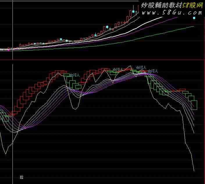 一个不错的指标,现在拿出来和大家分享下,具体操作方法自己研究吧。VAR1:=(CLOSE+HIGH+LOW+OPEN)/4;VAR2:=SUMBARS(VOL,CAPITAL);VAR3:=HHV(VAR1,VAR2);VAR4:=LLV(VAR1,VAR2);VAR5:=(2*VAR1-VAR4-REF(VAR4,1))/(VAR3-VAR4);VAR6:=(VAR1-VAR4)/(VAR3-VAR4);VAR7:=IF(VAR1<=VAR4,VAR5*60,VAR6*60);VAR8:=600*(EMA(CLOSE,3)-EMA(LOW,30))/EMA(LOW,30);VAR9:=EMA(VAR8,7);VARA:=(WINNER(120*CLOSE/100)-WINNER(100*CLOSE/100))*100;VARB:=(-100)*(WINNER(120*CLOSE/100)-WINNER(100*CLOSE/100))+5;VARC:=HHV(HIGH,9)-LLV(LOW,9);VARD:=HHV(HIGH,9)-CLOSE;VARE:=CLOSE-LLV(LOW,9);VARF:=VARD/VARC*100-70;VAR10:=(CLOSE-LLV(LOW,60))/(HHV(HIGH,60)-LLV(LOW,60))*100;VAR11:=(2*CLOSE+HIGH+LOW)/4;VAR12:=SMA(VARE/VARC*100,3,1);VAR13:=LLV(LOW,34);VAR14:=SMA(VAR12,3,1)-SMA(VARF,9,1);VAR15:=IF(VAR14>100,VAR14-100,0);VAR16:=HHV(HIGH,34);VAR17:=EMA((VAR11-VAR13)/(VAR16-VAR13)*100,8);VAR18:=EMA(VAR17,5);STICKLINE(VAR17-VAR18>0,VAR17,VAR18,8,1),COLORRED ;STICKLINE(VAR17-VAR18<0,VAR17,VAR18,8,1),COLORGREEN ;Q1:=(CLOSE-REF(CLOSE, 1))/REF(CLOSE, 1)*100;Q2:=(CLOSE-LLV(LOW, 18))/(HHV(HIGH, 18)-LLV(LOW, 18))*100;Q3:=SMA(Q2, 9, 1);Q4:=SMA(Q3, 3, 1);AA:3*Q3-2*Q4 ,COLORYELLOW;Q5:=AA>1*REF(AA, 1);Q6:=LLVBARS(LOW, 50);Q7:=SUM(VOL, Q6);Q8:=HHVBARS(HIGH, 50);Q9:=SUM(VOL, Q8);Q10:=(CLOSE-REF(OPEN, Q8))/REF(OPEN, Q8)*100;Q11:=HHV(AA,5);A1:EMA(Q3, 3) , COLORFFDDCC;A2:EMA(A1, 3) , COLORFFBBCC;A3:EMA(A2, 3) , COLORFF99CC;A4:EMA(A3, 3) , COLORFF55CC;A5:EMA(A4, 3) , COLORFF33CC;A6:EMA(A5, 3) , COLORFF11CC;A:EMA(A4, 3), COLORFF00CC;DRAWTEXT(CROSS(AA, 20) AND Q10<-13,10,'☆大底'), COLOR00FF00;DRAWTEXT(CROSS(AA, A5) AND REF(AA,1)<34,REF(AA,1),'☆发财了'), COLORRED ;DRAWTEXT(CROSS(A1, AA) AND REF(AA,1)>80, REF(AA,3), '☆闪人'), COLORCFB53B ;DRAWTEXT(CROSS(AA, A1) AND Q5 AND A1<20 AND Q1>9 OR A1>1*REF(A1, 1)AND Q1>4 AND A1<60, 30, '拉'), COLORFFFFCC;