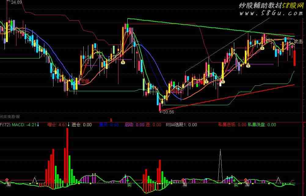 RSV:=(CLOSE-LLV(LOW,9))/(HHV(HIGH,9)-LLV(LOW,9))*100; K:=SMA(RSV,3,1); D:=SMA(K,3,1); DPYJ:=(K+D)/2,LINETHICK2 ;基本线:=EMA(DPYJ,5)/1.5 ; 基本线2:=EMA(DPYJ,2)/1.5,COLORRED;波段线:=5*SMA((CLOSE-LLV(LOW,27))/(HHV(HIGH,27)-LLV(LOW,27))*100,5,1)-3*SMA(SMA ((CLOSE-LLV(LOW,27))/(HHV(HIGH,27)-LLV(LOW,27))*100,5,1),3,1)-SMA(SMA(SMA ((CLOSE-LLV(LOW,27))/(HHV(HIGH,27)-LLV(LOW,27))*100,5,1),3,1),2,1),LINETHICK1,COLORRED; AAA:=(C*2+H+L)/4*10; DF:=EMA(AAA,13)-EMA(AAA,34); DEAA:=EMA(DF,5); MACD:2*(DF-DEAA)*5.5,LINETHICK2,COLOR00FF00; MACDFS:= IF(MACD<=0,MACD,0),COLOR00FF00,LINETHICK2; STICKLINE(MACDFS>REF(MACDFS,1),MACDFS,0,0.5,0),COLOR00FF00; MACDZS:=IF(MACD>=0,MACD,0),COLORFF00FF,LINETHICK2; STICKLINE(MACDZS>REF(MACDZS,1),MACDZS,0,0.5,0),COLORFF00FF; DD:=MACD>REF(MACD,1) AND 波段线>0 AND 波段线<100; M买:=IF(DD>REF(DD,1) ,5,0),COLORRED,LINETHICK2; M1:=EMA(MA(波段线,5),3); STICKLINE(波段线>108 AND 波段线>=M1,MACD-2,MACD,2,0),COLORF0F000; STICKLINE(波段线<0 AND 波段线<M1,MACD,0,1,0),COLORRED; VAR2AAA:=REF(LOW,1); VAR3AAA:=SMA(ABS(LOW-VAR2AAA),13,1)/SMA(MAX(LOW-VAR2AAA,0),13,1)*100; VAR4AAA:=EMA(IF(CLOSE*1.2,VAR3AAA*13,VAR3AAA/13),13); VAR5AAA:=LLV(LOW,34); VAR6AAA:=HHV(VAR4AAA,34); VAR7AAA:=IF(LLV(LOW,56),1,0); VAR8AAA:=EMA(IF(LOW<=VAR5AAA,(VAR4AAA+VAR6AAA*2)/2,0),3)/618*VAR7AAA; VAR9AAA:=EMA(CLOSE,5); VAR10A:=(CLOSE-MA(CLOSE,34))/MA(CLOSE,34)*(10); VAR11A:=EMA(IF(LOW<=VAR5AAA,(VAR4AAA+VAR6AAA*2)/2,0),3)/618*VAR7AAA*(-1); VAR12A:=EMA(CLOSE,5)*(-1); 减仓:=IF(VAR12A<REF(VAR12A,1),VAR12A,0),COLOR10E410,LINETHICK0; 增仓:IF(VAR9AAA<REF(VAR9AAA,1),VAR9AAA*0.2,0),COLOR1010FF,LINETHICK1; 进仓:IF(VAR8AAA>REF(VAR8AAA,1),VAR8AAA*1,0),COLOR10FFFF,LINETHICK1; 洗盘:=IF(VAR11A>REF(VAR11A,1),VAR11A*8,0),COLORFFF810,LINETHICK0; 主力持仓:=LOW,COLORFF10FF,LINETHICK0; 增减力度:=VAR10A*5,COLORWHITE; XL1:=MA(LOW,2)*0.96; XL2:=MA(LOW,26)*0.85; XL3:=REF(XL1,1)<XL2 AND REF(XL1,1)<XL1 AND REF(XL1,1)<REF(XL1,2); STICKLINE(XL3,0,VAR8AAA*1,3,0),COLOR006EFF; DRAWTEXT(XL3,VAR8AAA*1,'买'),COLOR0000FF; ↑买:=DRAWICON(XL3,VAR8AAA*1,4),COLORRED; V0:=0,COLORFFA2AF; 洗盘1:=(MACD>0 AND MACD<REF(MACD,1) AND 增减力度>REF(增减力度,1) AND 增减力度>0 )*5; X1:=(3*C+L+H+O)/6; FA:=(EMA(CLOSE,5)-EMA(CLOSE,21))*4; VAR10AA:=C=HHV(C,4) AND REF(C,1)=LLV(C,4); VAR20A:=C=LLV(C,4) AND (REF(C,1)<REF(C,2) OR REF(C,1)<REF(C,3)) OR REF(C,1)=LLV(C,4) AND C<REF(C,2) OR REF(C,2)=LLV(C,4) AND REF(C,1)=HHV(C,4) AND C<REF(C,1) OR REF(C,3)=LLV(C,4) AND C<REF(C,1) AND C<REF(C,2); VAR30A:=REF(C,1)=LLV(C,4) AND C>=REF(C,2) OR REF(C,2)=LLV(C,4) AND REF(C,1)<=REF(C,3) AND REF(C,2)<REF(C,4) AND C>=REF(C,1); VAR40A:=(20*X1+19*REF(X1,1)+18*REF(X1,2)+17*REF(X1,3)+16*REF(X1,4)+15*REF(X1,5)+ 14*REF(X1,6)+13*REF(X1,7)+12*REF(X1,8)+11*REF(X1,9)+10*REF(X1,10)+9*REF(X1,11)+8*REF(X1,12) +7*REF(X1,13)+6*REF(X1,14)+5*REF(X1,15)+4*REF(X1,16)+3*REF(X1,17)+2*REF(X1,18)+REF(X1,20))/210; MTM:=C-REF(C,1); DX:=100*EMA(EMA(MTM,6),6)/EMA(EMA(ABS(MTM),6),6); CB:=EMA(VAR40A,13);卖1:=HHV(DX,2)=HHV(DX,7) AND COUNT(DX>50,2) AND CROSS(MA(DX,2),DX); DRAWICON(FILTER(卖1=1,1),3,2); DRAWTEXT(FILTER(卖1=1,1),1.02,'卖'),COLORGREEN; 量买:LLV(DX,2)=LLV(DX,7) AND COUNT(DX<0,2) AND CROSS(DX,MA(DX,2)) AND MACD>REF(MACD,1); DRAWTEXT(FILTER(量买=1,5),1.13,'买'),COLORRED; DRAWICON(FILTER(量买=1,5),5,1); 加仓:=SMA(EMA((C-REF(C,1))/REF(C,1),5)*100,3,1)*10; DRAWTEXT(FILTER((CROSS(加仓,0) OR CROSS(CLOSE,CB)) AND 量买=1,3),1.5,'加'),COLORWHITE; 跟:=MA(X1,18)>=REF(MA(X1,18),3) AND CROSS(CLOSE,MA(X1,18));启动:(FILTER((CROSS((EMA(CLOSE,2)-EMA(CLOSE,10)),EMA((EMA(CLOSE,2)-EMA(CLOSE,10)),2)) AND EMA((EMA(CLOSE,2)-EMA(CLOSE,10)),2)<0 AND CROSS(C,MA(C,20))),90))*60;A7A:=C-REF(C,1); A8A:=100*EMA(EMA(A7A,6),6)/EMA(EMA(ABS(A7A),6),6); 进:((LLV(A8A,2)=LLV(A8A,7) AND MACD>REF(MACD,1) AND COUNT(A8A<0,2) AND CROSS(A8A,MA(A8A,2))))*6,COLORRED;倍量:=((V>REF(V,1)*1.91) AND C>REF(C,1))*5; AA1A:=VOL<REF(LLV(VOL,21),1); AA2A:=VOL<REF(LLV(VOL,55),1); AA3A:=ABS(VOL-REF(VOL,1))/REF(VOL,1)<=0.05; STICKLINE(倍量,0,V/2000000,1,0),COLORYELLOW; 缩量5:=REF(LLV(V,5),1); 缩量15:=REF(LLV(V,15),1); 缩量30:=REF(LLV(V,30),1); 地量:=V<缩量15; 放量:=V>4*缩量15; STICKLINE(地量 ,0,0-2,2,0),COLOR00FFFF; TYP:=(HIGH+LOW+CLOSE)/3; CCI:=(TYP-MA(TYP,14))/(0.015*AVEDEV(TYP,14)); A:=REF(C,1); RSI:=SMA(MAX(C-A,0),6,1)/SMA(ABS(C-A),6,1)*100; A1:=(C/MA(C,5)-1)*100<-10; A2:=(C/MA(C,13)-1)*100<-10; A3:=(C/MA(C,34)-1)*100<-15; A4:=RSI<18; A5:=CCI<-120; A6:=COUNT(ABS(C/REF(C,1)-1)*100>=6,30)>=1; 底部:=(A1 AND A2 AND A3 AND A4 AND A5 AND A6)*20,COLOR00FFFF,LINETHICK2; LC1:=REF(CLOSE,1); RSI4:=((SMA(MAX(CLOSE - LC1,0),4.1,1))/ (SMA(ABS(CLOSE - LC1),4.1,1)))*(100); 很准1:=CROSS(RSI4,20); RSI4选股1:IF(很准1 AND MA(C,60)>REF(MA(C,60),1),10,0); 强区:=波段线>108 AND 波段线>=M1 AND MACD>REF(MACD,1) AND( REF(增仓,1)>0 OR REF(洗盘1,1)=5 OR REF(洗盘1,2)=5 ); 强1:=IF(波段线>108 AND 波段线>=M1>REF(波段线>108 AND 波段线>=M1,1),5,0); 强2:=IF(强区>REF(强区,1),10,0); RSVK:=(CLOSE-LLV(LOW,9))/(HHV(HIGH,9)-LLV(LOW,9))*100; KK:=SMA(RSVK,3,1); DK:=SMA(KK,3,1); JK:=3*KK-2*DK; 短顶:=(JK<120 AND JK>98 AND JK>REF(JK,1)); STICKLINE(短顶,MACD+3,MACD,0.5,MACD),COLORYELLOW; XIAO1:=REF((LOW+OPEN+CLOSE+HIGH)/4,1); XIAO2:=SMA(ABS(LOW-XIAO1),13,1)/SMA(MAX(LOW-XIAO1,0),10,1); XIAO3:=EMA(XIAO2,10); XIAO4:=LLV(LOW,33); XIAO5:=EMA(IF(LOW<=XIAO4,XIAO3,0),3); STICKLINE(XIAO5>REF(XIAO5,1),0,XIAO5,3,0 ),COLOR000055; STICKLINE(XIAO5>REF(XIAO5,1),0,XIAO5,2.6,0 ),COLOR000077; STICKLINE(XIAO5>REF(XIAO5,1),0,XIAO5,2.1,0 ),COLOR000099; STICKLINE(XIAO5>REF(XIAO5,1),0,XIAO5,1.5,0 ),COLOR0000BB; STICKLINE(XIAO5>REF(XIAO5,1),0,XIAO5,0.9,0 ),COLOR0000DD; STICKLINE(XIAO5>REF(XIAO5,1),0,XIAO5,0.3,0 ),COLOR0000FF; STICKLINE(XIAO5<REF(XIAO5,1),0,XIAO5,3,0),COLOR005500; STICKLINE(XIAO5<REF(XIAO5,1),0,XIAO5,2.6,0),COLOR007700; STICKLINE(XIAO5<REF(XIAO5,1),0,XIAO5,2.1,0),COLOR009900; STICKLINE(XIAO5<REF(XIAO5,1),0,XIAO5,1.5,0),COLOR00BB00; STICKLINE(XIAO5<REF(XIAO5,1),0,XIAO5,0.9,