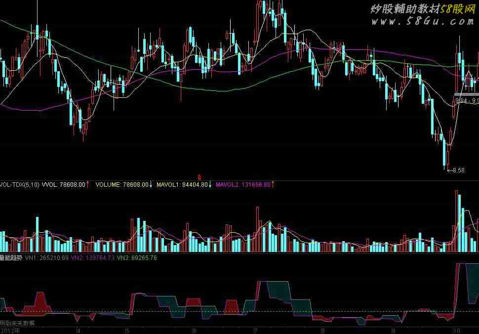 Z,:=(C/REF(C,1)-1)*100; Z,1:=REF(HHVBARS(Z,,10),1)+1; VN1:REF(V,Z,1),COLORGRAY,NODRAW; VN2:PEAK(V,1,1),COLORBB11AA,NODRAW; VN3:PEAK(VN1,1,1),COLOR32CD32,NODRAW; DRAWBAND(VN2,RGB(90,10,10),VN1,RGB(0,35,35)); NOTEXTVN1:VN1,COLORGRAY; NOTEXTVN2:VN2,COLORBB11AA; NOTEXTVN3:VN3,COLOR32CD32,DOTLINE;