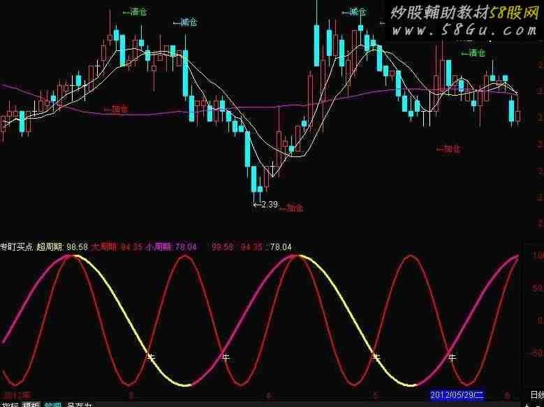 VAR1:=BARSCOUNT(CLOSE)*3.142/18; 超周期: COS(VAR1*1)*100,COLOR00FFFF,LINETHICK3; 大周期: COS(VAR1*2)*100,COLOR0000FF,LINETHICK2; 小周期:COS(VAR1*4)*100,COLOR575757,LINETHICK0; DRAWTEXT(CROSS(超周期,大周期),超周期,'牛'); DRAWTEXT(CROSS(大周期,超周期),大周期,'牛'); IF(超周期>=REF(超周期,1),超周期,DRAWNULL ),COLOR9000F5 ,LINETHICK3; IF(大周期>=REF(大周期,1),大周期,DRAWNULL ),COLOR0000FF ,LINETHICK2; IF(小周期>=REF(小周期,1),小周期,DRAWNULL ),COLORBLUE ,LINETHICK0; |