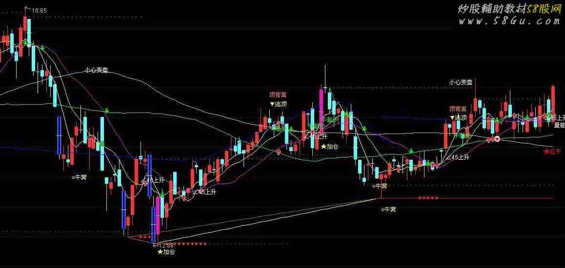 MA5:MA(C,5),COLORWHITE; MA10:MA(C,10),COLORYELLOW; MA20:MA(C,20),COLORMAGENTA; MA60:MA(C,60),COLORGREEN; MA120:MA(C,120),COLORLIGRAY; MA240:MA(C,240),COLORBLUE; 上攻:=IF((C/REF(C,1)>=1.04),1,0); STICKLINE(上攻,O,C,1,0),COLORMAGENTA; STICKLINE((C/REF(C,1)>=1.04) ,(C-O)/2+O, (C-O)/2+O,4,2),LINETHICK2,COLORGREEN; 涨停:=IF((C-REF(C,1))*100/REF(C,1)>=(10- 0.01*100/REF(O,1)),1,0); STICKLINE(涨停,O,C,2,0),COLORYELLOW; 杀跌:=IF((C/REF(C,1)<=0.96),1,0); STICKLINE(杀跌,O,C,1,0),COLORBLUE; STICKLINE((C/REF(C,1)<=0.97) ,(O-C)/2+C, (O-C)/2+C,4,2),LINETHICK2,COLORYELLOW; 跌停:=IF((C/REF(C,1)<=0.9),1,0); STICKLINE(跌停,O,C,2,0),COLORGREEN; 豆豆:=C; A1:=REF(豆豆,10)=HHV(豆豆,2*10+1); B1:=FILTER(A1,10); C1:=BACKSET(B1,10+1); HD:=FILTER(C1,10); A2:=REF(豆豆,10)=LLV(豆豆,2*10+1); B2:=FILTER(A2,10); C2:=BACKSET(B2,10+1); LD:=FILTER(C2,10); A:=REF(C,BARSLAST(HD)); B:=REF(L,BARSLAST(LD)); T1:=BARSLAST(HD)<BARSLAST(LD) AND NOT(HD); T2:=BARSLAST(HD)>BARSLAST(LD) AND NOT(LD); 压力:IF (T1,A,A),COLORYELLOW,POINTDOT,LINETHICK3; 支撑:IF (T2,B,B),COLORGREEN,POINTDOT,LINETHICK3; DRAWICON(CROSS(MA5,MA10),MA10,1); DRAWICON(CROSS(MA10,MA20),MA20,1); DRAWICON(CROSS(MA20,MA60),MA60,1); DRAWICON(CROSS(MA20,MA120),MA120,1); DRAWICON(CROSS(MA20,MA240),MA240,1); DRAWICON(CROSS(MA60,MA120),MA60,23); DRAWICON(CROSS(MA60,MA240),MA240,23); DRAWICON(CROSS(MA120,MA240),MA240,23); DRAWICON(CROSS(MA10,MA5),MA10,2); DRAWICON(CROSS(MA20,MA10),MA20,2); DRAWICON(CROSS(MA60,MA20),MA60,2); DRAWICON(CROSS(MA120,MA60),MA60,24); MA30:=MA(C,30); FA:=BARSLAST(CROSS(MA10,MA5)) AND CROSS(MA5,MA10); FB:=FA AND MA5>MA30 AND MA10>MA30 AND MA10>REF(MA10,1); DRAWTEXT(FB,L-0.58,'★红牛'),COLORRED; V1:=EMA(CLOSE,5); V2:=EMA(EMA(CLOSE,90)*1.01,10); DRAWTEXT(CROSS(V1,V2),V1+0.05,'牛起步'),COLOR00FF00; VAR1:=LLV(LOW,21); VAR2:=HHV(HIGH,21); AK1:=EMA((((CLOSE - VAR1) / (VAR2 - VAR1)) * 100),5); AK:=EMA((((CLOSE - VAR1) / (VAR2 - VAR1)) * 50),13); AB:=CROSS(AK1,AK); DRAWTEXT((AB = 1),(LOW * 0.99),'○牛窝'),COLORYELLOW; AA1:=AMOUNT/V; BB1:=L<AA1*0.9; CC1:=(C-REF(C,1))/REF(C,1)*100>1.2; DD1:=L<MA(C,5)*0.921; EE1:=V<MA(V,5)*1.5; 老鼠仓:=BB1 AND CC1 AND DD1 AND EE1,LINETHICK0,COLOR0099FF; DRAWTEXT(老鼠仓,L*0.99,'老鼠仓'),COLOR0099FF; VAR3AA:=IF((CLOSE>REF(CLOSE,1)),88,0); VAR4AA:=IF(((CLOSE)/(REF(CLOSE,1))>1.05) AND ((HIGH)/(CLOSE)<1.01) AND (VAR3AA>0),91,0); DRAWTEXT(FILTER((VAR4AA>90),45),(LOW)*(0.93),'★大胆搏 '),COLOR00FFFF; DRAWTEXT(FILTER((VAR4AA>90),35),(LOW)*(0.99000001),'★加仓'),COLOR00FFFF; A1AA:=9; A2AA:=(REF(CLOSE,A1AA+1)<CLOSE); DRAWTEXT(FILTER((A2AA>-0.5),84),(HIGH)*(1.05),'小心变盘'),COLORFFFFFF; VAR6:=REF(C,1); VAR7:=SMA(MAX(C-VAR6,0),6,1)/SMA(ABS(C-VAR6),6,1)*100; DRAWTEXT(CROSS(82,VAR7),H*1.01,'▼逃顶'),COLORYELLOW;N:=5; A11:=BACKSET(ISLASTBAR,TROUGHBARS(2,N,1)+1); A21:=A11>REF(A11,1); B11:=BACKSET(ISLASTBAR,TROUGHBARS(2,N,2)+1); B21:=B11>REF(B11,1); C11:=BACKSET(ISLASTBAR,TROUGHBARS(2,N,3)+1); C21:=C11>REF(C11,1); ①:DRAWLINE(B2,H,A2,H,0),COLORBLUE; ②:DRAWLINE(C2,H,B2,H,0),COLORCC6633; ③:IF(A1,PEAK(1,N,1),DRAWNULL),COLORFFAA00; ④:DRAWLINE(C2,H,A2,H,0),COLORLIBLUE; ⑤:DRAWLINE(B21,L,A21,L,0),COLORYELLOW; ⑥:DRAWLINE(C21,L,B21,L,0),COLORFF00FF; ⑦:DRAWLINE(C21,L,A21,L,0),COLORBROWN; ⑧:IF(A11,TROUGH(2,N,1),DRAWNULL),COLORRED; T0:IF(CURRBARSCOUNT<=N+7,CONST(IF(T1=0,C,REF(C,T1))),DRAWNULL); IF(CURRBARSCOUNT=T1+1,T0,DRAWNULL),CIRCLEDOT; DRAWTEXT(ISLASTBAR,T0,' 量能平台'); A4:=(HHV(H,34)-C)/(HHV(H,34)-LLV(L,34))*100; A5:=EMA(CLOSE,12)-EMA(CLOSE,26); A6:=EMA(A5,9); A7:=(A5<-0.1 AND A5>A6); 财神:IF(A7,LLV(L,21),DRAWNULL)COLORRED,CIRCLEDOT; AA:=CYS; MIDD:=MA(CYS,20); CC:=MIDD+0.85*STD(CYS,10); TM6:=AA>CC; A0:=(L+H+C*2)/4; V3:=(1+7/100)*(DMA(CLOSE,V1)); V5:=MA((LOW+HIGH+CLOSE)/3,5); (T2,B,B),COLORGREEN,POINTDOT,LINETHICK3; LC:=REF(CLOSE,1); RSI:=((SMA(MAX((CLOSE - LC),0),3,1) / SMA(ABS((CLOSE - LC)),3,1)) * 100); FF:=EMA(CLOSE,3); MA15:=EMA(CLOSE,21); DRAWTEXT(CROSS(88,RSI),(HIGH * 1.02),'顶背离'),COLOR1880FF; TYP := (HIGH + LOW + CLOSE)/3; CCI1:=(TYP-MA(TYP,6))/(0.015*AVEDEV(TYP,5)); CCI2:=(TYP-MA(TYP,10))/(0.015*AVEDEV(TYP,10)); CCI3:=(TYP-MA(TYP,20))/(0.015*AVEDEV(TYP,20)); CCI4:=(TYP-MA(TYP,30))/(0.015*AVEDEV(TYP,30)); CCI5:=(TYP-MA(TYP,60))/(0.015*AVEDEV(TYP,60)); CCI:=CCI1+CCI2+CCI3+CCI4+CCI5; AAA:=(3*C+H+L+O)/6; VAR3:=(LLV(VAR1,5)+LLV(VAR1,10)+LLV(VAR1,20))/3; VAR4:=(HHV(VAR2,5)+HHV(VAR2,10)+HHV(VAR2,20))/3; VAR5:=(LLV(VAR3,5)+LLV(VAR3,10)+LLV(VAR3,20))/3; SAT:=IF((AMOUNT/C)/(HHV(AMOUNT,20)/HHV(C,20))*100>100,100,(AMOUNT/C)/(HHV(AMOUNT,20)/HHV(C,20))*100); X1:=(C+L+H)/3;BB13:=ATAN(EMA(X1,13)-REF(EMA(X1,13),1))*3.1416*10; EMA8:=EMA(C,8);DRAWTEXT(FILTER(BB13>1 AND EMA(X1,13)>REF(EMA(X1,8),1),10), EMA8,'∠45上升'),COLORWHITE; A51:=3*SMA((C-LLV(L,55))/(HHV(H,55)-LLV(L,55))*100,5,1)-2*SMA((C-LLV(L,55))/(HHV(H,55)-LLV(L,55))*100,5,1); 黑码线:=EMA(A51,5);A54:=((C-LLV(L,21))/(HHV(H,21)-LLV(L,21)))*100; 趋势线:=(MA(3*SMA(A54,6,1)-2*SMA(SMA(A54,5,1),5,1),2)); DRAWTEXT(CROSS(趋势线,0)AND 黑码线<40,(HIGH* 0.97),'▲大黑码'),COLORYELLOW; 注意买:=IF((VAR4<10),80,100);RSV:=(C-LLV(L,9))/(HHV(H,9)-LLV(L,9))*100; K:=SMA(RSV,3,1);D:=SMA(K,3,1);J:=3*K-2*D;超跌:=IF(J<0,10,0);BDDD:=LLV(J,2)=LLV(J,8); 买入:=IF(CROSS(J,REF(J+0.01,1)) AND BDDD AND J<20,30,0); MTM:=C-REF(C,1);DX:=100*EMA(EMA(MTM,6),6)/EMA(EMA(ABS(MTM),6),6); 买:=IF(LLV(DX,2)=LLV(DX,7) AND COUNT(DX<0,2) AND CROSS(DX,MA(DX,2)),1,0);