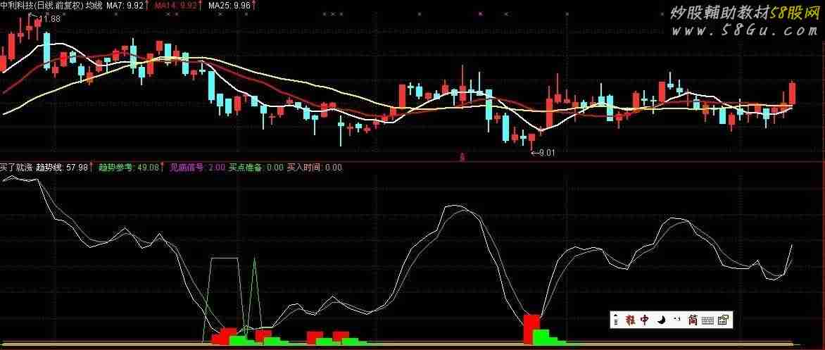 {买了就涨} 趋势线: 3*SMA((CLOSE-LLV(LOW,27))/(HHV(HIGH,27)-LLV(LOW,27))*100,5,1)-2*SMA(SMA((CLOSE-LLV(LOW,27))/(HHV(HIGH,27)-LLV(LOW,27))*100,5,1),3,1); 趋势参考:EMA(趋势线,3),COLORGREEN; 见底信号: 2; 买点准备: IF(趋势线<=10,50,0); 买入时间: IF(CROSS(趋势线,见底信号),100,0),COLOR0099FF,LINETHICK4; VAR1:=REF((LOW+OPEN+CLOSE+HIGH)/4,1); VAR2:=SMA(ABS(LOW-VAR1),13,1)/SMA(MAX(LOW-VAR1,0),10,1); VAR3:=EMA(VAR2,10); VAR4:=LLV(LOW,33); VAR5:=EMA(IF(LOW<=VAR4,VAR3,0),3); 主力进场: STICKLINE(VAR5>REF(VAR5,1),0,VAR5,7,0 ),COLORRED; 洗盘: STICKLINE(VAR5<REF(VAR5,1),0,VAR5,7,0),COLORGREEN;