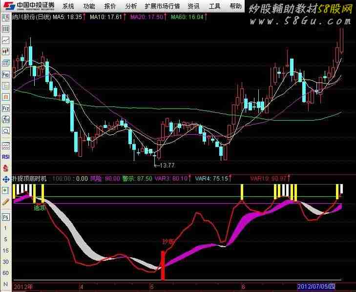 {扑捉顶底时机} 100,COLOR696969,LINETHICK1; 0,LINETHICK1,COLOR00FFFF; 风险:80,COLORFF00FF; 警示:87.5,COLOR00FF00; VAR1:=(CLOSE-LLV(LOW,36))/(HHV(HIGH,36)-LLV(LOW,36))*100; VAR2:=SMA(VAR1,3,1); VAR3:SMA(VAR2,3,1),COLORFF00FF; VAR4:SMA(VAR3,3,1),COLORFFFF00; DRAWBAND(VAR3,RGB(200,0,200),VAR4,RGB(200,200,200)); VAR5:=CROSS(VAR3,VAR4) AND VAR3<20; DRAWTEXT(FILTER(VAR5,10)=1,40,'抄底'),COLORRED; STICKLINE(FILTER(VAR5,10)=1,0,30,2,0),COLORRED; VAR6:=CROSS(VAR4,VAR3) AND VAR3>80; STICKLINE(FILTER(VAR6,5)=1,80,100,1,0),COLORGREEN; DRAWTEXT(FILTER(VAR6,5)=1,75,'逃顶'),COLORGREEN; VAR7:=CROSS(VAR2,VAR3) AND VAR3>80 AND VAR3>VAR4; STICKLINE(VAR7,VAR7,100,1,0),COLORFF0000; VAR8:=LLV(LOW,36); VAR9:=HHV(HIGH,30); VAR10:(EMA(((CLOSE-VAR8)/(VAR9-VAR8))*(4),4))*(25),COLOR0000FF,LINETHICK2; STICKLINE(VAR10>=80,VAR10,100,1,0),COLOR00FFFF; STICKLINE(VAR10>=87.5,VAR10,100,1,0),COLORFFFFFF; |