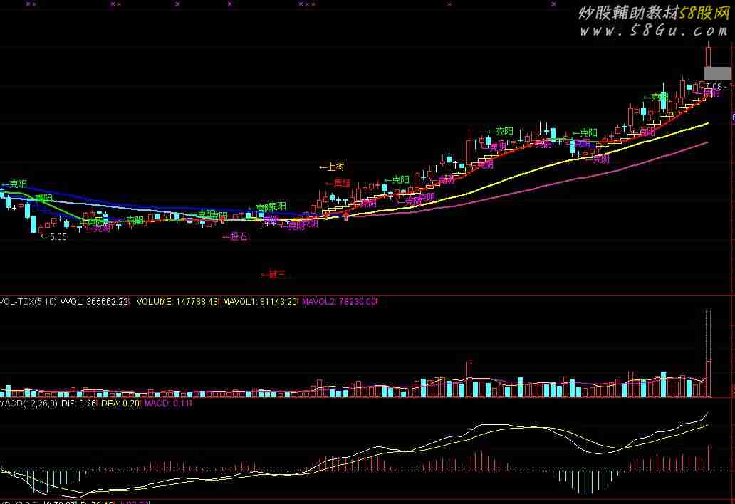 说明: 1、主图用,各个标志还是很清晰实用的。2、由以下各个指标组合,其中有些也可单独使用、选股: 天堂之路、地狱之门、阻力价、红杏出墙、蚂蚁上树、一阳穿三线、三军集结、日月合璧、黑客点击、揭竿而起、金屋藏娇、投石问路、梅开二度、一支独秀、独上高楼、一剑封喉、见好就收 、一阴破三等等3、绝无未来,绝无加密。还是那句话,指标公式只是一个工具平台,难免各种的不尽如人意。要在实战中不断优化不断完善,以提高效率取得好的收益! LOCK:=1;M8:=EMA(CLOSE,8);M13:=EMA(M8,13);VAR1:=EMA(M13,62);VAR2:=(CLOSE+HIGH+LOW)/3;VAR3:=EMA(VAR2,10)*LOCK;VAR4:=REF(VAR3,1)*LOCK;天堂之路:STICKLINE(VAR3>VAR4,VAR3,VAR4,4,1),COLOR00FFFF;地狱之门:STICKLINE(VAR3<VAR4,VAR3,VAR4,4,1),COLORFF0000;MA13:MA(C,13),COLORRED,LINETHICK2;K1:=BACKSET(MA13<REF(MA13,1),2);十三:IF(K1,MA13,DRAWNULL),COLOR00CC33,LINETHICK2;MA34:MA(C,34),COLORYELLOW,LINETHICK2;K2:=BACKSET(MA34<REF(MA34,1),2);三四:IF(K2,MA34,DRAWNULL),COLORFFCC66,LINETHICK2;MA55:MA(C,55),COLOR9933CC,LINETHICK2;K3:=BACKSET(MA55<REF(MA55,1),2);五五:IF(K3,MA55,DRAWNULL),COLORBLUE,LINETHICK2;阻力价:HHV(HIGH,19),LINETHICK1,NODRAW;AR1:=MA55>MA34 AND MA34>MA13;AR2:=BARSLAST((C-MA13)/MA13*100<-6);AR3:=MA13>=REF(MA13,1);AR4:=COUNT(CROSS(C,MA13),AR2)=1;AR5:=AR1 AND AR2 AND AR3 AND AR4;AR6:=AR5 AND FILTER(AR5,10);红杏出墙: DRAWTEXT(AR6,L-0.1,'←红杏'),COLORYELLOW;BR1:=COUNT(BETWEEN((C-REF(C,1))/REF(C,1)*100,0,5) ,5)=5;BR2:=ABS((MA13-MA34)+(MA34-MA55))/C<0.2;BR3:=C>MA55 AND (REF(C,1)<REF(MA55,1) OR REF(C,2)<REF(MA55,2) ORREF(C,3)<REF(MA55,3) OR REF(C,4)<REF(MA55,4) OR REF(C,5)<REF(MA55,5));BR4:=BR1 AND BR2 AND BR3;蚂蚁上树: DRAWTEXT(BR4 AND FILTER(BR4,10),H+0.3,'←上树'),COLOR00C5FF;Y:=(MA(C,13)-MA(C,55))/MA(C,13)*100;YY1:=C>MA(C,13) AND OPEN<MA(C,13);{一阳三线}YY3:=C>MA(C,34) AND OPEN<MA(C,34);YY5:=C>MA(C,55) AND OPEN<MA(C,55);一阳穿三线: DRAWTEXT(YY1 AND YY5 AND YY3,LOW-0.1,'←穿三'),COLORRED;SJ1:=ABS(MA(CLOSE,13)-MA(CLOSE,34))<C*0.01;{13线34线55线接近}SJ2:=ABS(MA(CLOSE,34)-MA(CLOSE,55))<C*0.01;SJ3:=CROSS(MA(CLOSE,13),MA(CLOSE,55));{13线上穿55线}三军集结: DRAWTEXT(SJ1 AND SJ2 AND SJ3,HIGH+0.1,'←集结'),COLORRED;RY1:=C/OPEN>1.04;{阳线4%}RY2:=REF(OPEN,1)/REF(CLOSE,1)>1.04;{阴线4%}RY3:=ABS(OPEN-REF(C,1))<C*0.02 AND ABS(C-REF(OPEN,1))<C*0.02;{两线相等}日月合璧: DRAWTEXT(RY1 AND RY2 AND RY3 ,LOW,'←合璧'),COLORYELLOW;HK1:=CROSS(MA(C,13),MA(C,55));{13线上穿55线}HK2:=C<O;{当日收阴}HK3:=ABS(L-MA(C,13))<C*0.03 OR ABS(C-MA(C,13))<C*0.04;{收盘价或最低价在13线}HK:=HK1 AND HK2 AND HK3;黑客点击: DRAWTEXT(HK,LOW,'←黑客'),COLORGREEN;JG1:=ABS(MA(C,13)-MA(C,34))<C*0.02 AND ABS(MA(C,13)-MA(C,55))<C*0.02;JG2:=O>MA(C,13) OR O=MA(C,13);JG3:=C/OPEN>1.03 ; {阳线3%}JG:=JG1 AND JG2 AND JG3;揭竿而起: DRAWTEXT(JG,LOW-0.2,'←揭竿'),COLORYELLOW;HY1:=CROSS(MA(C,13),MA(C,55));{13线上穿55线}HY2:=OPEN<C AND C/OPEN>1.02; {阳线3%}HY3:=ABS(OPEN-MA(C,13))<C*0.05;{开盘在13线附近}HY:=HY1 AND HY2 AND HY3;红衣侠女: DRAWTEXT(HY,LOW,'←侠女'),COLORRED;JW1:=C<OPEN AND REF(C,1)<REF(OPEN,1);JW2:=OPEN<REF(C,1) AND C>REF(L,1);JW3:=O<MA(C,13) AND O<MA(C,34) AND O<MA(C,55);JW:=JW1 AND JW2 AND JW3;金屋藏娇: DRAWTEXT(JW,LOW-0.1,'←藏娇'),COLORYELLOW;TS1:=CROSS(MA(C,13),MA(C,34));{13线上穿34线}TS2:=MA(C,13)<MA(C,55);TS:=TS1 AND TS2;投石问路: DRAWTEXT(TS,LOW-0.2,'←投石'),COLORF00FF0;MK1:=MA(C,13)>MA(C,55) AND MA(C,34)>MA(C,55);MK:=TS1 AND MK1;梅开二度: DRAWTEXT(MK,L-0.1,'←二度'),COLORF00FF0;YZ1:=C/O>1.02 AND H/C>1.02 AND O/L<1.02;{收阳有上影}YZ2:=REF(C,1)>REF(O,1) AND O>MA(C,11);{昨收阳 今大于均线}YZ:=YZ1 AND YZ2 AND Y>10;一支独秀: DRAWTEXT(YZ,HIGH+0.2,'←独秀'),COLORF00FF0;DS1:=OPEN/C>1.04 AND O/REF(C,1)>1.03;{高开收阴}DS2:=V*100/FINANCE(7)>0.08 AND Y>8;{换手高涨幅大}DS:=DS1 AND DS2;独上高楼: DRAWTEXT(DS,HIGH+0.0,'←高楼'),COLORGREEN;YJ1:=H/O>1.04;YJ2:=ABS(C-O)<C*0.03;YJ3:=C/MA(C,13)>1.1;YJ:=YJ1 AND YJ2 AND DS2 AND YJ3 AND YZ2;一剑封喉: DRAWTEXT(YJ,HIGH+0.1,'←封喉'),COLORRED;GR1:=BARSLAST(BETWEEN("BIAS.BIAS2"(6,13,24),0,5) );GR2:=MA13>MA34 AND MA34>MA55 AND MA13>REF(MA13,1);GR3:=COUNT("BIAS.BIAS2"(6,13,24)>10 AND H=HHV(H,GR1),GR1);GR4:=H=HHV(H,GR1);GR5:="MACD.MACD"(12,26,9)<REF("MACD.MACD"(12,26,9),1);GR6:=GR2 AND GR3 AND GR4;GR7:=GR2 AND GR3 AND GR4 AND GR5;见好就收: DRAWTEXT(GR6 AND GR7,H+0.3,'←好收!'),COLOR00FF00;T:=(MA(C,13)-MA(C,55))/MA(C,13)*100;TT1:=C<MA(C,13) AND OPEN>MA(C,13);TT3:=C<MA(C,34) AND OPEN>MA(C,34);TT5:=C<MA(C,55) AND OPEN>MA(C,55);一阴破三: DRAWTEXT(TT1 AND TT5 AND TT3,LOW-0.6,'←破三'),COLORRED;阳克阴: DRAWTEXT(REF(CLOSE,1)<REF(OPEN,1) AND CLOSE>REF(OPEN,1),L-0.0,'←克阴'),COLORFF00FF;阴克阳: DRAWTEXT(REF(CLOSE,1)>REF(OPEN,1) AND CLOSE<REF(OPEN,1),H*1.01,'←克阳'),COLOR00FF00;红箭1: DRAWICON(CROSS(MA13,MA34),MA34,1);红箭2: DRAWICON(CROSS(MA13,MA55),MA55,1);红箭3: DRAWICON(CROSS(MA34,MA55),MA55,1);绿箭1: DRAWICON(CROSS(MA34,MA13),MA34,2);绿箭2: DRAWICON(CROSS(MA55,MA13),MA55,2);绿箭3: DRAWICON(CROSS(MA55,MA34),MA55,2);