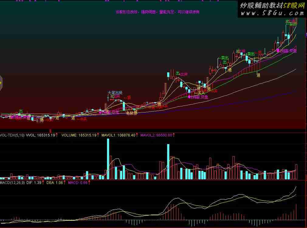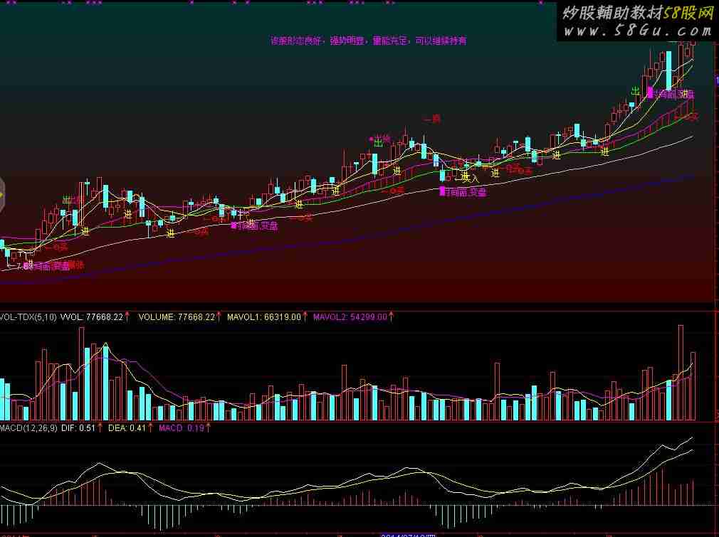 指标公式说明: 1、首先说的是,再好的指标公式也不可能解决一切问题,只是力求解决主要问题就OK了。 2、此公式包括了均线系统、进出系统、买卖点、时间窗、及主力资金的一些动向。 3、此公式包括了即时解盘系统,提供了操盘的初步建议。 4、绝无未来绝无加密,各个方面都还可以根据自身实际特点,进行进一步的优化和完善。 DRAWGBK(O>C,RGB(0,50,50),RGB(66,0,0),0,'01',0);DRAWKLINE(HIGH,OPEN,LOW,CLOSE);MA5:MA(C,5);MA6:=MA(C,6);MA10:MA(C,10);MA20:MA(C,20);A2:=REF(MA20,1);J1:=(MA20-A2)/A2*100;MJ1:=MA(J1,3);MA30:MA(C,30);MA60:MA(C,60);MA120:MA(C,120);乖离2:=(MA20-MA30)/MA30*100;VAR1:=IF(BETWEEN(乖离2,-2,5),2,0);MAX1:=MAX(MA20,MA30);MAX2:=MAX(MAX1,MA60);MIN11:=MIN(MA20,MA30);MIN2:=MIN(MIN11,MA60);K1:=(MAX2/MIN2-1)*100;{粘合度符合条件}VAR2:=IF(K1<=8,1,0);上火车轨:=MA20>MA30 AND MA20>REF(MA20,1) AND MA30>REF(MA30,1) AND MA20-MA30>REF((MA20-MA30),1) ;STICKLINE(上火车轨,MA20,MA30,0,0),COLORRED;神枪手:=DRAWTEXT(FILTER(上火车轨 AND "MACD.DIF"<0.15 AND "MACD.DIF">REF("MACD.DIF",1) AND MA(V,60)>REF(MA(V,60),1) AND MA(V,5)>MA(V,10) AND J1>REF(J1,1) AND( L<=MA20 AND C>MA20 OR (CROSS(MA5,MA20)) ),5),L*0.98,'←神枪手');神枪手选股:=FILTER(上火车轨 AND "MACD.DIF"<0.15 AND "MACD.DIF">REF("MACD.DIF",1) AND MA(V,60)>REF(MA(V,60),1) AND MA(V,5)>MA(V,10) AND J1>REF(J1,1) AND( L<=MA20 AND C>MA20 OR (CROSS(MA5,MA20)) ),5);{44.40%15240}短线暴张:DRAWTEXT(FILTER( (VAR1 OR VAR2) AND MA10>REF(MA10,1) AND COUNT(MA30>REF(MA30,1),3)=3 AND MA30>MA60 AND COUNT(CROSS(MA5,MA30),3) AND J1>MJ1 AND MA(V,5)>MA(V,60)AND MA(V,60)>REF(MA(V,60),1),5),MA60*0.99,'短线暴张'),COLORRED;DRAWTEXT(CROSS("KDJ.K"(5,2,3),"KDJ.D"(5,2,3)) AND "KDJ.D"(5,2,3)<30 AND J1>MJ1 AND MA60>REF(MA60,1) AND COUNT(J1<1,3)>=1 ,L*0.995,'←买入'),COLORYELLOW;DRAWTEXT(CROSS("KDJ.D"(5,2,3),"KDJ.K"(5,2,3)) AND "KDJ.D"(5,2,3)>65 AND J1<MJ1 AND COUNT(J1>1,3)>=1,H*1.005,'←卖出'),COLORGREEN;DRAWTEXT(CROSS("KDJ.D"(18,9,6),"KDJ.K"(18,9,6)) AND "KDJ.D"(18,9,6)>60 AND "KDJ.J"(45,15,15)>90,H*1.03,'←顶'),COLORRED;DRAWTEXT(CROSS(MA5,MA6) AND "KDJ.K"(5,3,3)>=50 AND "KDJ.J"(5,3,3)<31 ,L*0.92,'←再买'),COLORMAGENTA;XL1:=((LLV(LOW,3) = LLV(LOW,60)) AND ((CLOSE / REF(CLOSE,1)) >= 1.04));XL2:=(((CLOSE - EMA(CLOSE,21)) / EMA(CLOSE,21)) * 100);XL3:=CROSS(XL2,(0 - 20));DRAWTEXT(FILTER(((XL1 > 0) AND LOW),5),(LOW - 0.4),'●买点');DRAWTEXT((XL3 > 0),(LOW - 0.2),'●绝对底部');X6:=REF(CLOSE,1);X7:=((SMA(MAX((CLOSE - X6),0),7,1) / SMA(ABS((CLOSE - X6)),7,1)) * 100);X8:=CROSS(79,X7);X9:=FILTER(X8,4);DRAWTEXT(X9,(HIGH * 1.02),'●出货'),COLOR9000F5;STICKLINE(C>1.098*REF(C,1),C,O,0,0),COLORYELLOW;AAA:=CONST(HHV(H,90));R1:=MA(CLOSE,1);R2:=MA(CLOSE,3);R3:=(MA(R2,1)*1);R4:=(MA(R2,3)*1);DRAWTEXT(CROSS(R3,R4),(LOW-0.1),'进'),COLORYELLOW;LC:=REF(CLOSE,1);RSI:=((SMA(MAX((CLOSE - LC),0),3,1) / SMA(ABS((CLOSE - LC)),3,1)) * 100);FF:=EMA(CLOSE,3);MA15:=EMA(CLOSE,21);DRAWTEXT(CROSS(88,RSI),(HIGH * 1.02),'出'),COLORGREEN;VARE:=MA(100*(CLOSE-LLV(CLOSE,34))/(HHV(HIGH,34)-LLV(LOW,34)),5)-20;VAR12:=(HIGH+LOW+CLOSE)/3;VAR13:=(VAR12-MA(VAR12,14))/(0.015*AVEDEV(VAR12,14));VAR14:=(VAR12-MA(VAR12,70))/(0.015*AVEDEV(VAR12,70));VAR15:=IF(VAR13>=150 AND VAR13<200 AND VAR14>=150 AND VAR14<200,10,0);VAR16:=IF(VAR13<=-150 AND VAR13>-200 AND VAR14<=-150 AND VAR14>-200,-10,VAR15);VAR17:=(CLOSE-MA(CLOSE,13))/MA(CLOSE,13)*100;VAR18:=100-ABS(VAR17);VAR19:=IF(VAR18<90,VAR18,100);VAR1A:=IF(VARE>0,VARE,0);VAR1B:=IF(VAR14>=200 AND VAR13>=150,15,IF(VAR14<=-200 AND VAR13<=-150,-15,VAR16))+60;VAR1C:=VAR1A>48 AND VAR1B>60 AND VAR19<100;DRAWTEXT(VAR1C AND COUNT(VAR1C,30)=1,HIGH*1.02,'大笔出货'),LINETHICK1,COLORFFCC66;AA1:=AMOUNT/V;BB1:=L<AA1*0.9;CC1:=(C-REF(C,1))/REF(C,1)*100>1.2;DD1:=L<MA(C,5)*0.921;EE1:=V<MA(V,5)*1.5;老鼠仓:=BB1 AND CC1 AND DD1 AND EE1,LINETHICK0;DRAWTEXT(老鼠仓,(LOW* 0.99),'老鼠仓'),COLOR40CCFF;A74:=MA(CLOSE,20);A75:=(CLOSE > MA(CLOSE,5));A76:=(MA(CLOSE,5) > MA(CLOSE,10));A77:=(CLOSE > MA(CLOSE,10));A78:=(MA(CLOSE,5) > MA(CLOSE,20));A79:=(CLOSE > MA(CLOSE,20));A710:=REF(A74,1);A711:=(A74 > A710);AVX:=(((((IF(A75,10,(0 - 10)) + IF(A76,10,(0 - 10))) + IF(A77,10,(0 - 10)))+ IF(A78,10,(0 - 10))) + IF(A79,10,(0 - 10))) + IF(A711,10,(0 - 10)));DSLX:=(CLOSE / INDEXC);DSLX1:=MA(DSLX,5);DSLX2:=MA(DSLX,10);V1:=MA(VOL,5);V2:=MA(VOL,10);T1:=CONST(IF(C<200 AND ((CROSS(AVX,1) AND (V1 >= V2)) AND (DSLX >= DSLX1)),1,0));T2:=CONST(IF(C<200 AND ((CROSS(AVX,1) AND (V1 < V2)) AND (DSLX >= DSLX1)),1,0));T3:=CONST(IF(C<200 AND ((CROSS(AVX,1) AND (V1 > V2)) AND (DSLX < DSLX1)),1,0));T4:=CONST(IF(C<200 AND ((CROSS(AVX,1) AND (V1 <= V2)) AND (DSLX < DSLX1)),1,0));T5:=CONST(IF(C<200 AND ((CROSS(1,AVX) AND (V1 >= V2)) AND (DSLX >= DSLX1)),1,0));T6:=CONST(IF(C<200 AND ((CROSS(1,AVX) AND (V1 < V2)) AND (DSLX >= DSLX1)),1,0));T7:=CONST(IF(C<200 AND ((CROSS(1,AVX) AND (V1 >= V2)) AND (DSLX < DSLX1)),1,0));T8:=CONST(IF(C<200 AND ((CROSS(1,AVX) AND (V1 < V2)) AND (DSLX < DSLX1)),1,0));T9:=CONST(IF(C<200 AND ((((AVX >= 1) AND (REF(AVX,1) > 0)) AND (V1 >= V2)) AND (DSLX >= DSLX1)),1,0));T10:=CONST(IF(C<200 AND ((((AVX >= 1) AND (REF(AVX,1) > 0)) AND (V1 < V2)) AND (DSLX >= DSLX1)),1,0));T11:=CONST(IF(C<200 AND ((((AVX >= 1) AND (REF(AVX,1) > 0)) AND (V1 >= V2)) AND (DSLX < DSLX1)),1,0));T12:=CONST(IF(C<200 AND ((((AVX >= 1) AND (REF(AVX,1) > 0)) AND (V1 < V2)) AND (DSLX < DSLX1)),1,0));T13:=CONST(IF(C<200 AND ((((AVX < 1) AND (REF(AVX,1) < 0)) AND (V1 >= V2)) AND (DSLX >= DSLX1)),1,0));T14:=CONST(IF( C<200 AND ((((AVX < 1) AND (REF(AVX,1) < 0)) AND (V1 < V2)) AND (DSLX >= DSLX1)),1,0));T15:=CONST(IF(C<200 AND ((((AVX < 1) AND (REF(AVX,1) < 0)) AND (V1 >= V2)) AND (DSLX < DSLX1)),1,0));T16:=CONST(IF(C<200 AND ((((AVX < 1) AND (REF(AVX,1) < 0)) AND (V1 < V2)) AND (DSLX < DSLX1)),1,0));T17:=CONST(IF(C>200 AND (CROSS(AVX,1) AND (V1 >= V2)),1,0));T18:=CONST(IF(C>200 AND (CROSS(AVX,1) AND (V1 >= V2)),1,0));T19:=CONST(IF(C>200 AND (CROSS(AVX,1) AND (V1 < V2)),1,0))