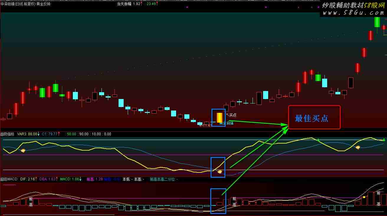 此指标是观察论坛一高人指标仿出来的,既然是仿那就一定不一样,但原理上差不多就行了。 分享一个原理给大家,把极品MACD指标中(12.26.9)改成(6,13,5),MACD见红,然后趋势指标出现金钻的当天涨幅大于7个点或涨停,此为最佳买点DRAWGBK(O>C,RGB(0,50,50),RGB(66,0,0),0,'01',0);VAR1:=(CLOSE-MA(CLOSE,55))/MA(CLOSE,55)*100;VAR2:=(CLOSE-LLV(LOW,20))/(HHV(HIGH,20)-LLV(LOW,20))*100;VAR3:SMA(VAR2,2,1),COLORYELLOW,LINETHICK2;A1:=SMA(VAR3,2,1);B1:=(A1-((VAR2-A1)*VAR2-A1)/A1);C1:SMA(B1,5,1),COLORFFAA00;DRAWICON(CROSS(VAR3,C1),C1,26);DRAWICON(CROSS(90,VAR3),VAR3,2);50;90,COLORWHITE;10,COLORWHITE;0;
