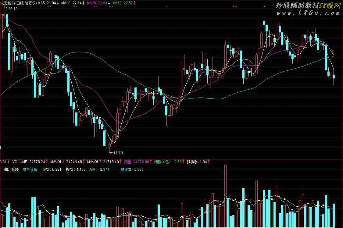 TOTAL:=IF(PERIOD=1,5,IF(PERIOD=2,15,IF(PERIOD=3,30,IF(PERIOD=4,60,IF(PERIOD=5,TOTALFZNUM,1))))); MTIME:=MOD(FROMOPEN,TOTAL); CTIME:=IF(MTIME<0.5,TOTAL,MTIME); VVOL:=IF(CURRBARSCOUNT=1,VOL*TOTAL/CTIME,DRAWNULL),NODRAW; STICKLINE(CURRBARSCOUNT=1,VVOL,0,-1,-1),COLOR00C0C0; VOLUME:VOL,VOLSTICK; MAVOL1:MA(VOLUME,5); MAVOL2:MA(VOLUME,10); 预量:ROUND(IF(CURRBARSCOUNT=1,VOL*TOTAL/CTIME,VOL)),COLORYELLOW,LINETHICK; 预额(亿):IF(CURRBARSCOUNT=1,AMOUNT*TOTAL/CTIME/100000000,AMOUNT/100000000),COLOR0000FF,LINETHICK; 预换手:预量/CAPITAL*100,COLORYELLOW; DRAWTEXT_FIX(C>0,0.01,0.03,0,DYBLOCK),COLORYELLOW; DRAWTEXT_FIX(C>0,0.065,0.03,0,HYBLOCK),COLORCYAN; DRAWTEXT_FIX(C>0,0.12,0.03,0,'收益 :'),COLORYELLOW; DRAWNUMBER_FIX(C>0,0.15,0.03,0,FINANCE(38)),COLORYELLOW; DRAWTEXT_FIX(C>0,0.19,0.03,0,'权益 :'),COLORYELLOW; DRAWNUMBER_FIX(C>0,0.22,0.03,0,FINANCE(34)),COLORYELLOW; DRAWTEXT_FIX(C>0,0.26,0.03,0,'A股 :'),COLORCYAN; DRAWNUMBER_FIX(C>0,0.29,0.03,0,CAPITAL/1000000),COLORCYAN; DRAWTEXT_FIX(C>0,0.35,0.03,0,'总股本 :'),COLORCYAN; DRAWNUMBER_FIX(C>0,0.39,0.03,0,TOTALCAPITAL/1000000),COLORCYAN; |