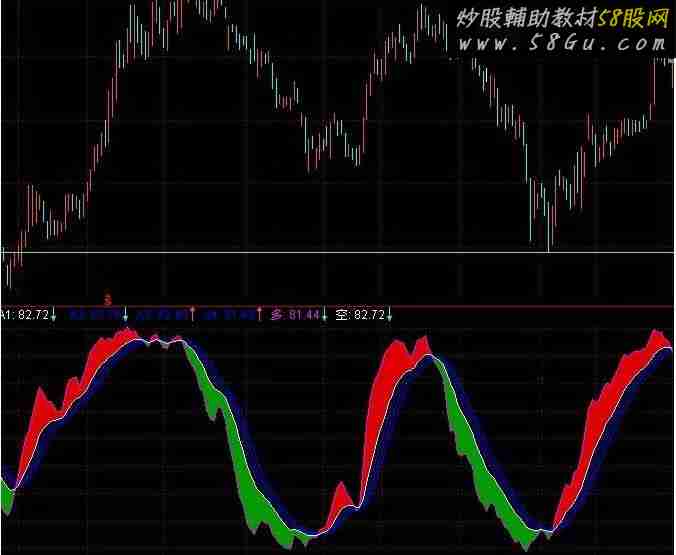 Q1:=(CLOSE-REF(CLOSE, 1))/REF(CLOSE, 1)*100; Q2:=(CLOSE-LLV(LOW, 18))/(HHV(HIGH, 18)-LLV(LOW, 18))*100; Q3:=SMA(Q2, 9, 1); Q4:=SMA(Q3, 3, 1); AA:3*Q3-2*Q4,COLORFF00FF; Q5:=AA>1*REF(AA, 1); Q6:=LLVBARS(LOW, 50); Q7:=SUM(VOL, Q6); Q8:=HHVBARS(HIGH, 50); Q9:=SUM(VOL, Q8); Q10:=(CLOSE-REF(OPEN, Q8))/REF(OPEN, Q8)*100; Q11:=HHV(AA,5); A1:EMA(Q3, 3),COLORFFFFFF,LINETHICK1; DRAWBAND(AA,RGB(220,0,0),A1,RGB(0,155,0)); A2:EMA(A1, 3),COLORFF0000,LINETHICK1; A3:EMA(A2, 3),COLORFF0000,LINETHICK1; A4:EMA(A3, 3),COLORFF0000,LINETHICK1; 多:3*Q3-2*Q4,COLORFF00FF,LINETHICK1; 空:EMA(Q3, 3),COLORFFFFFF,LINETHICK1; |