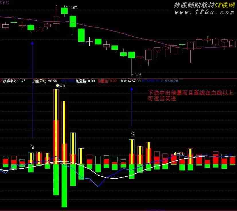 A股:CAPITAL/1000000,LINETHICK0,COLORWHITE; 实际量:VOL,LINETHICK0; AA:=VOL/((HIGH-LOW)*2-ABS(CLOSE-OPEN)); 主买:IF(CLOSE>OPEN,AA*(HIGH-LOW),IF(CLOSE<OPEN,AA*((HIGH-OPEN)+(CLOSE-LOW)),VOL /2)),POINTDOT,COLORRED; 主卖:IF(CLOSE>OPEN,0-AA*((HIGH-CLOSE)+(OPEN-LOW)),IF(CLOSE<OPEN,0-AA*(HIGH-LOW),0-VOL /2)),LINETHICK0,COLORGREEN; 换手率%:VOL/CAPITAL*100,POINTDOT,COLORWHITE; STICKLINE(C>=REF(C,1) ,0,VOL,2.5,1),COLORRED; STICKLINE(C<REF(C,1),0,VOL,2.5,1),COLORGREEN; STICKLINE(主买>0,0,主买,2.5,0),COLORRED; STICKLINE(主卖<0 ,0,主卖,2.5,0),COLORGREEN; 资金异动:VOL/MA(VOL,55)*100,COLORYELLOW; STICKLINE(资金异动>100 ,0,VOL,0.6,0),COLORYELLOW; MA5:=MA(V,5),COLORWHITE; MA13:=MA(V,13),COLORRED; DRAWTEXT(CROSS(MA5,MA13),(V *1.05),'★关注'),COLORYELLOW;T:=DYNAINFO(8)>0; VO:VOL=LLV(VOL,100) AND T; 地量柱:T AND VO; DRAWTEXT(地量柱,VOL+3000,'地'); BLZ:=VOL>REF(V,1)*1.9; BLZ1:=VOL<REF(LLV(VOL,13),1); BLZ2:=VOL<REF(LLV(VOL,55),1); 倍量柱:BLZ; DRAWTEXT(倍量柱,VOL+3000,'倍'); FLZ:=V>REF(V,1)*0.98 AND V<REF(V,1)*1.02,LINETHICK0; DRAWTEXT(FLZ,VOL+3000,'平'); AAA:=V/((H-L)*2-ABS(C-O)); BUY:=IF(C>O,AAA*(H-L),IF(C<O,AAA*((H-L)-(O-C)),V/2)); SELL:=(V-BUY); MS:=MA((BUY-SELL),5)*2; MM:MA(MS,5),COLORWHITE,LINETHICK2; F:=BACKSET(MS>REF(MS,1),2); E:=BACKSET(MS<REF(MS,1),2); R:IF(F,MS,DRAWNULL),COLORFF0000,LINETHICK2; G:IF(E,MS,DRAWNULL),COLORFF7F00,LINETHICK2; |
