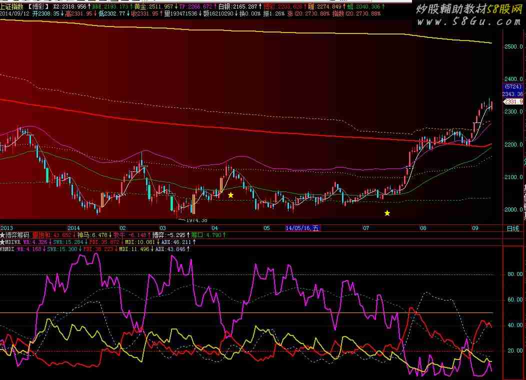 此指标为WR+MDI指标的组合,本人对WR进行了较大的变动,MDI对参数进行调整。把二个指标组合一起后就变成了一个指标,三条加粗线是主要运用线,三条数值线为判断线。具体用法从图一看便知。对于判别顶底,主升和盘整会有所帮助。源码为通达信,贴图为飞狐。STICKLINE(C>0,20,20,1,0),COLORRED;STICKLINE(C>0,50,50,10,0),COLOR0099FF;STICKLINE(C>0,80,80,1,0),COLOR00bb00;WR1:=100*(HHV(H,21)-C)/(HHV(H,21)-LLV(L,21));WR2:=100*(HHV(H,42)-C)/(HHV(H,42)-LLV(L,42));WR3:=100*(HHV(H,63)-C)/(HHV(H,63)-LLV(L,63));WR4:=100*(HHV(H,84)-C)/(HHV(H,84)-LLV(L,84));WR5:=100*(HHV(H,105)-C)/(HHV(H,105)-LLV(L,105));WR6:=100*(HHV(H,126)-C)/(HHV(H,126)-LLV(L,126));WR:(WR1+WR2+WR3+WR4+WR5+WR6)/6,COLORMAGENTA,LINETHICK2;swr:sMA(wr,21,1),COLORAAAA00,DOTLINE;KC:=MAX(MAX(ABS(H-L),ABS(H-REF(C,1))),ABS(REF(C,1)-L));MTR:=EMA(KC+SLOPE(KC,21),21);HD :=H-REF(H,1);LD :=REF(L,1)-L;DMP:=EMA(IF(HD>0&&HD>LD,HD,0)+SLOPE(IF(HD>0&&HD>LD,HD,0),21),21);DMM:=EMA(IF(LD>0&&LD>HD,LD,0)+SLOPE(IF(LD>0&&LD>HD,LD,0),21),21);PDI:DMP*100/MTR,COLORRED,LINETHICK2;MDI:DMM*100/MTR,COLOR00CCCC,LINETHICK2;MG:=ABS(PDI-MDI)/(MDI+PDI)*100;ADX:EMA(MG+SLOPE(MG,14),14),COLORFFCCAA,DOTLINE; |