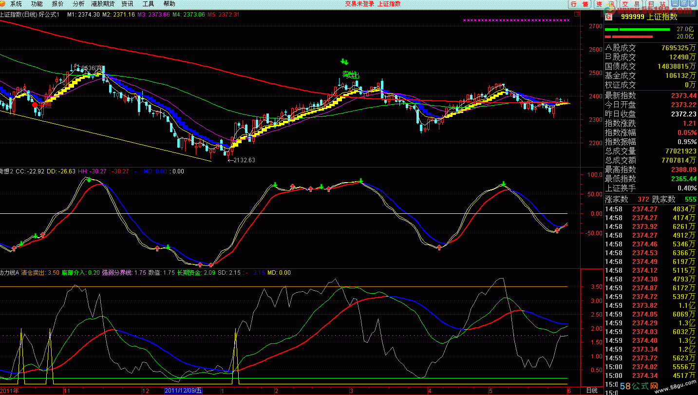 VAR2:=LLV(LOW,10); VAR3:=HHV(HIGH,25); 阶段卖出:=3.2,COLORCYAN;清仓卖出: 3.5,COLOR0088FF; 动力线:= EMA((CLOSE-VAR2)/(VAR3-VAR2)*4,4);底部介入:0.2,COLORGREEN; 重点关注:=0.5,COLOR0FFFFF; 强弱分界线:1.75,POINTDOT,LINETHICK2,COLORFF80FF; 数值:动力线,COLORA8A8A8; VAR1:=1; VAR6:=((((2*CLOSE)+HIGH)+LOW) / 4); VAR10:=LLV(LOW,55); VAR11:=HHV(HIGH,55); 长期资金:EMA(EMA((EMA((((VAR6-VAR10)/(VAR11-VAR10))*100),4)*VAR1),3),2)/26,COLORGREEN; SD:EMA(长期资金,17); IF(SD>REF(SD,1),SD,DRAWNULL),COLORRED,LINETHICK2; IF(SD<REF(SD,1),SD,DRAWNULL),COLORBLUE,LINETHICK2; QUANA:=(CLOSE-DMA(CLOSE,VOL/SUM(VOL,13)))/DMA(CLOSE,VOL/SUM(VOL,13))*100; AA5:=2*EMA(EMA(QUANA,13),5); BB1:=2*EMA(EMA(QUANA,13),13);MD:IF(动力线>长期资金 AND 动力线>SD AND CROSS(长期资金,SD) AND SD<1.2 AND AA5>REF(AA5,1) AND AA5>BB1,2,0);