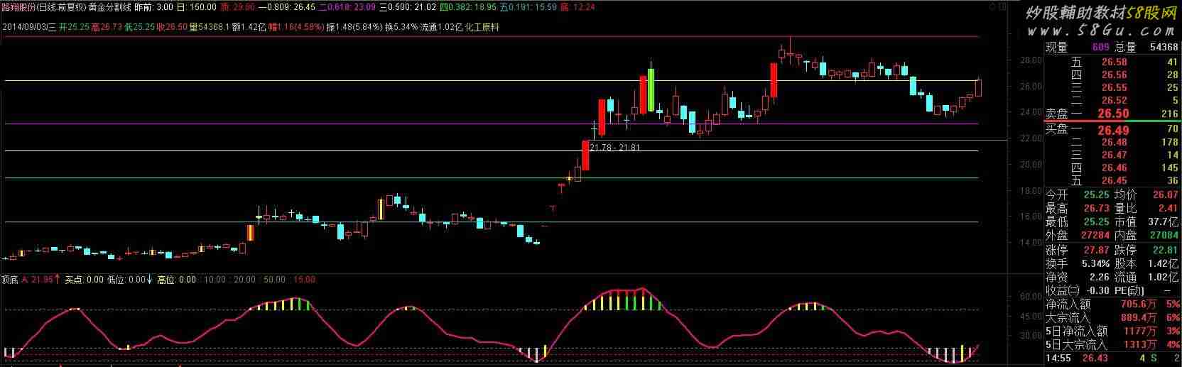 指标是工具,不可完全依赖。非原创。优化。 WL:=(HHV(H,8)-C)/(HHV(H,8)-LLV(L,8))*100-70; MWL:=SMA(WL,8,1); RSV:=(C-LLV(L,8))/(HHV(H,8)-LLV(L,8))*100; K:=SMA(RSV,3,1); D:=SMA(K,3,1); DKC:=(D+100)-(MWL+100); GL:=((C-MA(C,6))/MA(C,6)*200)+20,COLORGREEN; A:DKC/2,COLORLIMAGENTA,LINETHICK2; 买点:REF(A<20,1)AND A>REF(A,1)AND CROSS(GL,19.5),COLORYELLOW,NODRAW; 低位:A<20,COLORLIGRAY,NODRAW; 高位:A>50,COLORYELLOW,NODRAW; 10,COLORGRAY,DOTLINE; 20,COLORGRAY,DOTLINE; 50,COLORBROWN,DOTLINE; 15,COLORRED,DOTLINE; STICKLINE(A>50,50,A,0.1,0),COLORYELLOW; STICKLINE(A>50 AND A<REF(A,1),50,A,0.1,0),COLORGREEN; STICKLINE(A>60,60,A,0.1,0),COLORRED; STICKLINE(A<20,20,A,0.1,0),COLORLIGRAY; STICKLINE(A<20 AND A>REF(A,1),20,A,0.1,0),COLORLIRED; STICKLINE(A<10,10,A,0.1,0),COLORWHITE; STICKLINE(买点=1,22,A,0.1,0),COLORYELLOW;