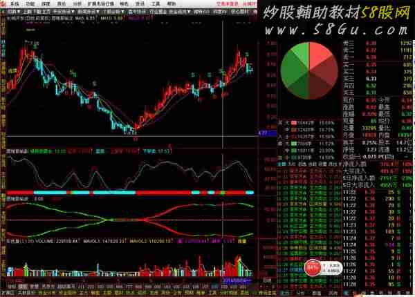 使用方法:主图立体,简洁,B点买入S点卖出,红色持股绿色持币。配合副图,绿色横条区域很敏感,为观望区,此时的BS点一般都无效,反复探底,洗盘,一般都在绿横条处,必须是红色蓝色区域的BS点才有效。结合指标一般用30分周期反复确认抄底,60分周期做日常买卖决策。做中线用日K线周期。图中有些红K线中有一根细蓝竖线,表示当天收阴,蓝K线有时会有细红线,表示当天收阳。 两根线,上穿买下穿卖,主图如果有B点提示买,但副图两根线是死状态,不买;同样,主图有S点提示卖但副图两根线是金叉状态,不卖,但如果此时有绿横条出来了,说明主力震仓,风险将至,为使利润最大化,随时准备离场观望。 另外一个副图也是一看就明白,长短兼顾,红持股绿持币观望。上下两条线将合并时预示新的一波行情将到来,反之两条线到顶/底,风险将至,须保持警惕!这个指标要慢慢体会熟练后使用做波段还不错的。 {主图源码}{愿赌服输BS} MA5:MA(C,5); MA10:MA(C,10); MA20:MA(C,20); VAR1:=(CLOSE+HIGH+LOW)/3; VAR2:=EMA(VAR1,10); VAR3:=REF(VAR2,1); STICKLINE((VAR2>VAR3),CLOSE,OPEN,2.8,0),COLOR000088; STICKLINE((VAR2>VAR3),CLOSE,OPEN,2.6,0),COLOR000099; STICKLINE((VAR2>VAR3),CLOSE,OPEN,2.4,0),COLOR0000AA; STICKLINE((VAR2>VAR3),CLOSE,OPEN,2.2,0),COLOR0000BB; STICKLINE((VAR2>VAR3),CLOSE,OPEN,2.0,0),COLOR0000CC; STICKLINE((VAR2>VAR3),CLOSE,OPEN,1.8,0),COLOR0000DD; STICKLINE((VAR2>VAR3),CLOSE,OPEN,1.5,0),COLOR0000EE; STICKLINE((VAR2>VAR3),CLOSE,OPEN,1,0),COLOR0000FF; STICKLINE((VAR2>VAR3),LOW,HIGH,0.0,0),COLOR0000FF; STICKLINE((VAR3>VAR2),CLOSE,OPEN,2.8,0),COLOR888800; STICKLINE((VAR3>VAR2),CLOSE,OPEN,2.6,0),COLOR999900; STICKLINE((VAR3>VAR2),CLOSE,OPEN,2.4,0),COLORAAAA00; STICKLINE((VAR3>VAR2),CLOSE,OPEN,2,2),COLORBBBB00; STICKLINE((VAR3>VAR2),CLOSE,OPEN,2.0,0),COLORCCCC00; STICKLINE((VAR3>VAR2),CLOSE,OPEN,1.8,0),COLORDDDD00; STICKLINE((VAR3>VAR2),CLOSE,OPEN,1.5,0),COLOREEEE00; STICKLINE((VAR3>VAR2),CLOSE,OPEN,1,0),COLORFFFF00; STICKLINE((VAR3>VAR2),LOW,HIGH,0.0,0),COLORFFFF00; STICKLINE((OPEN>CLOSE),CLOSE,OPEN,0,0),COLORFFFF00; STICKLINE((OPEN<CLOSE),CLOSE,OPEN,0,0),COLORRED; C4:=CROSS(VAR2,VAR3); C5:=CROSS(VAR3,VAR2); DRAWICON(C4,LOW-0.2,7); DRAWICON(C5,HIGH+0.2,8); A1AA:=9; A2AA:=(REF(CLOSE,A1AA+1)<CLOSE); DRAWTEXT(FILTER((A2AA>-0.5),84),(HIGH)*(1.03),'小心变盘'),COLORFFFFFF; DRAWTEXT(CROSS(83,RSI),H*1.04,' 逃顶')COLORYELLOW;
