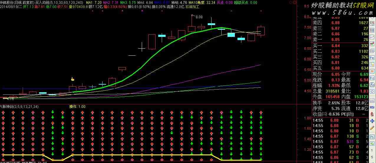 {N1=1;N2=5;N3=9;N4=13;N5=21;N6=34}DIFF:=EMA(CLOSE,N3)-EMA(CLOSE,N4);DEA:=EMA(DIFF,N2);DRAWICON(DIFF>DEA,1,1);DRAWICON(DIFF<DEA,1,2);{DRAWTEXT(ISLASTBAR=1,1,'.MACD'),COLORFFFFFF;}A1:=DIFF>DEA;RSV1:=(CLOSE-LLV(LOW,N3))/(HHV(HIGH,N3)-LLV(LOW,N3))*100;K:=SMA(RSV1,N1,1);D:=SMA(K,N1,1);DRAWICON(K>D,1.1,1);DRAWICON(K<D,1.1,2);{DRAWTEXT(ISLASTBAR=1,1.1,'.KDJ'),COLORFFFFFF;}A2:=K>D;LC:=REF(CLOSE,1);RSI1:=(SMA(MAX(CLOSE-LC,0),N2,1))/(SMA(ABS(CLOSE-LC),N2,1))*100;RSI2:=(SMA(MAX(CLOSE-LC,0),N4,1))/(SMA(ABS(CLOSE-LC),N4,1))*100;DRAWICON(RSI1>RSI2,1.2,1);DRAWICON(RSI1<RSI2,1.2,2);{DRAWTEXT(ISLASTBAR=1,1.2,'.RSI'),COLORFFFFFF;}A3:=RSI1>RSI2;RSV:=-(HHV(HIGH,N4)-CLOSE)/(HHV(HIGH,N4)-LLV(LOW,N4))*100;LWR1:=SMA(RSV,N1,1);LWR2:=SMA(LWR1,N1,1);DRAWICON(LWR1>LWR2,1.3,1);DRAWICON(LWR1<LWR2,1.3,2);{DRAWTEXT(ISLASTBAR=1,1.3,'.LW&R'),COLORFFFFFF;}A4:=LWR1>LWR2;BBI:=(MA(CLOSE,N1)+MA(CLOSE,N2)+MA(CLOSE,N3)+MA(CLOSE,N4))/4;DRAWICON(CLOSE>BBI,1.4,1);DRAWICON(CLOSE<BBI,1.4,2);{DRAWTEXT(ISLASTBAR=1,1.4,'.BBI'),COLORFFFFFF;}A5:=CLOSE>BBI;MTM:=CLOSE-REF(CLOSE,1);MMS:=100*EMA(EMA(MTM,N2),N1)/EMA(EMA(ABS(MTM),N2),N1);MMM:=100*EMA(EMA(MTM,N4),N3)/EMA(EMA(ABS(MTM),N4),N3);DRAWICON(MMS>MMM,1.5,1);DRAWICON(MMS<MMM,1.5,2);{DRAWTEXT(ISLASTBAR=1,1.5,'.ZLMM'),COLORFFFFFF;}A6:=MMS>MMM;BIAS:=(C-MA(C,N2))/MA(C,N2);DIF:=(BIAS-REF(BIAS,16));DBCD:=SMA(DIF,76,1);MM:=MA(DBCD,5);DRAWICON(DBCD>MM ,1.6,1);DRAWICON(DBCD<MM,1.6,2);{DRAWTEXT(ISLASTBAR=1,1.6,'.DBCD'),COLORFFFFFF;}A7:=DBCD>MM;持股:=3*SMA((CLOSE-LLV(LOW,27))/(HHV(HIGH,27)-LLV(LOW,27))*100,5,1)-2*SMA(SMA((CLOSE-LLV(LOW,27))/(HHV(HIGH,27)-LLV(LOW,27))*100,5,1),3,1),LINETHICK0,COLORRED;支撑:=LLV(持股,3),LINETHICK0,COLOR00FFFF;下跌:=MA(持股,12),COLOR6B8E23,LINETHICK0;转向:=CROSS(持股,下跌){ AND 下跌<30};MA1:=MA(持股,5);向下:=CROSS(MA1,持股) AND MA1>80;DRAWICON(持股>下跌 ,1.7,1);DRAWICON(持股<下跌,1.7,2);{DRAWTEXT(ISLASTBAR=1,1.7,'.CGZ'),COLORFFFFFF;}A8:=持股>下跌;MT:=C-REF(C,1);ZLGJ:=100*EMA(EMA(MT,N3),N3)/EMA(EMA(ABS(MT),N3),N3);MAZL:=MA(ZLGJ,5);DRAWICON(ZLGJ>MAZL,1.8,1);DRAWICON(ZLGJ<MAZL,1.8,2);A9:=ZLGJ>MAZL;{DRAWTEXT(ISLASTBAR=1,1.8,'.ZLGJ'),COLORFFFFFF;}PJJ:=DMA((HIGH+LOW+CLOSE*2)/4,0.9);JJ:=REF(EMA(PJJ,3),1);QJJ:=VOL/((HIGH-LOW)*2-ABS(CLOSE-OPEN));XVL:=IF(CLOSE>OPEN,QJJ*(HIGH-LOW),IF(CLOSE<OPEN,QJJ*(HIGH-OPEN+CLOSE-LOW),VOL/2))+IF(CLOSE>OPEN,0-QJJ*(HIGH-CLOSE+OPEN-LOW),IF(CLOSE<OPEN,0-QJJ*(HIGH-LOW),0-VOL/2));HSL:=(XVL/20)/1.15;攻击流量:=((HSL*0.55+(REF(HSL,1)*0.33))+(REF(HSL,2)*0.22));GJJ:=EMA(攻击流量,8);LLJX:=EMA(攻击流量,3);资金流量:=LLJX,LINETHICK0,COLOR0000FF;DRAWICON(资金流量>0,1.95,1);DRAWICON(资金流量<0,1.95,2);A10:=资金流量>0;{DRAWTEXT(ISLASTBAR=1,1.89,'.ZJL'),COLORFFFFFF;}指导线:=(A1+A2+A3+A4+A5+A6+A7+A8+A9+A10),LINETHICK0,COLORFFFF00;操作:IF(指导线 >6 ,1.1,1),LINETHICK3,COLORYELLOW;   |