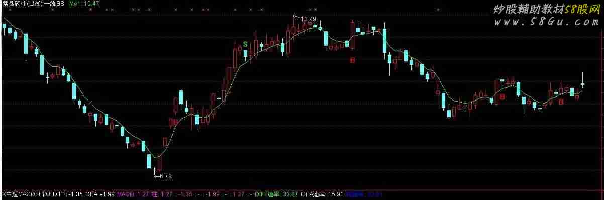 MTM:=C-REF(C,1); DX:=100*EMA(EMA(MTM,6),6)/EMA(EMA(ABS(MTM),6),6); 卖:=IF(HHV(DX,2)=HHV(DX,7) AND COUNT(DX>50,2) AND CROSS(MA(DX,2),DX),1,0); DRAWICON(FILTER(卖=1,1),HIGH*1.02,8); 买入:=(MA(CLOSE,3)+MA(CLOSE,6)+MA(CLOSE,12)+MA(CLOSE,24))/4,COLOR0000FF; MA1:SMA(C,3,1),COLORGREEN; DRAWICON(CROSS(MA1,买入),L*0.96,7);