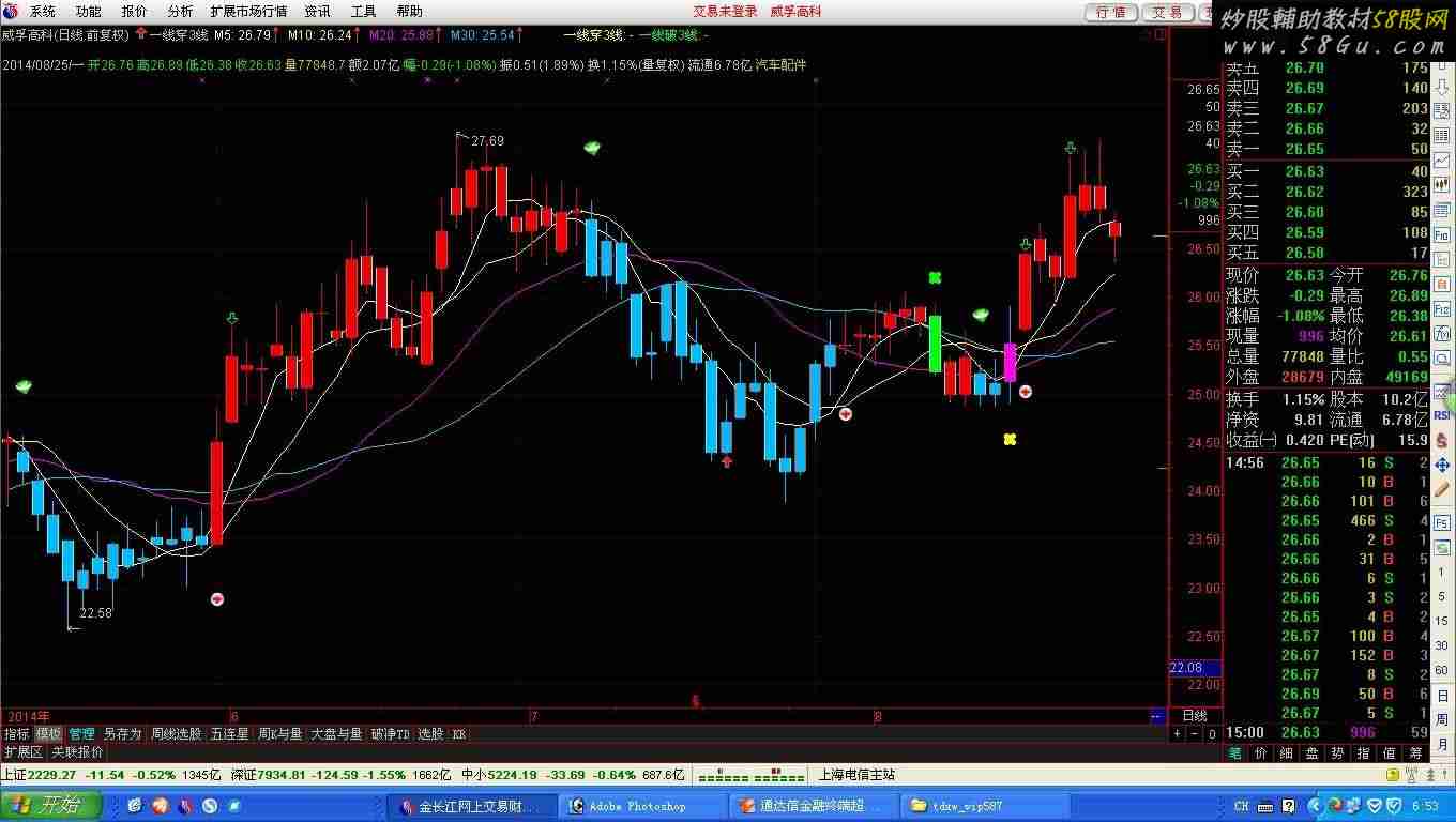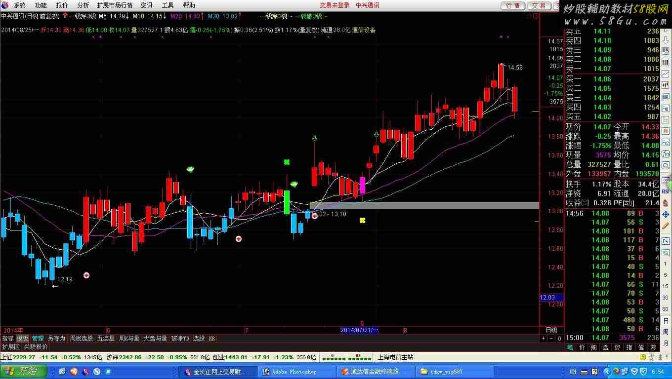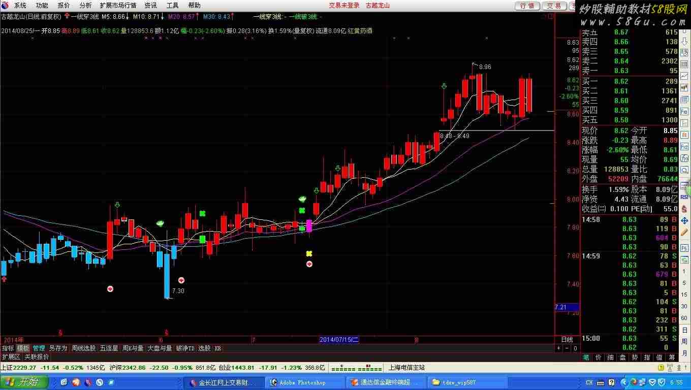 {一线穿3短线} LC:=REF(C,1); M5:MA(C,5); M10:MA(C,10); M20:MA(C,20); M30:MA(C,30),COLORFFCC00; VAR1:=EMA(EMA(C,9),9); 控盘:=(VAR1-REF(VAR1,1))/REF(VAR1,1)*1000; EEM8:=EMA(EMA(C,8),8); 资金:=(EEM8-REF(EEM8,1))/REF(EEM8,1)*1000; 有庄:=资金>0; 无庄:=资金<=0; 买线:=EMA(C,3); 卖线:=EMA(SLOPE(C,22)*20+C,54); BU1:=CROSS(买线,卖线); SEL1:=CROSS(卖线,买线); BU2:=IFF(BU1 AND 有庄,1,IFF(COUNT(BU1 AND 无庄,BARSLAST(SEL1)+1)=1 AND CROSS(资金,0),1,0)); BU:=BU2 AND COUNT(BU2,BARSLAST(SEL1)+1)=1; SEL:=SEL1 AND COUNT(SEL1,BARSLAST(BU)+1)=1; 止损A:=C/REF(O,BARSLAST(BU))<0.93 AND COUNT(BU,BARSLAST(BU)+1)=1 AND COUNT(SEL,BARSLAST(BU)+1)=0; SELNEW:=IFF(止损A AND COUNT(止损A,BARSLAST(BU)+1)=1,1,IFF(SEL AND COUNT(止损A,BARSLAST(BU)+1)=0,1,0)); 重买:=COUNT(止损A,BARSLAST(BU)+1)>=1 AND CROSS(C,0.965*REF(O,BARSLAST(BU))); 不一天:=(重买 AND SELNEW)=0; BUNEW2:=(BU OR 重买) AND 不一天; 止损B:=(C/REF(O,BARSLAST(重买))<-0.06 AND COUNT(重买,BARSLAST(重买)+1)=1 AND COUNT(SEL,BARSLAST(重买)+1)=0); 重卖:=(SEL AND COUNT(重买,BARSLAST(BUNEW2)+1)=1) OR (止损B AND SUM(止损B,0)=1); 不一天2:=((重卖 AND BUNEW2)=0); SELNEW2:=((SELNEW AND COUNT(SELNEW,BARSLAST(BUNEW2)+1)=1) OR 重卖) AND 不一天2; BUNEW3:=BUNEW2 AND COUNT(BUNEW2,BARSLAST(SELNEW2)+1)=1; SELNEW3:=SELNEW2 AND COUNT(SELNEW2,BARSLAST(BUNEW3)+1)=1; D:=BARSLAST(BUNEW3)+1>=1 AND COUNT(SELNEW3,BARSLAST(BUNEW3)+1)=0; K:=BARSLAST(SELNEW3)+1>=1 AND COUNT(BUNEW3,BARSLAST(SELNEW3)+1)=0; 修正定位:=IFF(COUNT(SELNEW3,BARSCOUNT(C))=0 AND COUNT(BUNEW3,BARSCOUNT(C))=0,1,0); 修正累计:=SUM(修正定位,1000)+1; 精准修正累计:=IFF(修正累计=REF(修正累计,1) AND REF(修正累计,2)<修正累计,修正累计,0); 上市修正B:=修正定位 AND CROSS(控盘,0); 上市修正S:=修正定位 AND CROSS(0,控盘) AND COUNT(上市修正B,BARSLAST(C>0))>=1; 上市D:=COUNT(上市修正B,BARSLAST(上市修正B)+1)=1 AND COUNT(上市修正S,BARSLAST(上市修正B)+1)=0 AND COUNT (SELNEW3,BARSCOUNT(C))=0; 上市K:=COUNT(上市修正S,BARSLAST(上市修正S)+1)=1 AND COUNT(上市修正B,BARSLAST(上市修正S)+1)=0 AND COUNT (BUNEW3,BARSCOUNT(C))=0; SSXZBZS:=COUNT(上市修正B,BARSCOUNT(C)); SSXZSZS:=COUNT(上市修正S,BARSCOUNT(C)); QB:=IFF(修正定位,上市修正B,BUNEW3); QS:=IFF(修正定位,上市修正S AND (SSXZBZS==SSXZSZS AND SSXZBZS>=0 AND COUNT(SELNEW3,BARSCOUNT(C))=1 AND COUNT (BUNEW3,BARSCOUNT(C))=0)=0, SELNEW3 AND (SSXZBZS=SSXZSZS AND SSXZBZS>=0 AND COUNT(SELNEW3,BARSCOUNT(C))=1 AND COUNT (BUNEW3,BARSCOUNT(C))=0)=0); K补:=(COUNT(上市修正B,BARSLAST(C>0))=0 AND COUNT(QB,BARSLAST(C>0))==0)==0; STICKLINE(D OR 上市D,H,L,0,0),COLOR0000EE; STICKLINE(D OR 上市D,C,O,2,0),COLOR0000EE; STICKLINE((K AND K补) OR 上市K,H,L,0,0),COLORFFBB00; STICKLINE((K AND K补) OR 上市K,C,O,2,0),COLORFFBB00;DRAWICON(QB,L*0.975,23); DRAWICON(QS,H*1.02,27); 一线穿3线:IF(C>MAX(M5,MAX(M10,MIN(M20,M30))) AND LC<=(MIN(REF(M5,1),MIN(REF(M10,1), MAX(REF(M20,1),REF(M30,1))))),L*0.985,DRAWNULL),COLOR00FFFF,LINETHICK6,CROSSDOT; 一线破3线:IF(C<MIN(M5,MIN(M10,MAX(M20,M30))) AND LC>=(MAX(REF(M5,1),MAX(REF(M10,1), MIN(REF(M20,1),REF(M30,1))))),H*1.01,DRAWNULL),COLOR00FF00,LINETHICK6,CROSSDOT; STICKLINE(一线穿3线=L*0.985,C,O,2,0),COLORFF00FF; STICKLINE(一线破3线=H*1.01,C,O,2,0),COLOR00FF00;