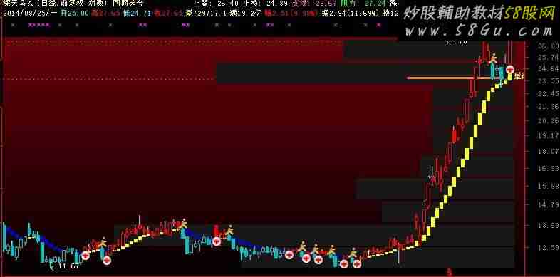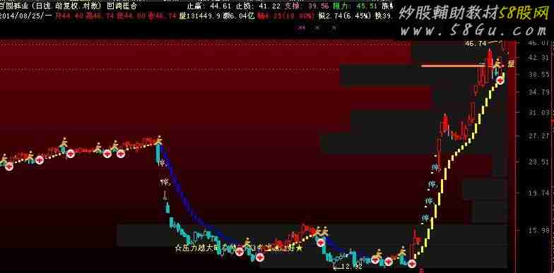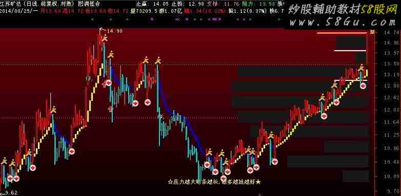 DRAWGBK(O>C,RGB(360,0,10),RGB(10,0,1),0,'01',0);CC:IF(CURRBARSCOUNT<18,CONST(REF(C,1)),DRAWNULL),COLOR000000; 止赢:1.05*CC,COLORFFFFFF,LINETHICK2; 止损:0.97*CC,COLORFFFFFF,LINETHICK2;V1:=ABS((2*CLOSE+HIGH+LOW)/4-MA(CLOSE,20))/MA(CLOSE,20); V2:=(1-7/100)*(DMA(CLOSE,V1));V3:=(1+7/100)*(DMA(CLOSE,V1));V5:=MA((LOW+HIGH+CLOSE)/3,5);支撑:REFDATE(V2,DATE),POINTDOT,LINETHICK1,COLORCC66FF;阻力:REFDATE(V3,DATE),POINTDOT,LINETHICK1,COLORGREEN; 涨幅:100*(CLOSE-REF(CLOSE,1))/REF(CLOSE,1),NODRAW,COLORWHITE; 最大涨幅:100*(H-REF(CLOSE,1))/REF(CLOSE,1),NODRAW,COLORYELLOW; 最大跌幅:100*(L-REF(CLOSE,1))/REF(CLOSE,1),NODRAW,COLORYELLOW; 实体幅:ABS(100*(CLOSE-OPEN)/OPEN),NODRAW,COLORRED; 上影幅:IF(CLOSE>OPEN,100*(H-C)/C,100*(H-O)/O),NODRAW,COLORYELLOW; 下影幅:IF(CLOSE>OPEN,100*(O-L)/L,100*(C-L)/L),NODRAW,COLORWHITE; X:=(3*C+L+O+H)/6; AH1:=(20*X+19*REF(X,1)+18*REF(X,2)+17*REF(X,3)+16*REF(X,4)+15*REF(X,5)+14*REF(X,6) +13*REF(X,7)+12*REF(X,8)+11*REF(X,9)+10*REF(X,10)+9*REF(X,11)+8*REF(X,12) +7*REF(X,13)+6*REF(X,14)+5*REF(X,15)+4*REF(X,16)+3*REF(X,17)+2*REF(X,18)+ REF(X,20))/210; CP:=IF(C>REF(C,1),(3*H+4*C+3*OPEN+2*L)/12,(2*H+4*C+3*OPEN+3*L)/12); AH2:=EXPMEMA(CP,25); 持股线:=(MA(CLOSE,3)+MA(CLOSE,6)+MA(CLOSE,12)+MA(CLOSE,24))/4; VAR2M:=CLOSE*VOL; VAR3M:=EMA((EXPMA(VAR2M,3)/EXPMA(VOL,3)+EXPMA(VAR2M,6)/EXPMA(VOL,6)+EXPMA(VAR2M,12)/EXPMA(VOL,12)+EXPMA(VAR2M,24)/EXPMA(VOL,24))/4,13); SDN:=VAR3M*0.94; 涨停B:=CLOSE>1.1*REF(CLOSE,1)-0.005 AND H>L; 首个涨停:=BARSLAST(涨停B); 大阳:=100*(H-REF(C,1))/REF(C,1)>7; DRAWICON((C>SDN AND 100*(L-持股线)/持股线<1.5 AND 100*(L-((MIN(AH2,AH1)+MIN(持股线,AH2)+MIN(持股线,AH1))/2.95))/((MIN(AH2,AH1)+MIN(持股线,AH2)+MIN(持股线,AH1))/2.95)<1.5 AND (COUNT(大阳{ OR 倍量},13)>=2 OR 首个涨停<13) AND BARSLAST(大阳)>0 AND 涨幅<=2),L*0.98,1); DRAWTEXT(CLOSE>1.1*REF(CLOSE,1)-0.005,CLOSE*1.02,'停,'),COLORCYAN; DRAWTEXT(CLOSE<0.9*REF(CLOSE,1)+0.005,L*0.98,'停,'),COLORCCCCCC; VAR32:=(CLOSE-LLV(LOW,5))/(HHV(HIGH,5)-LLV(LOW,5))*10; 火:=BARSLAST(EMA(CLOSE,5)<REF(EMA(CLOSE,5),1)); CRXP:=((REF(上影幅,1)>3 AND REF(下影幅,1)<1.15)) AND ((下影幅>3 AND 上影幅<1.55)) AND 涨幅<8; JM:=(3*SMA(SMA(VAR32,2,1),2,1)-2*SMA(SMA(SMA(VAR32,2,1),2,1),3,1)); 强势回调:=(首个涨停<14 OR (首个涨停<26 AND 首个涨停>19)); 搓揉:=((强势回调 AND CRXP) OR (CRXP AND (JM>REF(JM,1) OR (火>0 AND JM<7)))); DRAWTEXT_FIX(1,0.85,0,0,''),COLORCYAN; DRAWTEXT(搓揉,L*0.96,'★搓揉买入,'),COLORFFFFFF; 回调搓合承受价:(MIN(AH2,AH1)+MIN(BBI,AH2)+MIN(BBI,AH1))/2.95,NODRAW; 大盘短期生命线:EMA(((SLOPE(INDEXC,22)*23)+INDEXC),48),COLORYELLOW,LINETHICK3,NODRAW;DA1:=IF(130>TOTALBARSCOUNT,TOTALBARSCOUNT,130);DA:=IF(CURRBARSCOUNT>DA1,0,DA1);HI:=REFDATE(HHV(H,DA),DATE);LO:=REFDATE(LLV(L,DA),DATE);C1:=IF(CURRBARSCOUNT<=DA,C,DRAWNULL);GZ:=EXP(LN(HI/LO)/10);LH1:=SUM(IF(C1>=(HI/GZ),V,0),DA);LH2:=SUM(IF(C1>=(HI/POW(GZ,2)) AND C1<(HI/GZ),V,0),DA);LH3:=SUM(IF(C1>=(HI/POW(GZ,3)) AND C1<(HI/POW(GZ,2)),V,0),DA);LH4:=SUM(IF(C1>=(HI/POW(GZ,4)) AND C1<(HI/POW(GZ,3)),V,0),DA);LH5:=SUM(IF(C1>=(HI/POW(GZ,5)) AND C1<(HI/POW(GZ,4)),V,0),DA);LH6:=SUM(IF(C1>=(HI/POW(GZ,6)) AND C1<(HI/POW(GZ,5)),V,0),DA);LH7:=SUM(IF(C1>=(HI/POW(GZ,7)) AND C1<(HI/POW(GZ,6)),V,0),DA);LH8:=SUM(IF(C1>=(HI/POW(GZ,8)) AND C1<(HI/POW(GZ,7)),V,0),DA);LH9:=SUM(IF(C1>=(LO*GZ) AND C1<LO*POW(GZ,2),V,0),DA);LH10:=SUM(IF(C1>=LO AND C1<LO*GZ,V,0),DA);L1:=REFDATE(HHV(LH1,DA),DATE);L2:=REFDATE(HHV(LH2,DA),DATE);L3:=REFDATE(HHV(LH3,DA),DATE);L4:=REFDATE(HHV(LH4,DA),DATE);L5:=REFDATE(HHV(LH5,DA),DATE);L6:=REFDATE(HHV(LH6,DA),DATE);L7:=REFDATE(HHV(LH7,DA),DATE);L8:=REFDATE(HHV(LH8,DA),DATE);L9:=REFDATE(HHV(LH9,DA),DATE);L10:=REFDATE(HHV(LH10,DA),DATE);SS:=(L1+L2+L3+L4+L5+L6+L7+L8+L9+L10);STICKLINE(CEILING(DA*L1/SS)*3>=CURRBARSCOUNT,HI*99/100,HI/GZ,9,0),,COLOR181818,LINETHICK3;STICKLINE(CEILING(DA*L2/SS)*3>=CURRBARSCOUNT,HI/POW(GZ,1)*99/100,HI/POW(GZ,2),9,0),COLOR181818,LINETHICK3;STICKLINE(CEILING(DA*L3/SS)*3>=CURRBARSCOUNT,HI/POW(GZ,2)*99/100,HI/POW(GZ,3),9,0),COLOR181818,LINETHICK3;STICKLINE(CEILING(DA*L4/SS)*3>=CURRBARSCOUNT,HI/POW(GZ,3)*99/100,HI/POW(GZ,4),9,0),COLOR181818,LINETHICK3;STICKLINE(CEILING(DA*L5/SS)*3>=CURRBARSCOUNT,HI/POW(GZ,4)*99/100,HI/POW(GZ,5),9,0),COLOR181818,LINETHICK3;STICKLINE(CEILING(DA*L6/SS)*3>=CURRBARSCOUNT,HI/POW(GZ,5)*99/100,HI/POW(GZ,6),9,0),COLOR181818,LINETHICK3;STICKLINE(CEILING(DA*L7/SS)*3>=CURRBARSCOUNT,HI/POW(GZ,6)*99/100,HI/POW(GZ,7),9,0),COLOR181818;STICKLINE(CEILING(DA*L8/SS)*3>=CURRBARSCOUNT,LO*POW(GZ,2),LO*POW(GZ,3)*99/100,9,0),COLOR181818,LINETHICK3;STICKLINE(CEILING(DA*L9/SS)*3>=CURRBARSCOUNT,LO*POW(GZ,1),LO*POW(GZ,2)*99/100,9,0),COLOR181818,LINETHICK3;STICKLINE(CEILING(DA*L10/SS)*3>=CURRBARSCOUNT,LO,LO*POW(GZ,1)*99/100,9,0),COLOR181818,LINETHICK3;DRAWKLINE(H,O,L,C);DRAWKLINE(H,O,L,C);DRAWTEXT(CURRBARSCOUNT=98,LOW*0.88,'☆压力越大暗条越长,做多越短越好★'),COLORYELLOW;N:=10;T1:=CONST(HHVBARS(V,10)),COLOR0000FF,LINETHICK1;量能平台:IF(CURRBARSCOUNT<=N+15,CONST(IF(T1=0,C,REF(C,T1))),DRAWNULL),COLOR4080FF,LINETHICK3;新量能点:IF(CURRBARSCOUNT=T1+1,量能平台,DRAWNULL),CIRCLEDOT,COLORFFFFFF,LINETHICK9;DRAWTEXT(ISLASTBAR,量能平台,' 量能平台'),COLOR00F0F0;JJ:=(CLOSE+HIGH+LOW)/3;A:=EMA(JJ,10);B:=REF(A,1); 持股区域:STICKLINE(A>B,A,B,2,0),COLORYELLOW;持币区域:STICKLINE(A<B,A,B,2,0),COLORBLUE;VAR1:=(100 - ((90 * (HHV(HIGH,14) - CLOSE)) / (HHV(HIGH,14) - LLV(LOW,14))));VAR2:=(100 - ((90 * (HHV(HIGH,14) - CLOSE)) / (HHV(HIGH,14) - LLV(LOW,14))));VAR3:=(100 - MA(((100 * (HHV(HIGH,6) - CLOSE)) / (HHV(HIGH,6) - LLV(LOW,6))),34));DIR1:=ABS(CLOSE-REF(CLOSE,5));VIR1:=SUM(ABS(CLOSE-REF(CLOSE,1)),5);ER1:=DIR1/VIR1;CS1:=ER1*(0.8-2/8)+2/8;CQ1:=CS1*CS1;DIR2:=ABS(CLOSE-REF(CLOSE,10));VIR2:=SUM(ABS(CLOSE-REF(CLOSE,1)),10);ER2:=DIR2/VIR2;CS2:=ER2*(0.8-2/24)+2/24;CQ2:=CS2*CS2;STICKLINE(VAR2 < MA(VAR3,6),LOW,HIGH,0,1),COLORLIBLUE;STICKLINE(VAR2 > MA(VAR3,6),LOW,HIGH,0,1),COLORRED;STICKLINE(((OPEN>CLOSE)AND(VAR2<MA(VAR3,6))),(CLOSE-