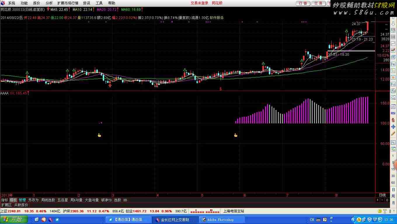 优化‘超级主升浪’副图指标,完全公开源码: K80:=3*(SMA((C-LLV(L,80))/(HHV(H,80)-LLV(L,80))*100,5,1)); D120:=2*(SMA(SMA((C-LLV(L,120))/(HHV(H,120)-LLV(L,120))*100,100,1),25,1)); XX:EMA(K80-D120,5),NODRAW,COLOR0000FF; ZZ:=IF(XX>=100 AND XX>REF(XX,1),1,0); STICKLINE(XX>=100,XX,100,1,0),COLORAAAAAA; STICKLINE(ZZ=1,XX,100,1,0),COLORFF00FF; DRAWICON(CROSS(XX,100),70,11);