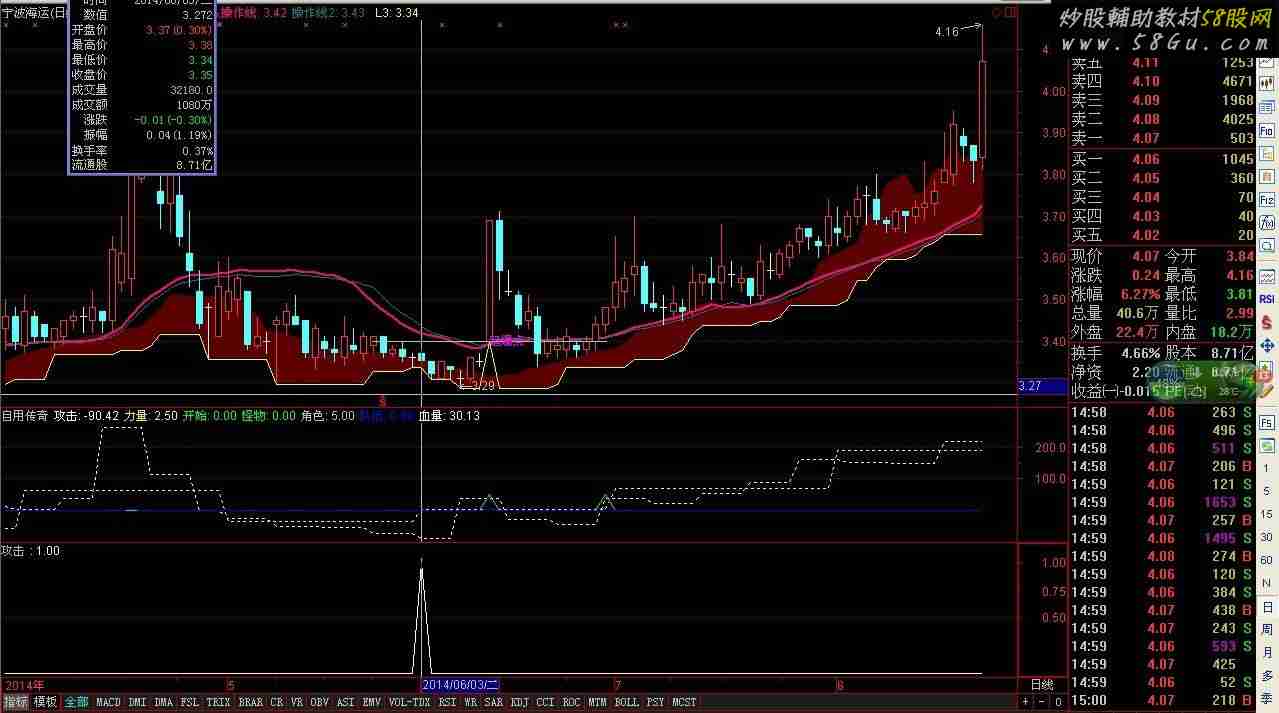 VAR11:=EMA(CLOSE,8); VAR22:=EMA(VAR11,20); VAR33:=CROSS(VAR11,VAR22); VAR44:=VAR11< EMA(CLOSE,120);{引用CCI看多空} 攻击:"CCI.CCI#WEEK",DOTLINE;{周CCI} 力量:"CCI.CCI#MONTH",DOTLINE;{月CCI} 开始:IF(VAR33 AND VAR44 AND 攻击>0,50,0),COLORGREEN;{黑马起步信号}{黑马阶梯线} N3:=BARSLAST(CROSS(C,MA(C,20))); N4:=BARSLAST(CROSS(MA(C,20),C)); 黑马阶梯:=IF(N3<N4,N3+1,0)NODRAW;{强势为收盘与预警价只差} 黄金价:=REF(CLOSE,1)*1.05 NODRAW; 骗我指数:=IF(((HIGH)/(CLOSE)<1.01) AND CLOSE>REF(CLOSE,1),0,1)NODRAW; QS:=((CLOSE/黄金价)-1)*1000 NODRAW; 强势:=IF(QS>0,QS,0)NODRAW;{风险价位} Y:=(HIGH+LOW)/2; RED:=SMA(Y,8,1); R2:=REF(RED,5); KD1:=IF(LOW=LLV(LOW,3),1,0); DL:=IF(REF(KD1,2)=1 AND REF(KD1,1)=0 AND KD1=0,REF(LOW,2),REF(LOW,2+(BARSLAST(REF(KD1,2)=1 AND REF(KD1,1)=0 AND KD1=0)))); 支撑:=IF(LOW<=R2,DL,REF(DL,BARSLAST(LOW<=R2))),LINETHICK0,COLOR0000FF; 支:=IF(BARSLAST(ABS(支撑-REF(支撑,1)))<(BARSLAST(CLOSE<支撑 AND REF(CLOSE,1)>REF(支撑,1))),支撑,DRAWNULL)NODRAW; 怪物:((L/支)-1)*100 NODRAW;{最低价到支撑价的幅度}{连涨天数} 角色:(BARSLASTCOUNT(C>O)+1)*5 NODRAW;{连涨天数}{超牛} S2:=SMA(C,3,1); S6:=SMA(C,5,1); DK:=2*(S2-S6)*15*4*1.5; 牛吧:=DK>0 AND DK>REF(DK,1); 黑马:=强势>0 AND 骗我指数=0 AND 牛吧>0.1 AND 黑马阶梯>0; N8:=BARSLAST(黑马=0); 队伍:IF(N8>0,N8,0);{连续搏击信号}{智能计算饱和和买卖差} VAR1:=VOL/((HIGH-LOW)*2-ABS(CLOSE-OPEN)); 主买:=IF(CLOSE>OPEN,VAR1*(HIGH-LOW),IF(CLOSE<OPEN,VAR1*((HIGH-OPEN)+(CLOSE-LOW)),VOL/2)),COLORRED,NODRAW; 主卖:=IF(CLOSE>OPEN,0-VAR1*((HIGH-CLOSE)+(OPEN-LOW)),IF(CLOSE<OPEN,0-VAR1*(HIGH-LOW),0-VOL/2)),COLOR00FF00,NODRAW; 买卖差:=主买+主卖,NODRAW,COLORFF0099; SAT:=(AMOUNT/C)/(HHV(AMOUNT,20)/HHV(C,20)); 血量:IF(SAT>1,1,SAT)*100,NODRAW;{量饱和};