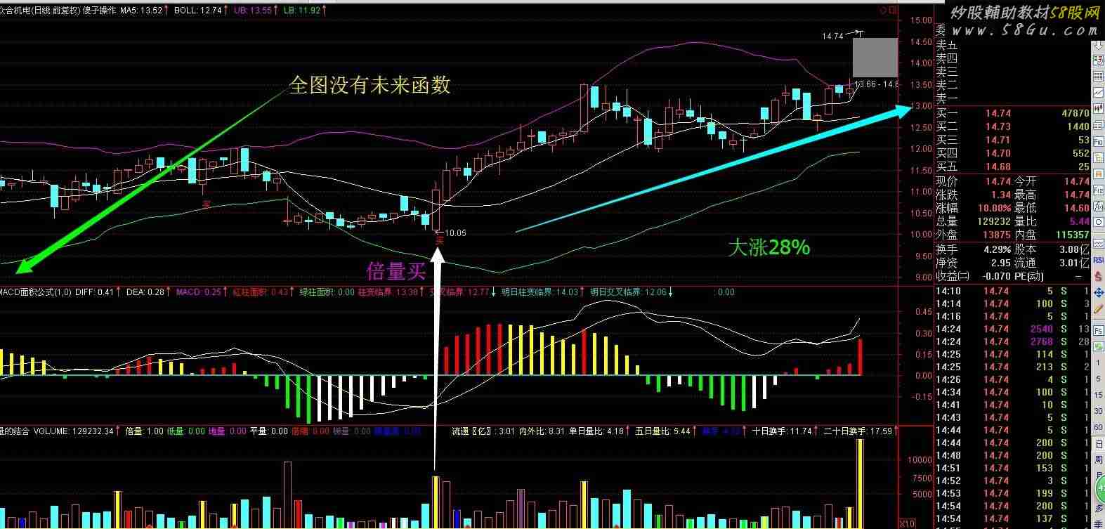 MA5:MA(C,5);N:=20; MIDA:=MA(C,N); ART1:=POW((C-MIDA),2); ART2:=MA(ART1,N); ART3:=SQRT(ART2); UPPERA:=MIDA+2*ART3; LOWERA:=MIDA-2*ART3; BOLL:REF(MIDA,1); UB:REF(UPPERA,1); LB:REF(LOWERA,1);XG1:=V/REF(V,1)>=2 AND CROSS(C,BOLL);XG2:=UB/H<1.005 AND C<MA(C,5);DRAWTEXT(XG1,L*0.98,'买'),COLORRED;DRAWTEXT(XG2,H*1.02,'卖'),COLORGREEN; |